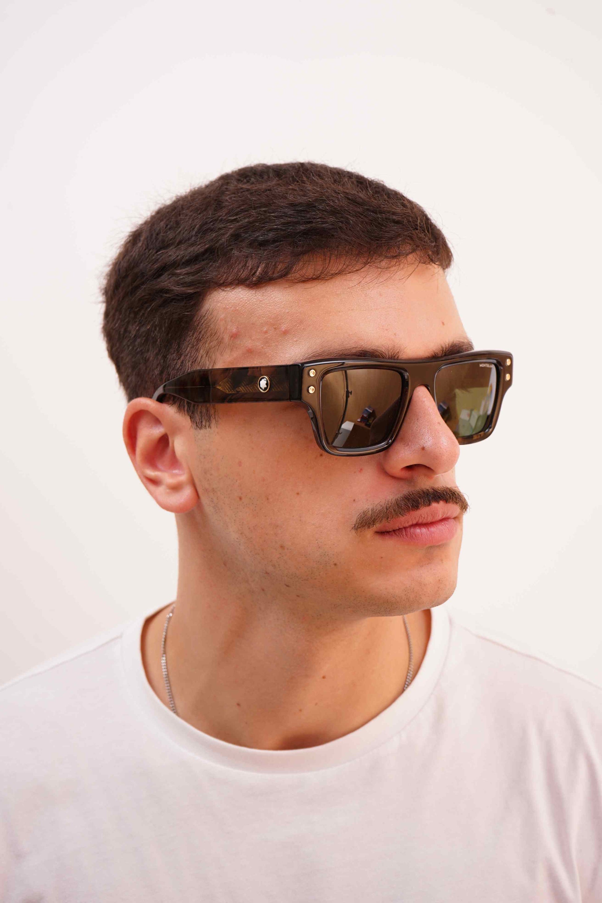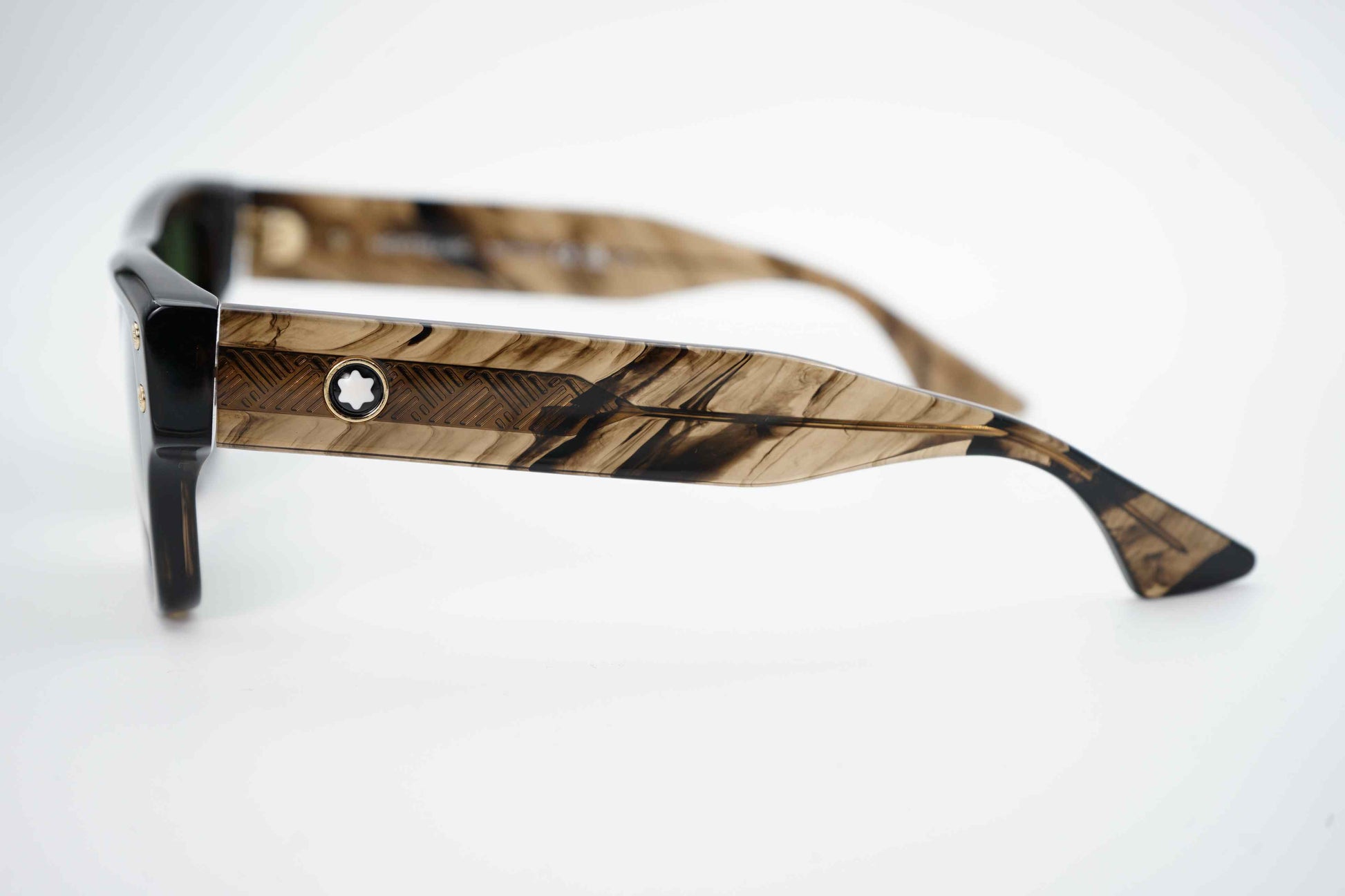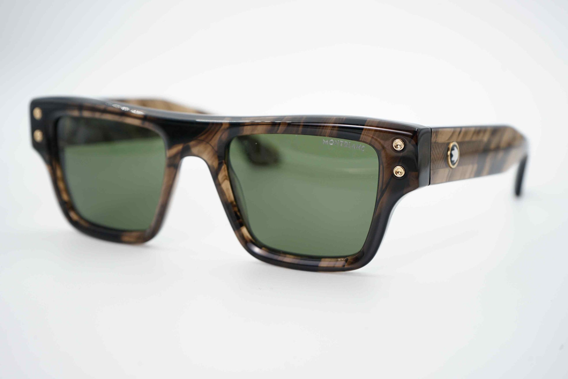 The Montblanc 0253S 005 sunglasses feature an acetate frame with an exclusive wood grain pattern, combining texture and sophistication in a bold design. The green lenses guarantee total UV protection and excellent visual comfort, while the gold details and the Montblanc emblem on the temples reinforce the premium character of the piece. A distinctive model that combines classic elegance and modern personality.