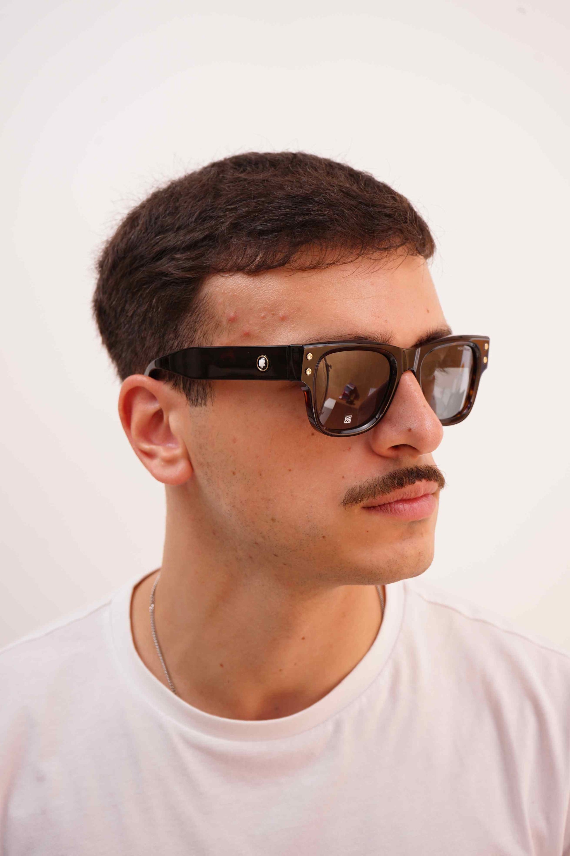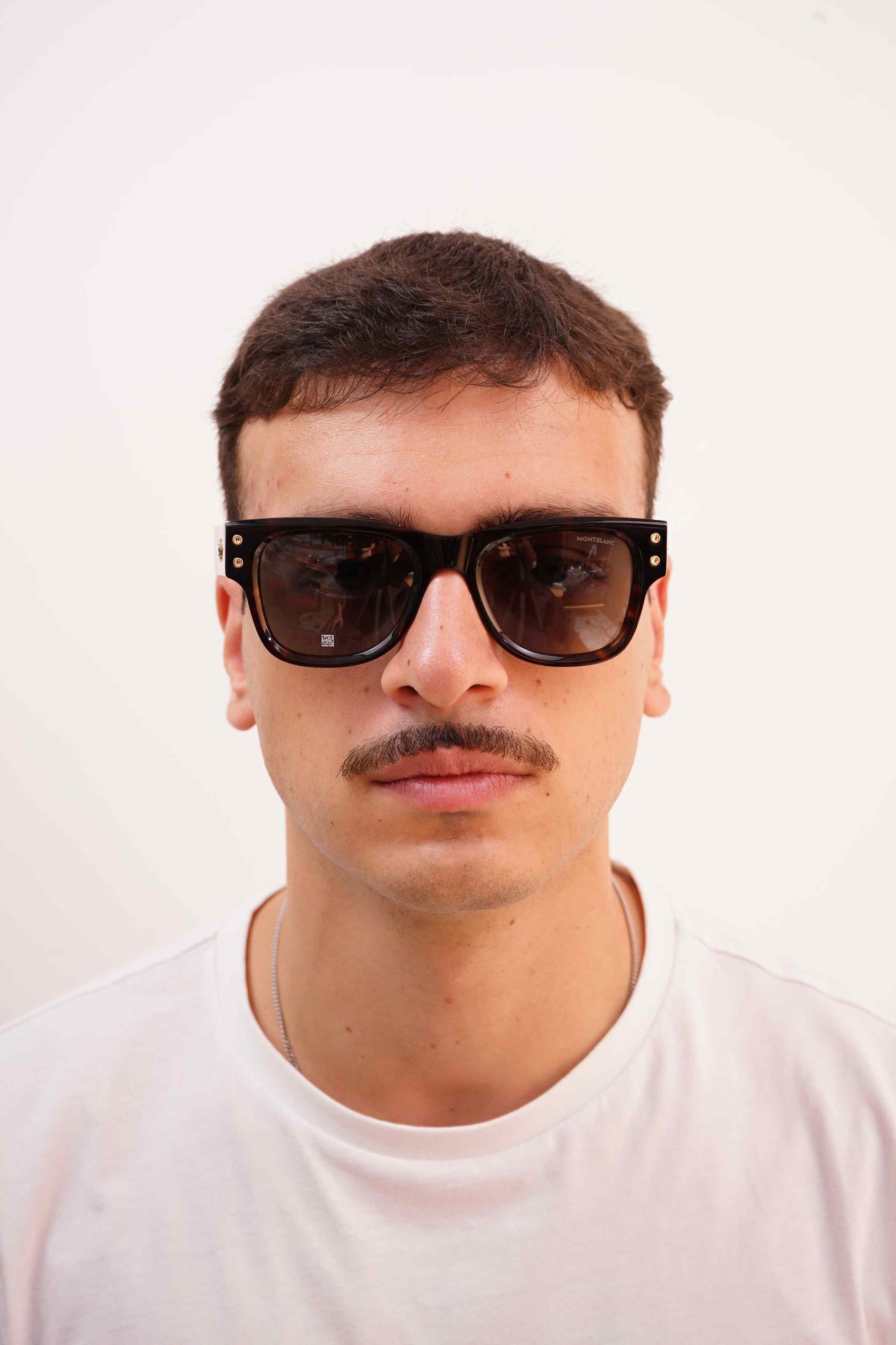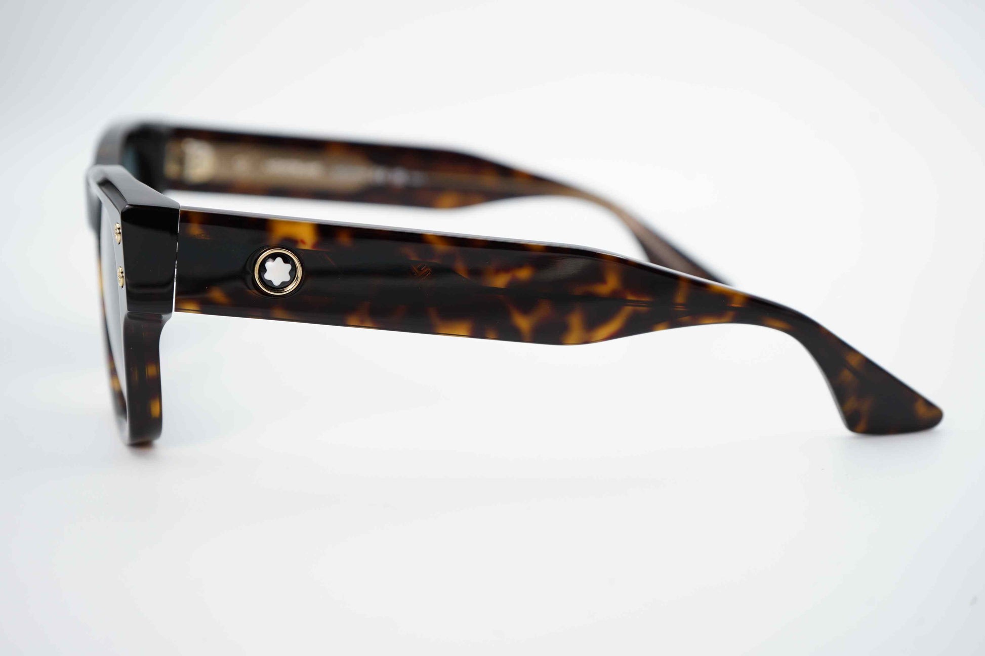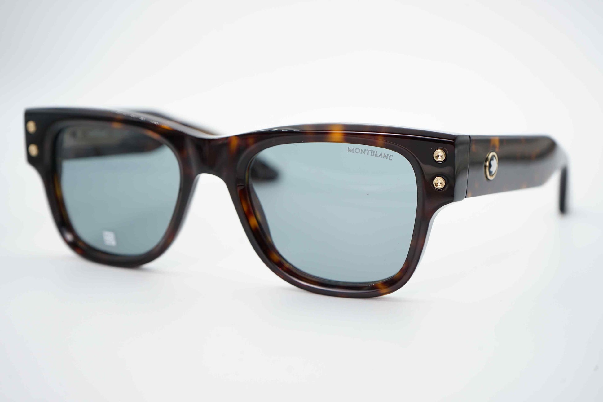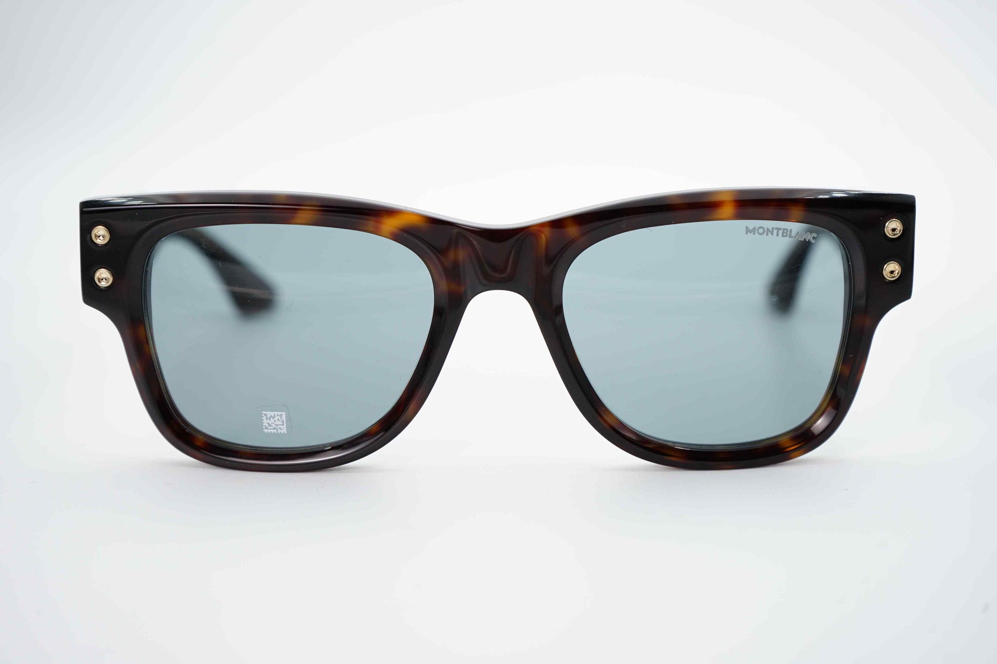 The Montblanc 0381S 002 sunglasses feature a polished tortoise acetate frame, combining vintage character and contemporary elegance. The blue-grey lenses ensure total UV protection and visual comfort in all light conditions. The gold details and the iconic Montblanc emblem on the temples highlight the prestige and sophistication of the brand.