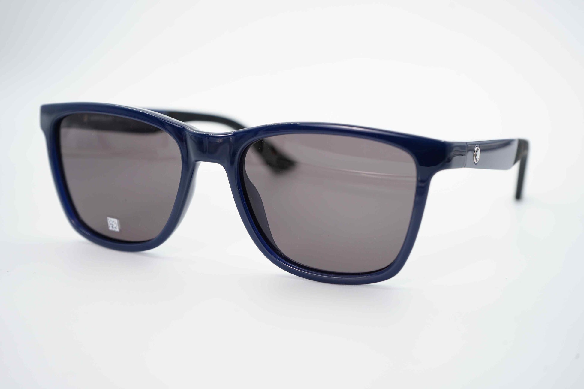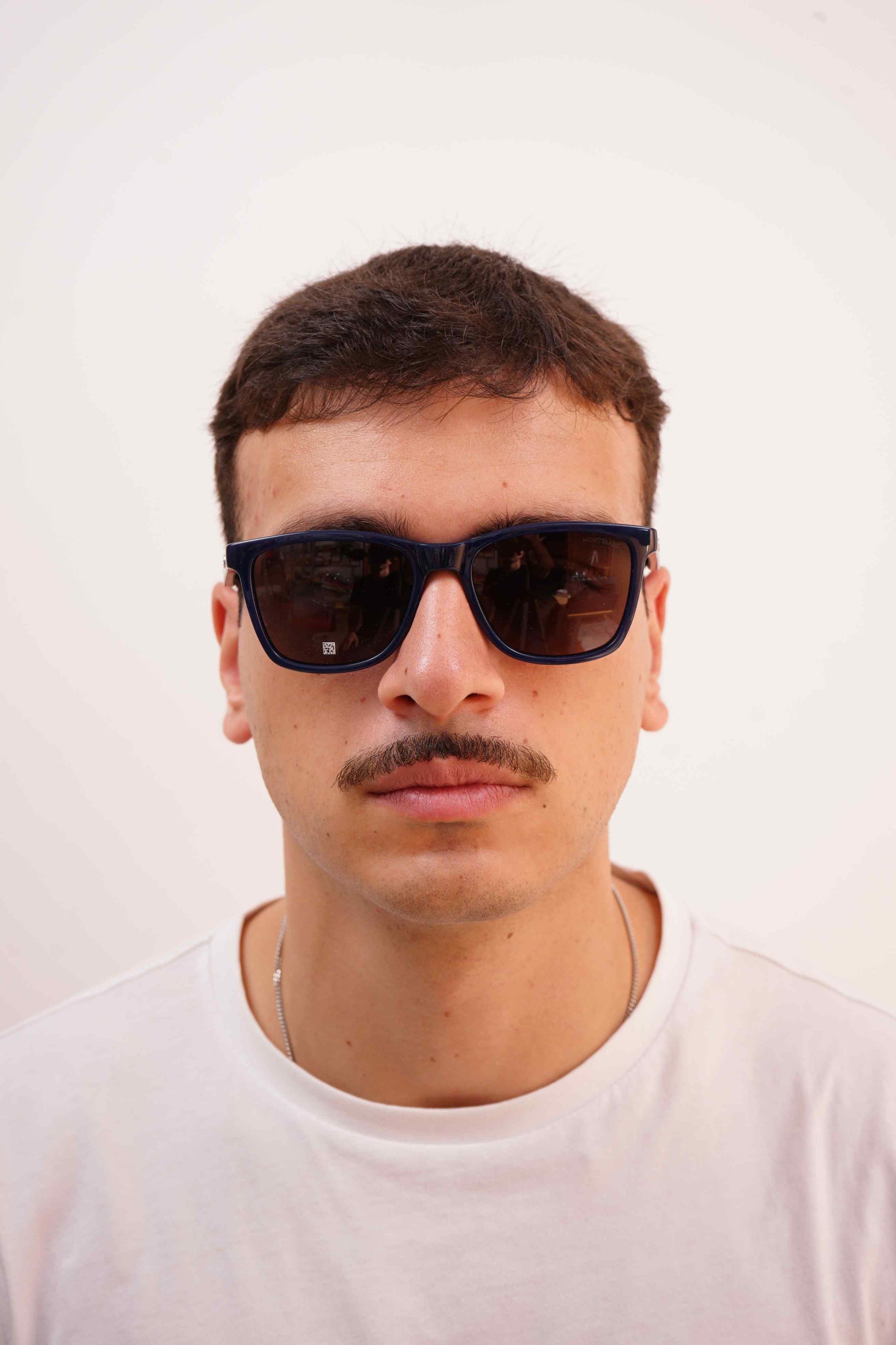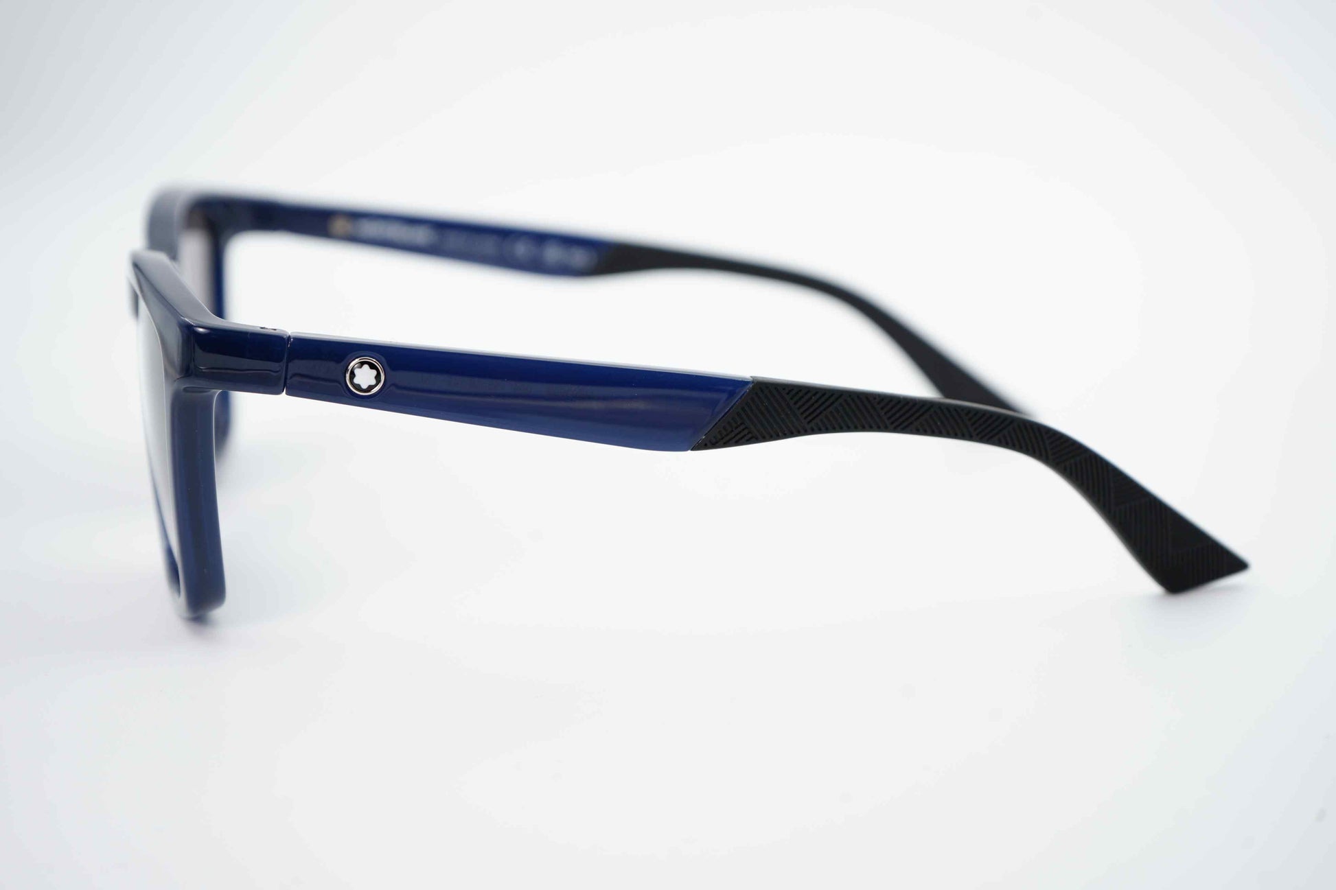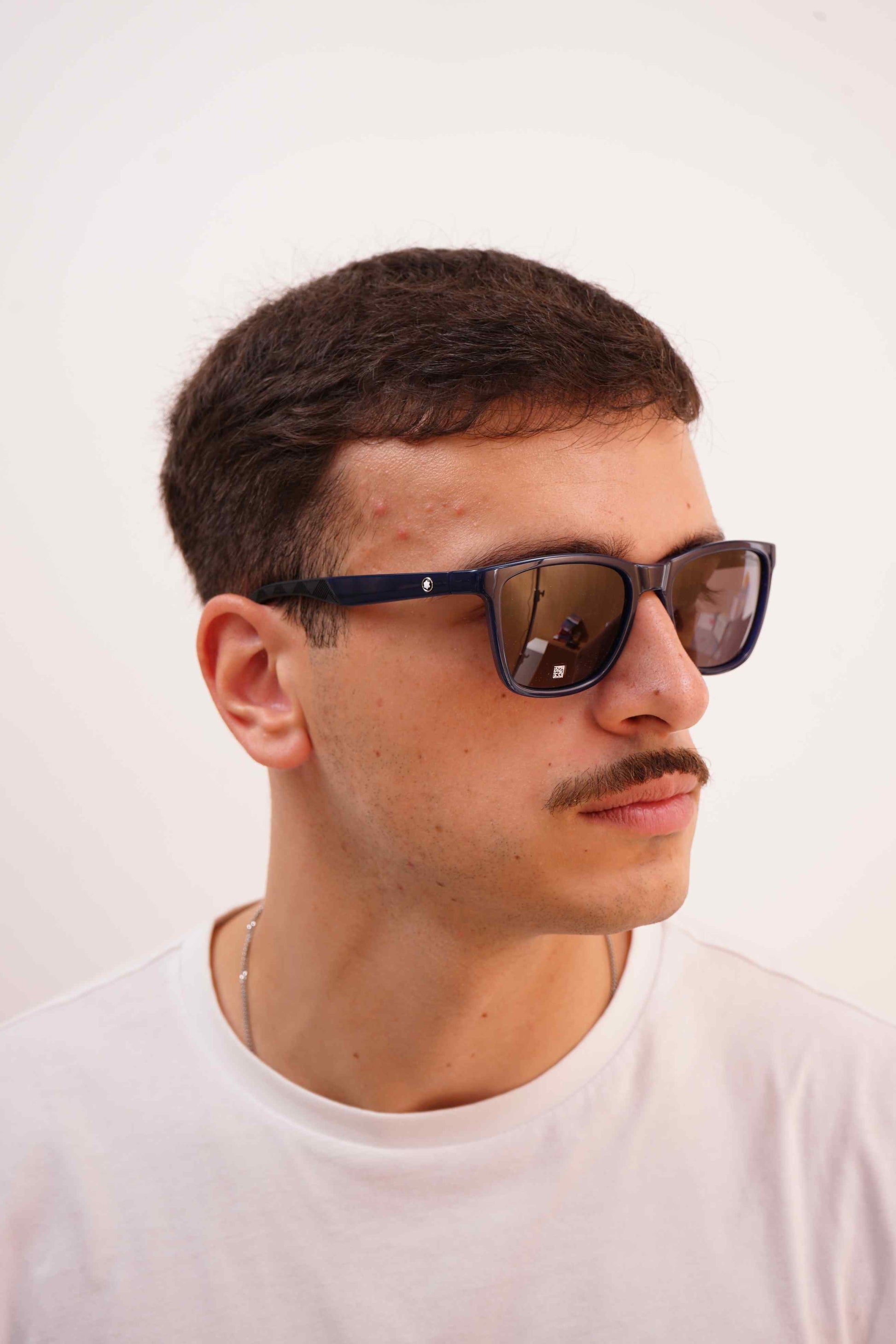 The Montblanc 0399S 004 sunglasses feature a dark blue acetate frame with a polished finish, offering a modern and distinctive look. The rectangular design easily adapts to different face shapes, ensuring comfort and elegance for everyday wear. The gray lenses provide total UV protection and natural vision, reducing glare. The Montblanc emblem on the temples reinforces the brand's characteristic sophistication.