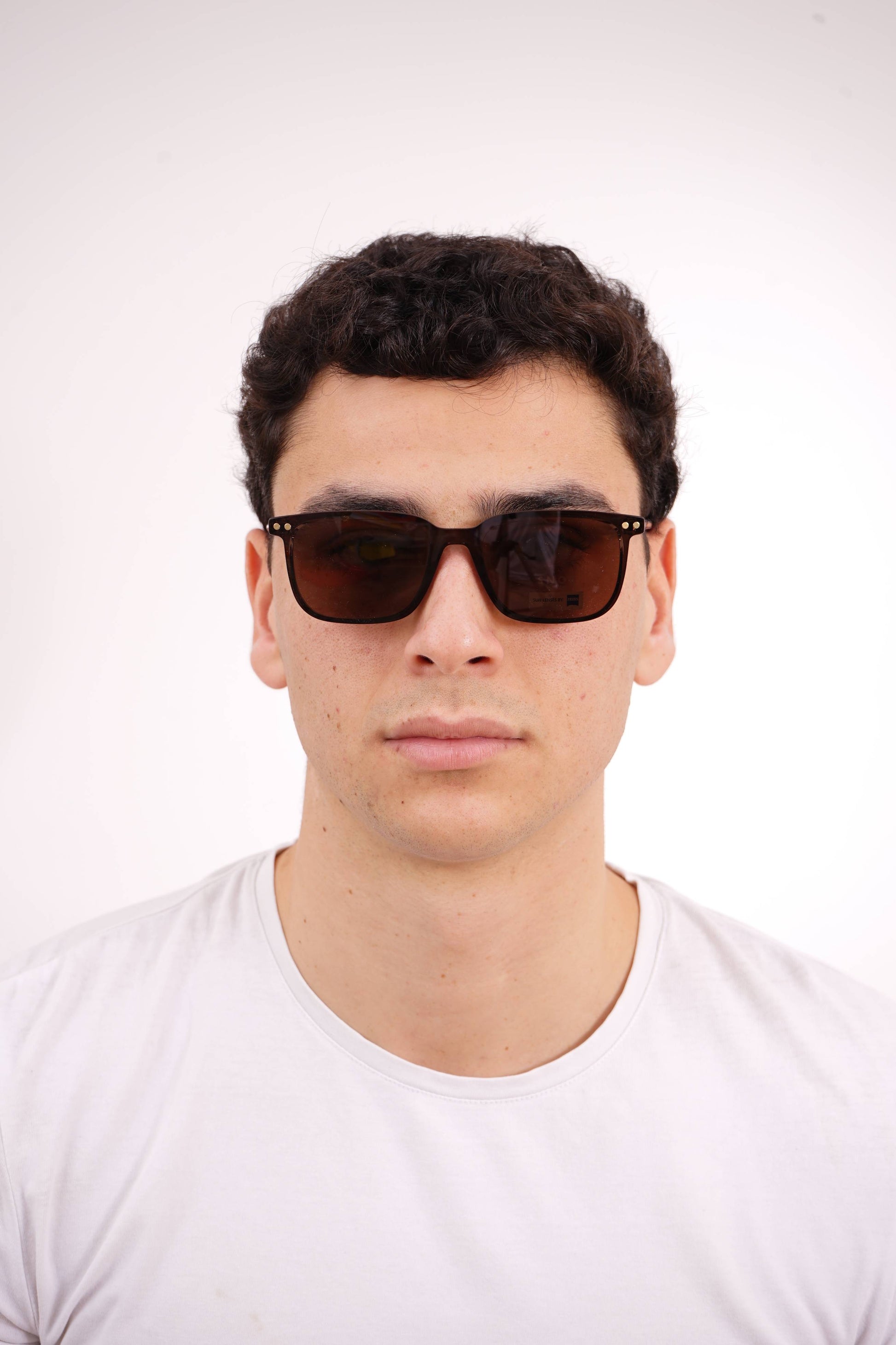 The magnetic clip-on sunglasses, fitted with brown Zeiss lenses, instantly transform the optical frame into a functional and stylish pair of sunglasses.