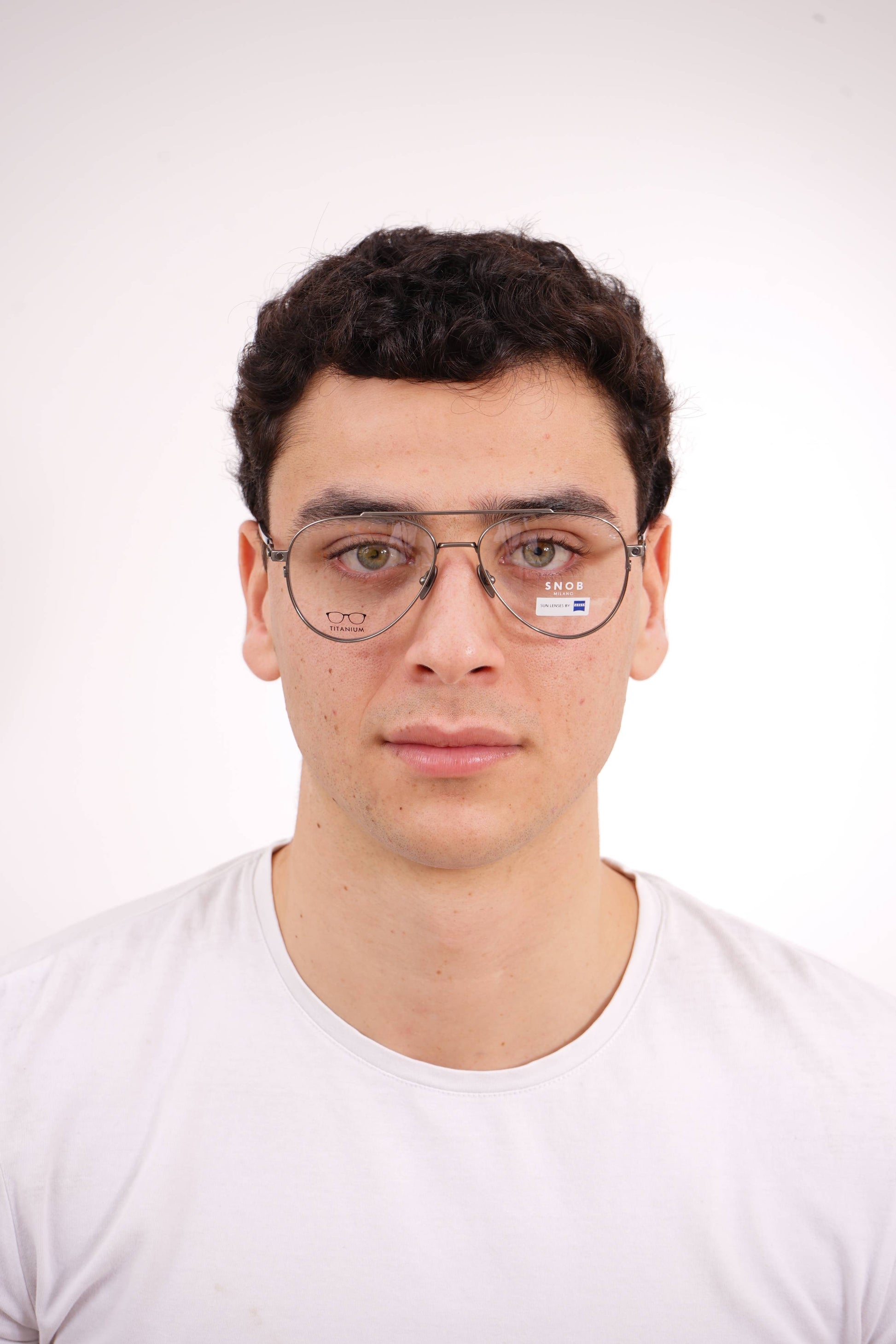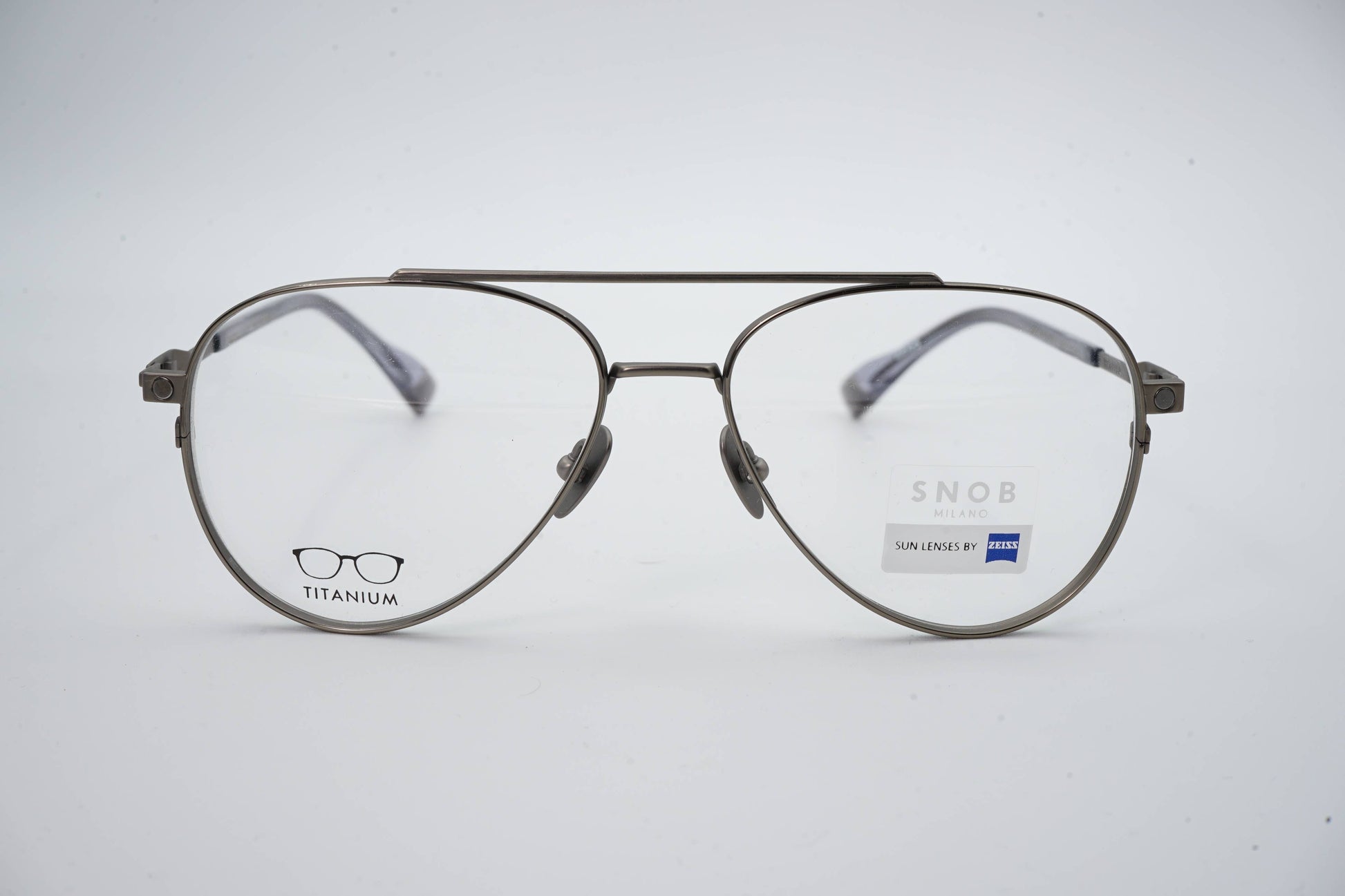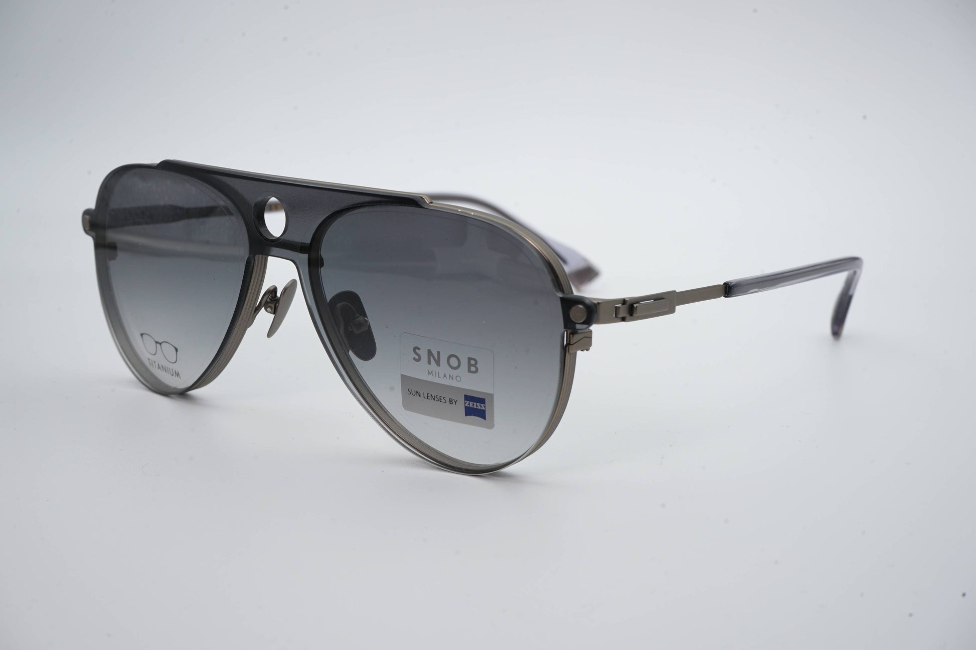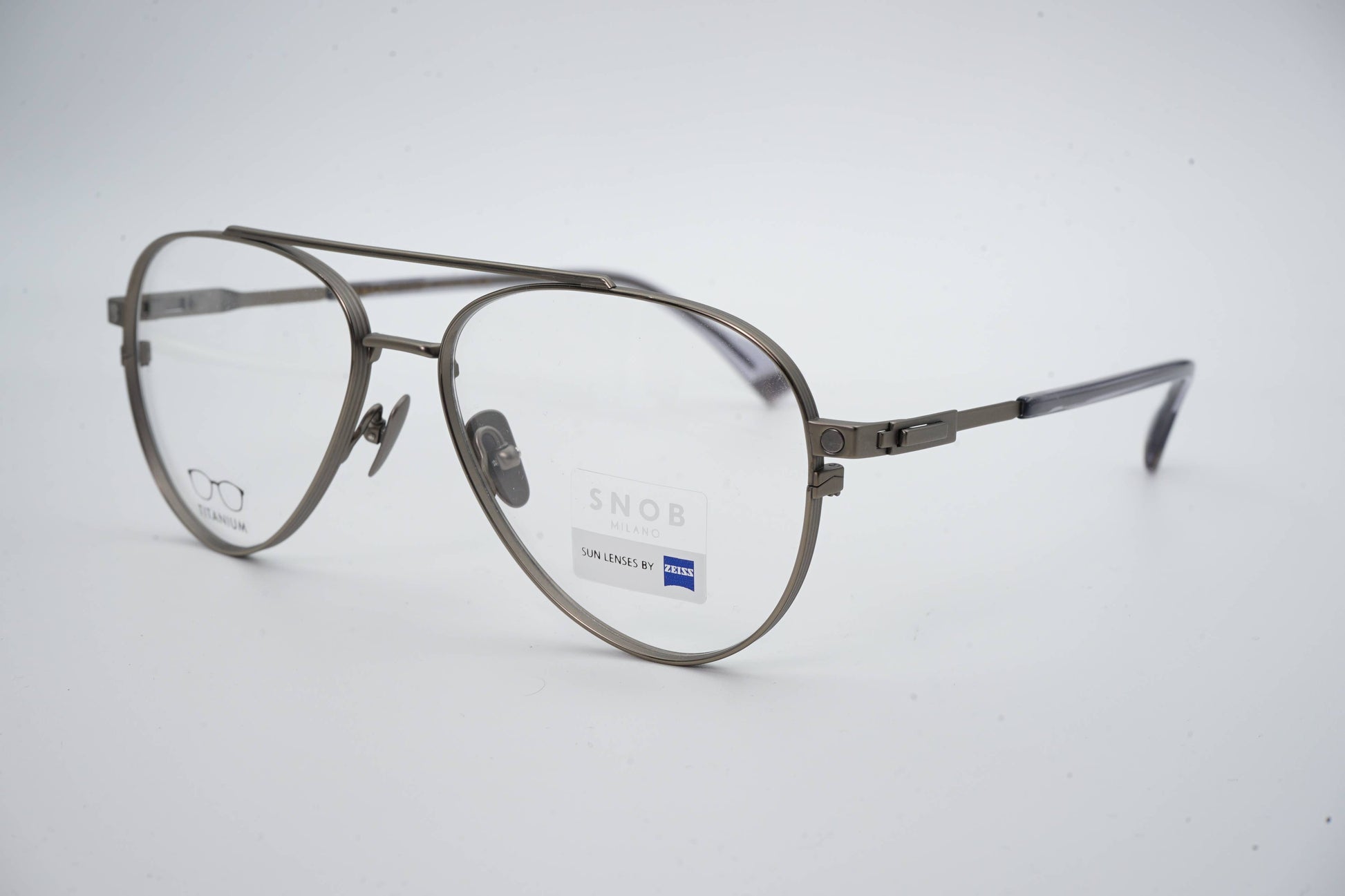 The Snob Milano Luke SNV230T C01 features a lightweight yet highly durable all-titanium construction, combining a refined aviator silhouette with a double top bar. The matte gray metallic finish reinforces the model's technical identity, while the tortoiseshell temple tips balance comfort and aesthetics. The magnetic clip-on sun visor, in a smoky gray tone with Zeiss lenses, fits precisely and transforms the optical frame into a pair of high-performance sunglasses, maintaining lightness and stability.