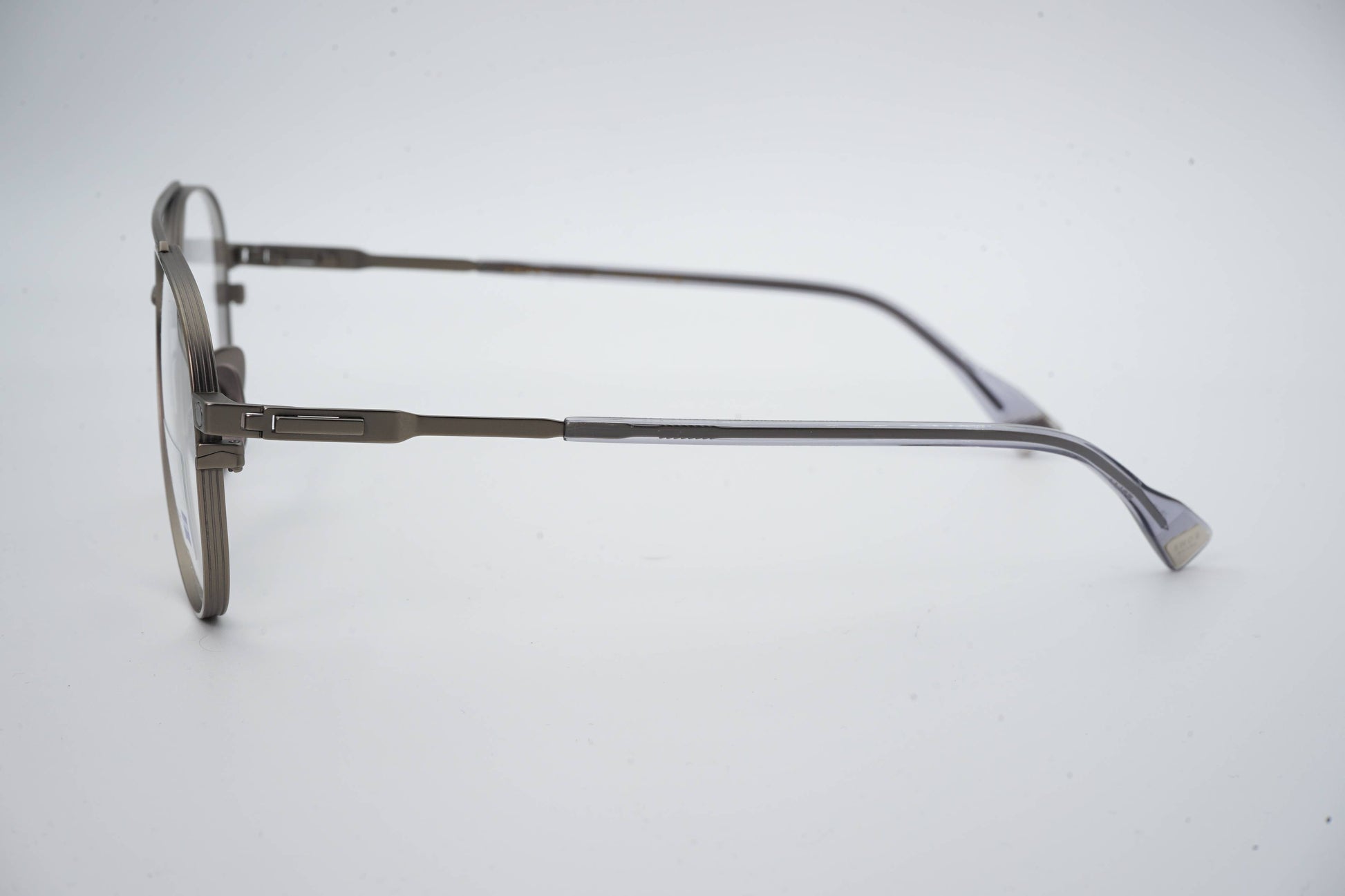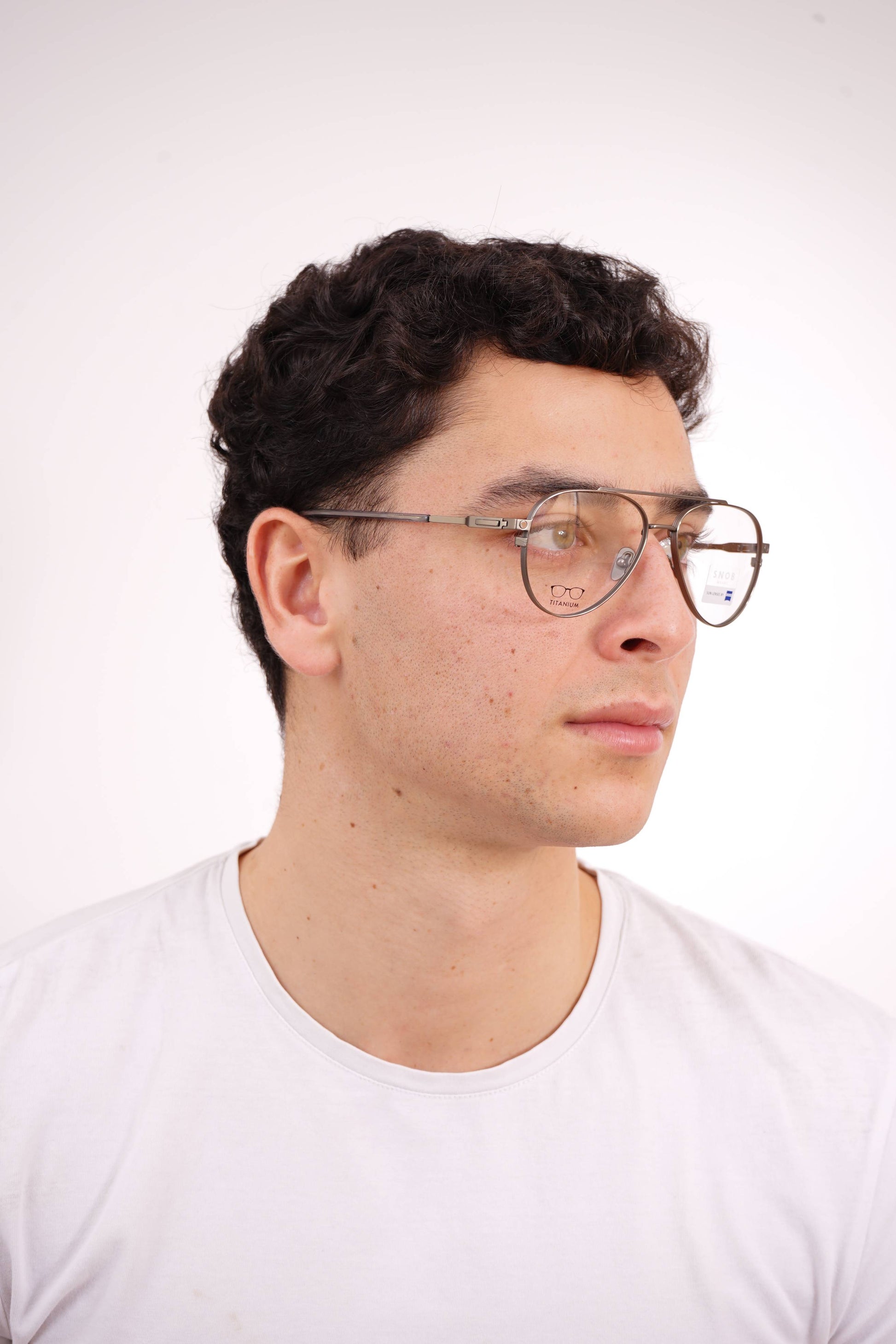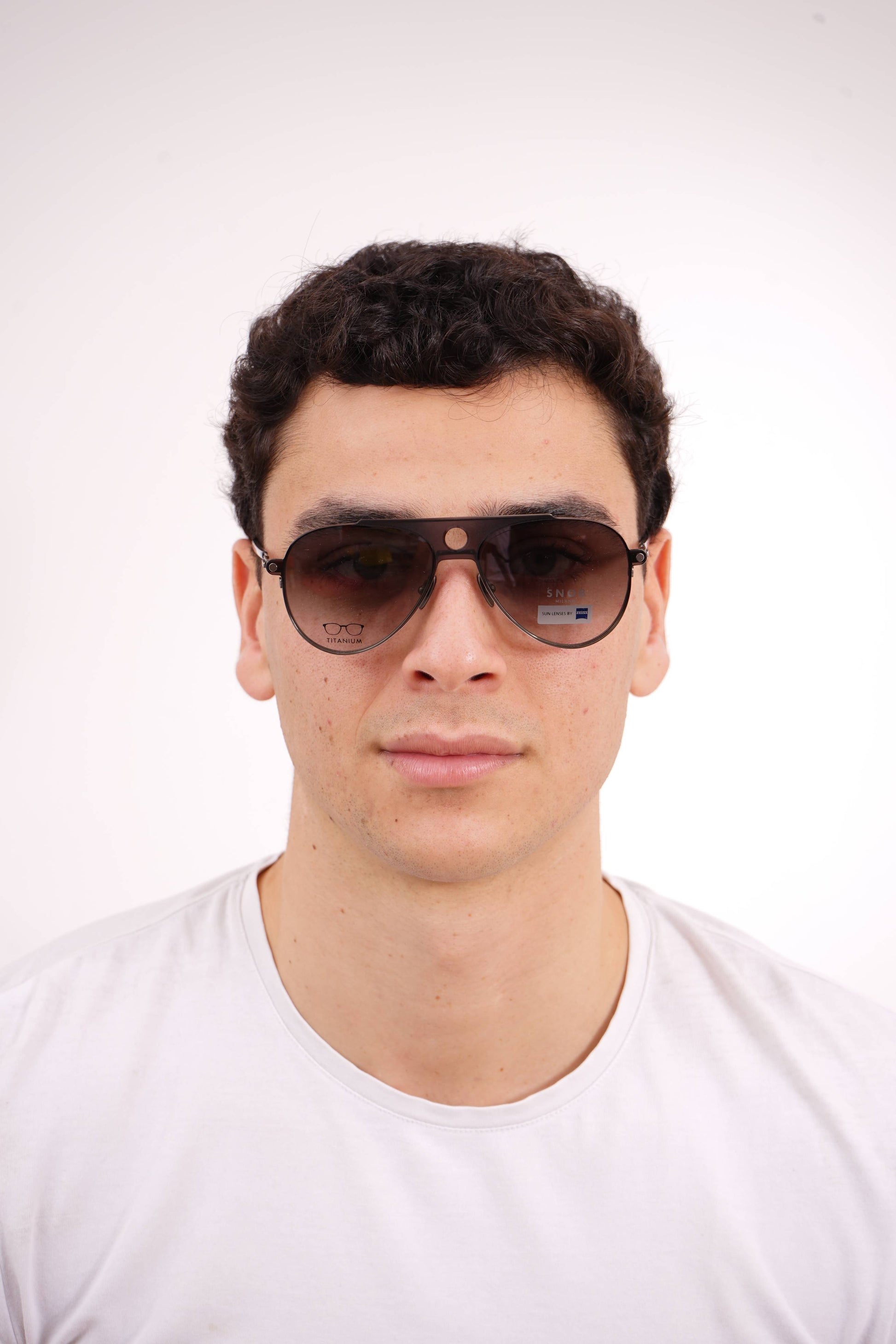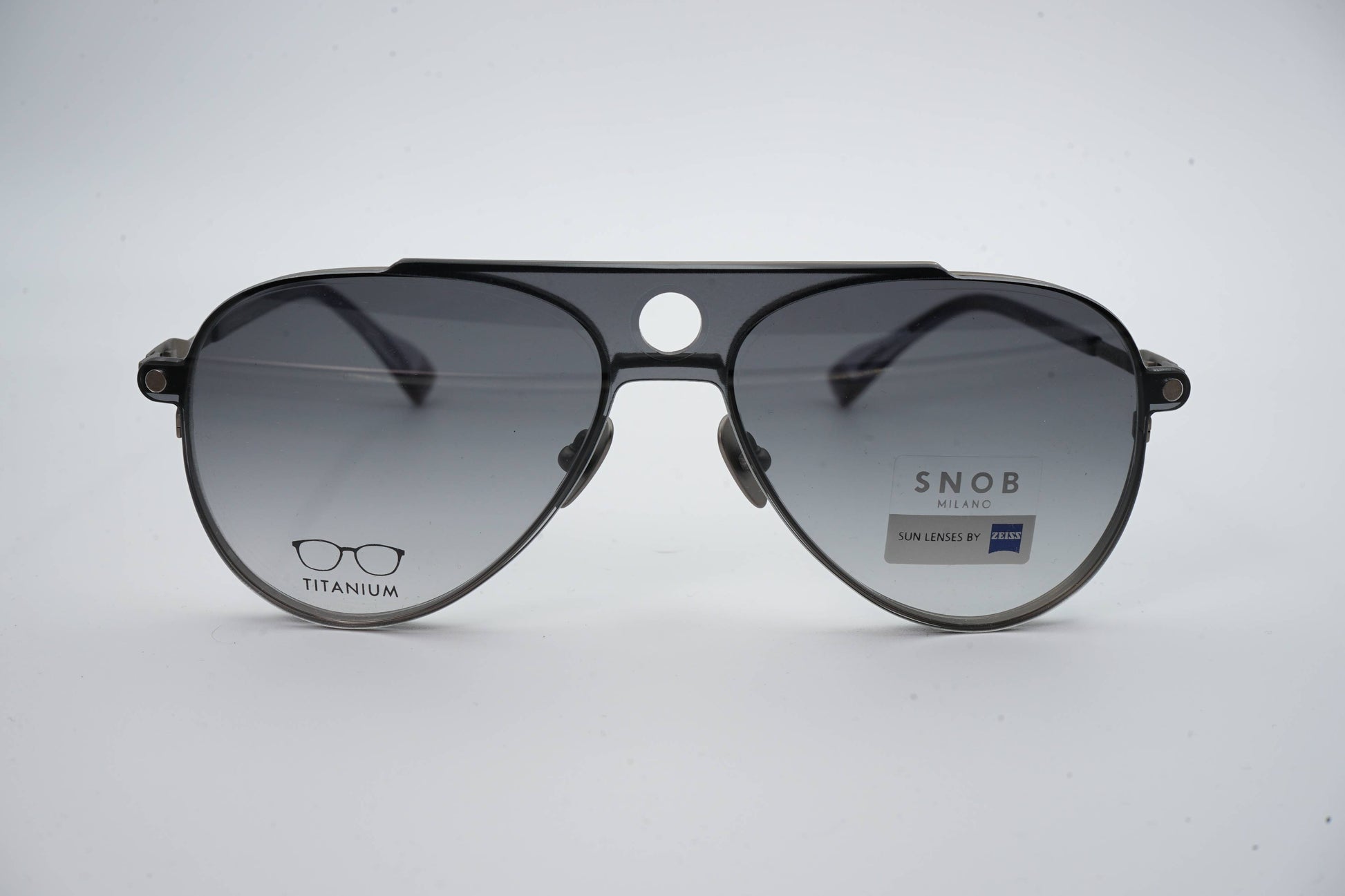 The Snob Milano Luke SNV230T C01 features a lightweight yet highly durable all-titanium construction, combining a refined aviator silhouette with a double top bar. The matte gray metallic finish reinforces the model's technical identity, while the tortoiseshell temple tips balance comfort and aesthetics. The magnetic clip-on sun visor, in a smoky gray tone with Zeiss lenses, fits precisely and transforms the optical frame into a pair of high-performance sunglasses, maintaining lightness and stability.