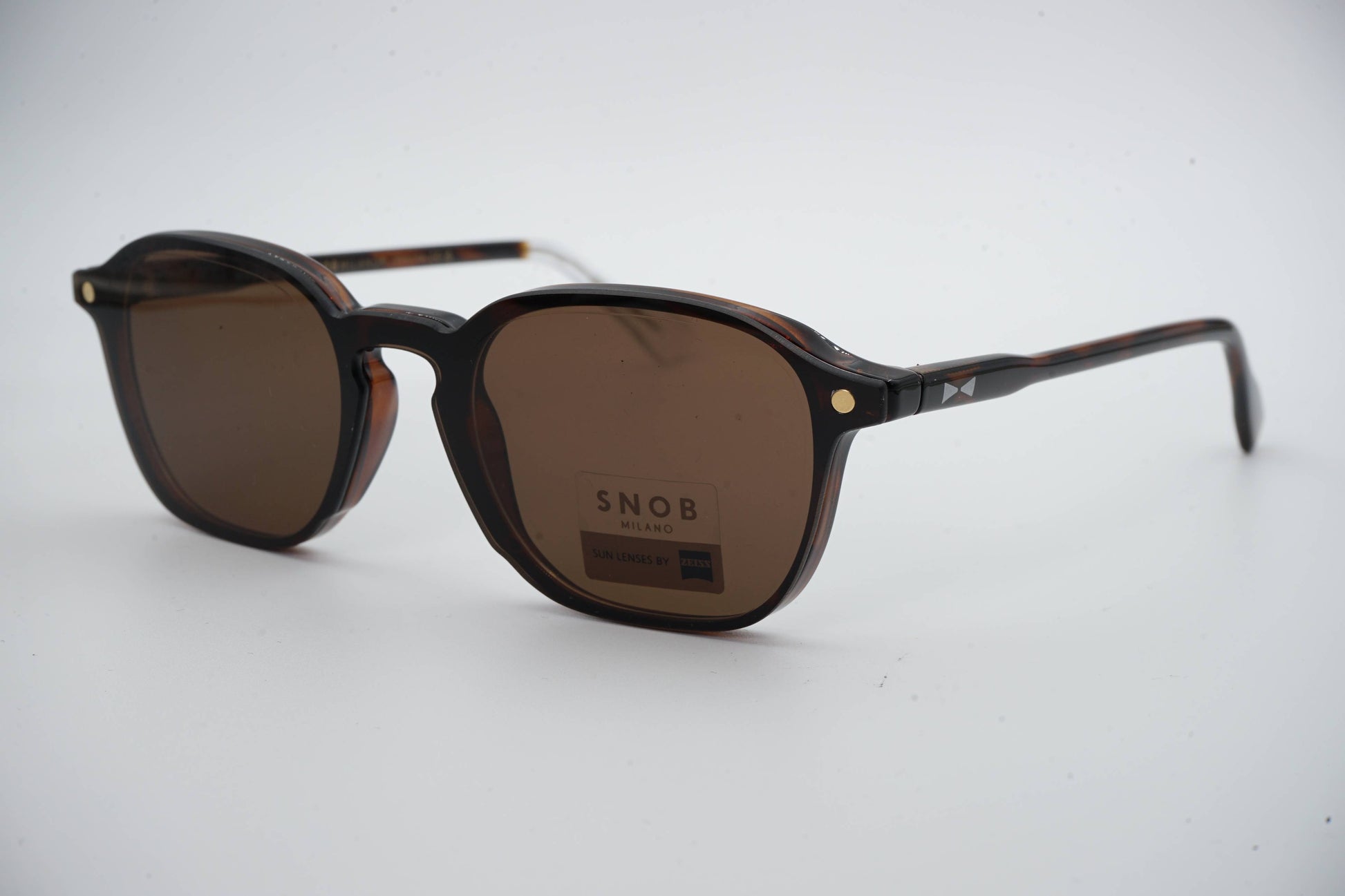 The Snob Milano Pagoda SNV243 C02 features a dark Havana acetate construction with balanced lines and a versatile design. The frame is lightweight, durable, and ideal for extended wear. The magnetic clip-on sun attachment instantly converts the optical frame into sunglasses with complete precision. Zeiss lenses guarantee high protection, optimized contrast, and superior visual performance.