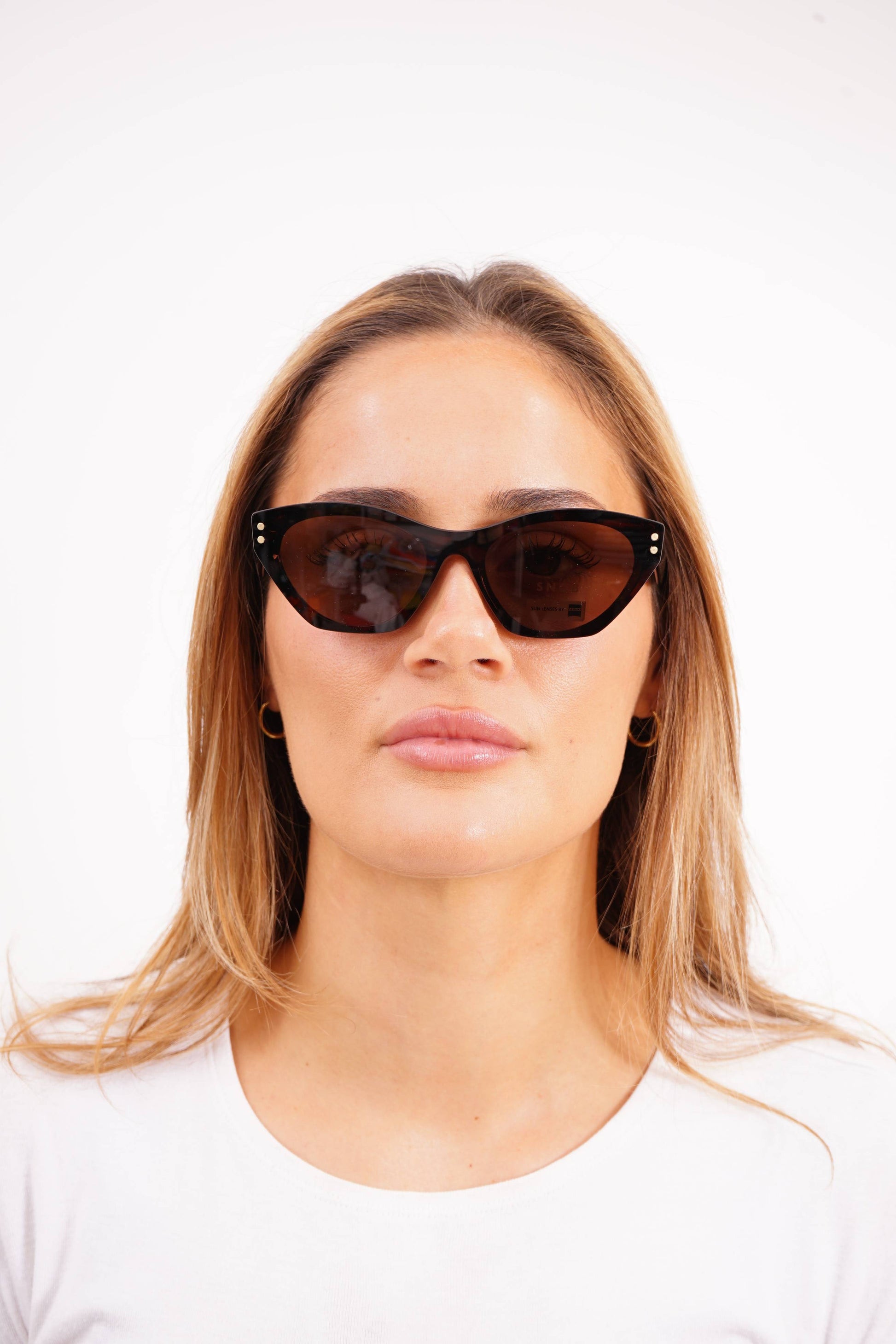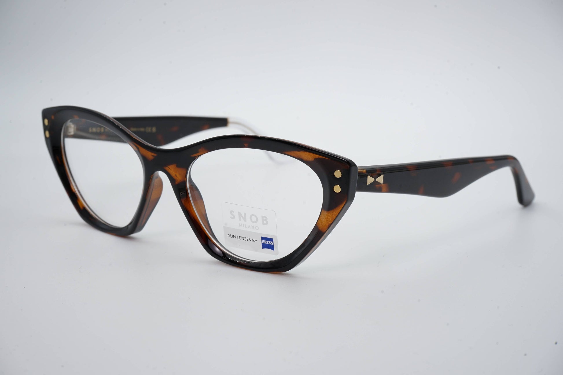 The Snob Milano Plastic SNV215 C02 features a striking and elegant cat-eye silhouette, crafted from warm-toned Havana acetate. The frame maintains the structured profile that characterizes the model, with double metal detailing on the front and an iconic geometric detail on the temple. The magnetic clip-on sunpiece, with brown Zeiss lenses, integrates precisely, transforming the optical frame into a pair of sunglasses with superior UV protection and high visual comfort.
