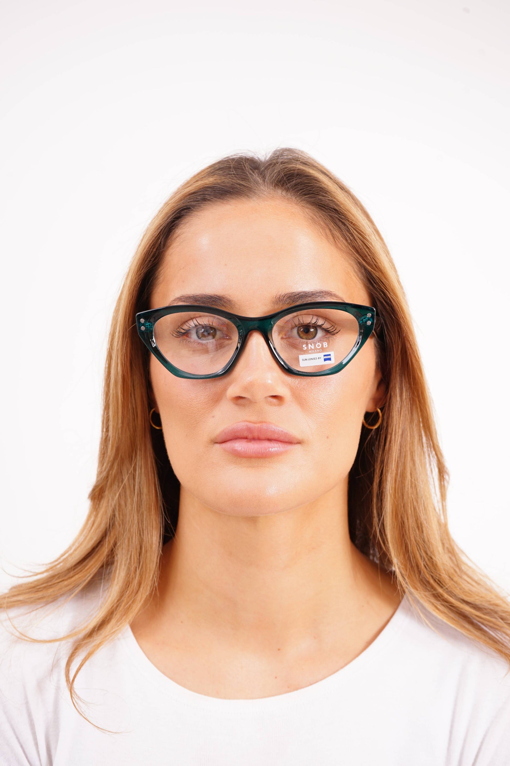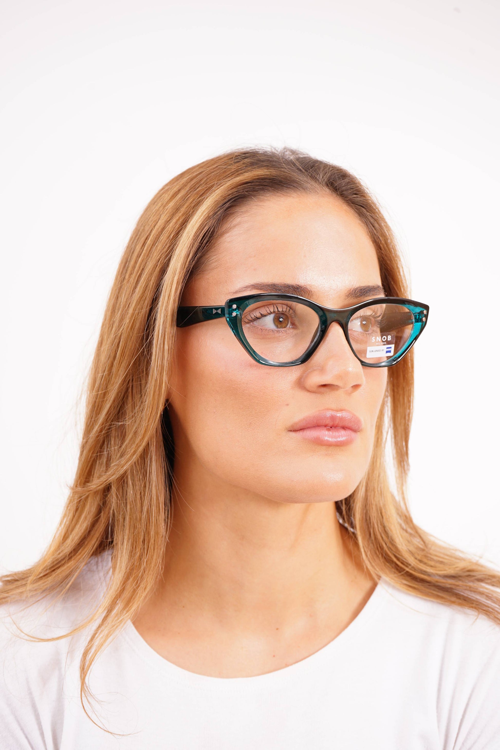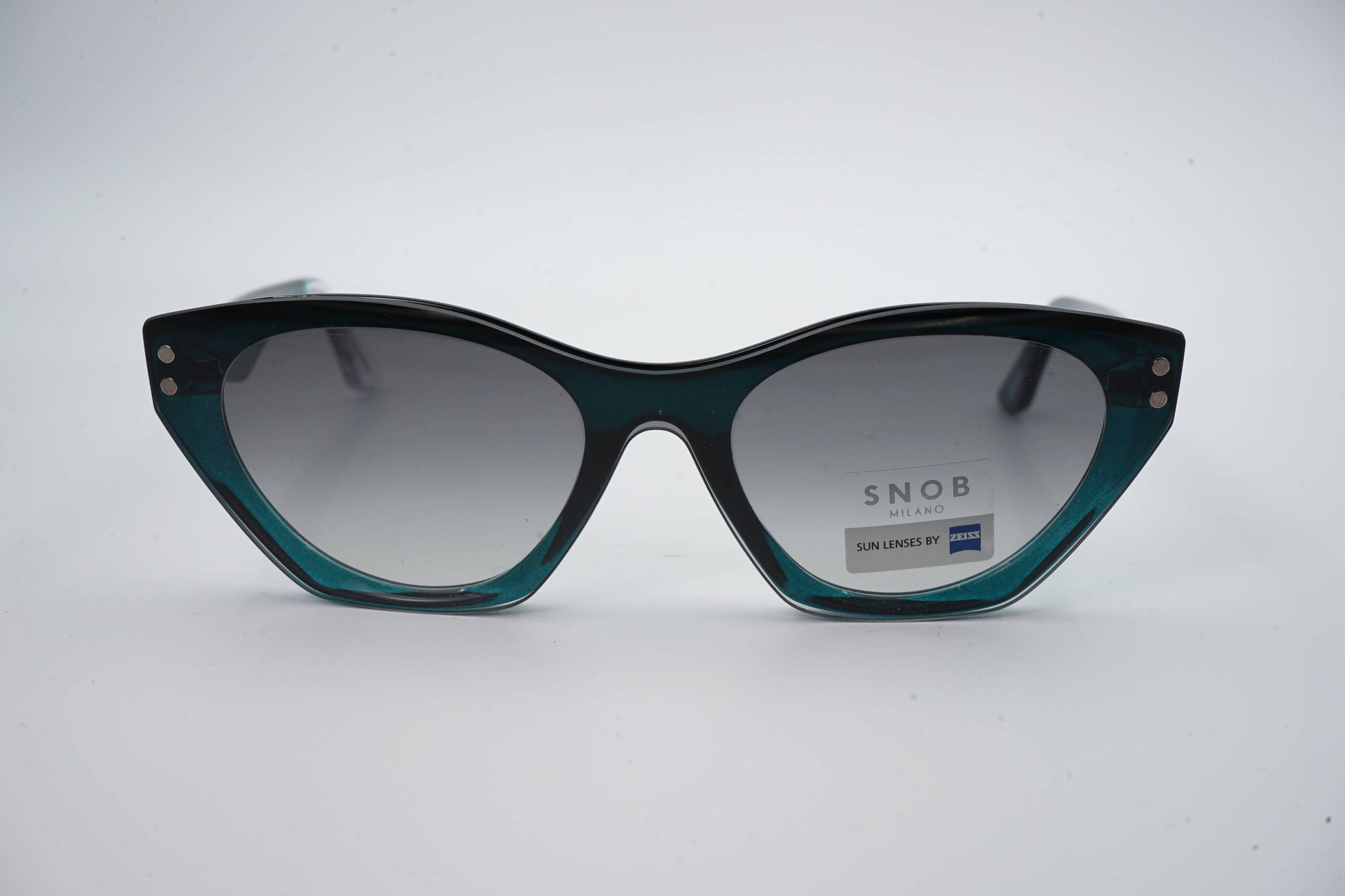 The Snob Milano Plastic SNV215 C05 stands out for its translucent petrol-green acetate, an uncommon finish on the market that reinforces exclusivity without losing its distinctive cat-eye silhouette. The frame maintains the line's aesthetic signature — raised tip, double metallic front dot, and geometric detail on the temples. The magnetic clip-on, equipped with Zeiss lenses in a gray gradient tint, transforms the model into a pair of high-performance sunglasses, guaranteeing UV protection and balanced contrast.