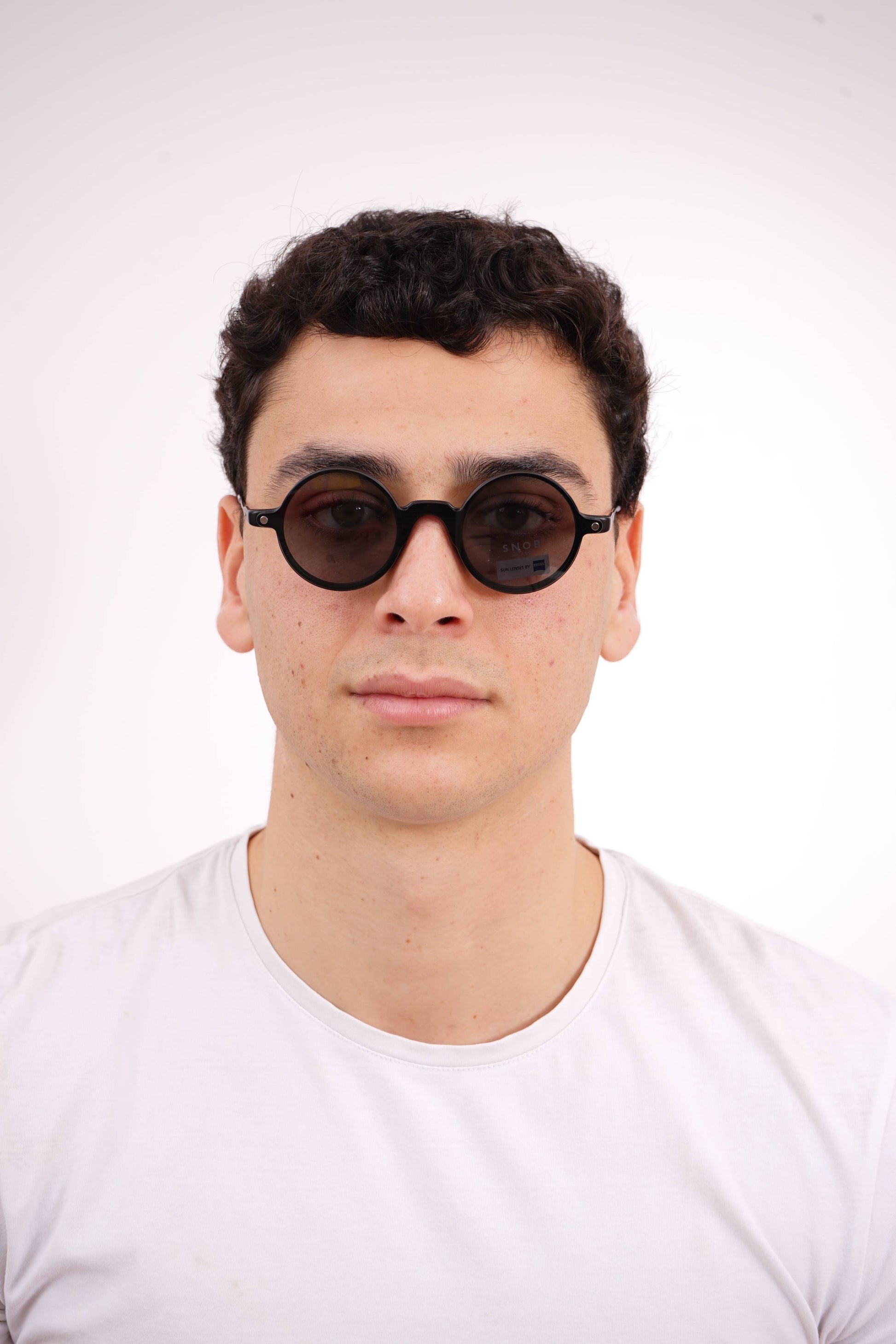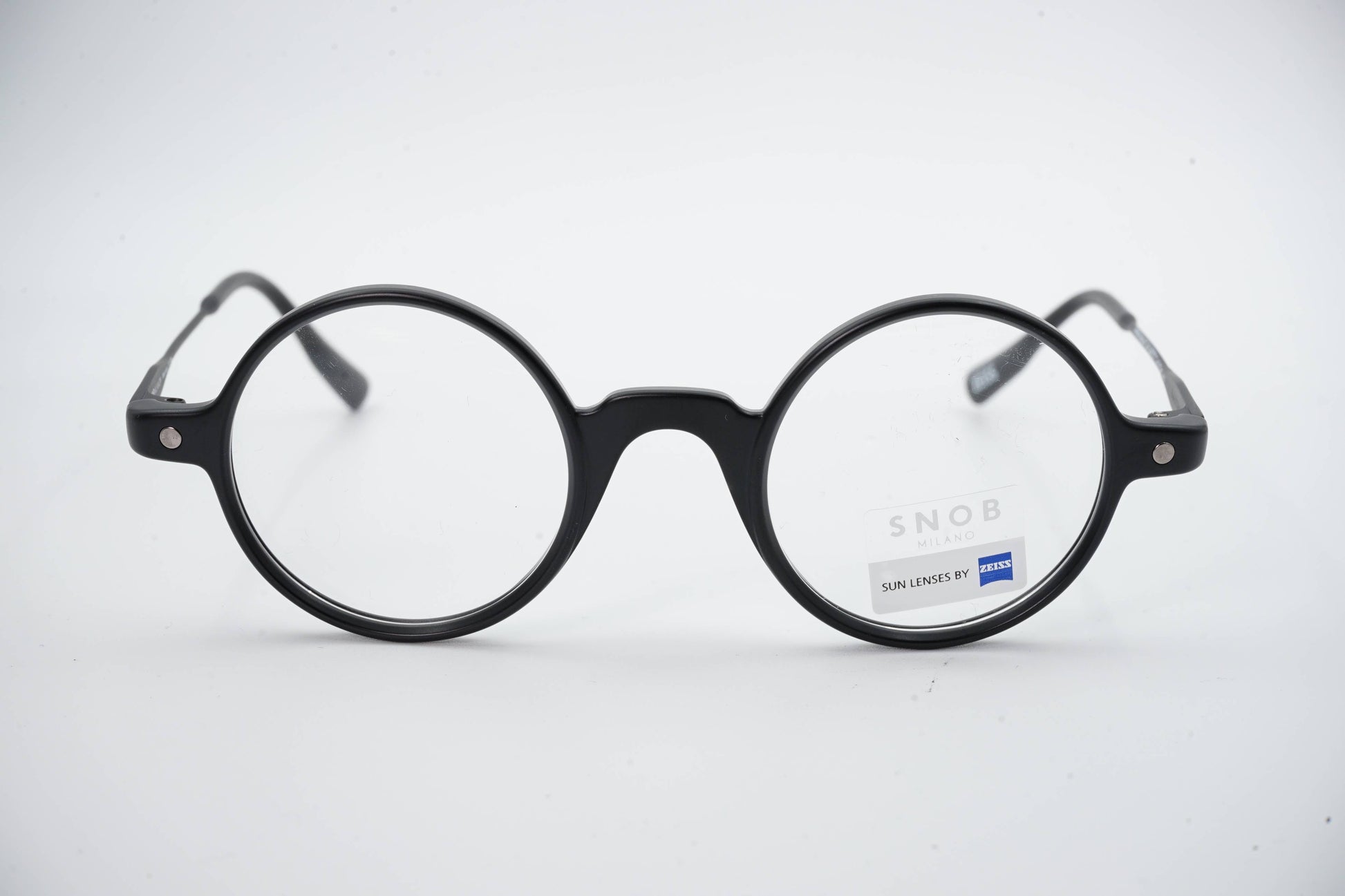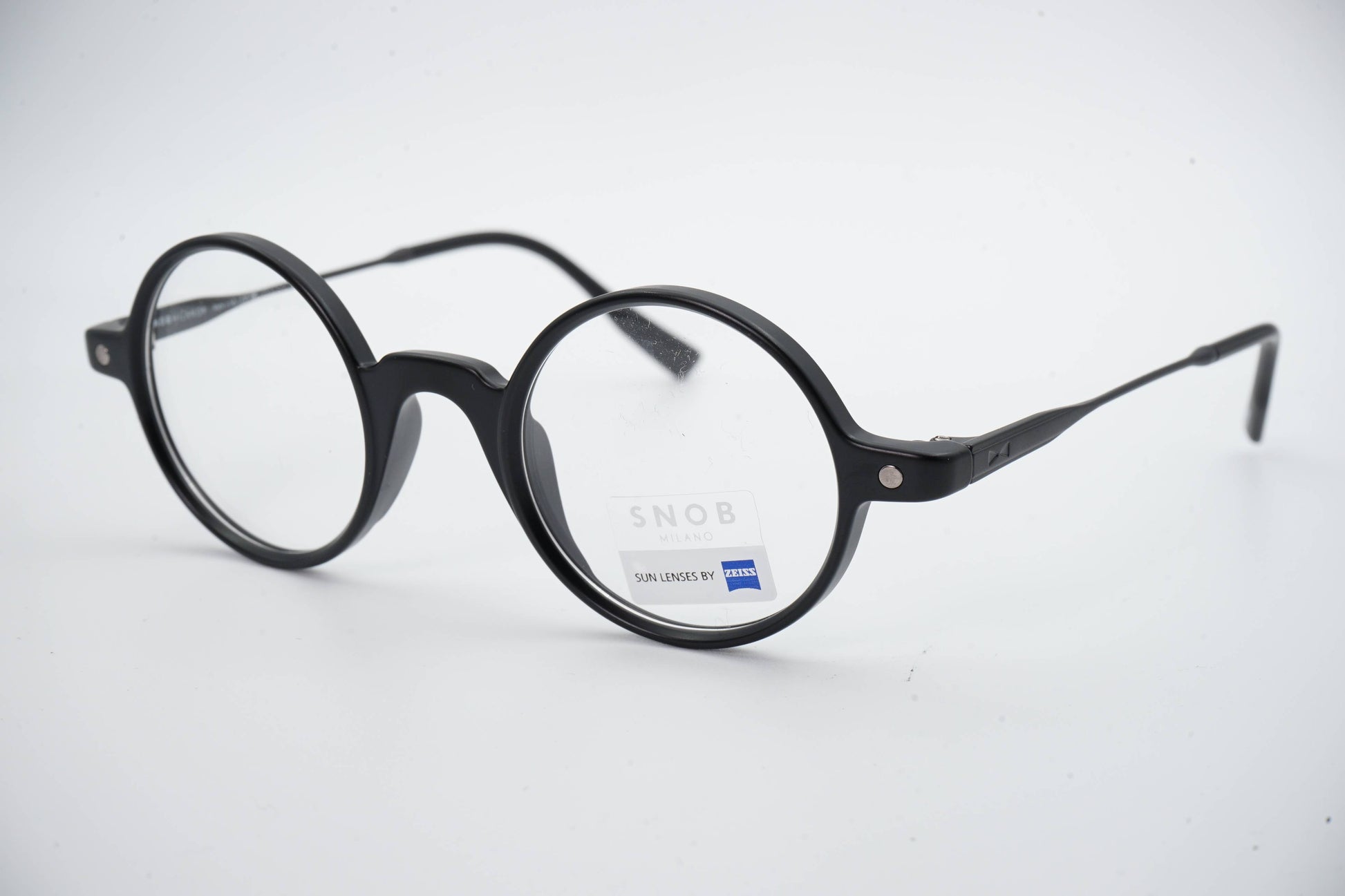 The Snob Milano Radical Biolux SNV180RT C01 features a classic round silhouette in solid black acetate, with clean lines and balanced proportions that ensure a discreet presence and versatility for everyday wear. The uniform finish reinforces a timeless look, suitable for different styles and contexts.