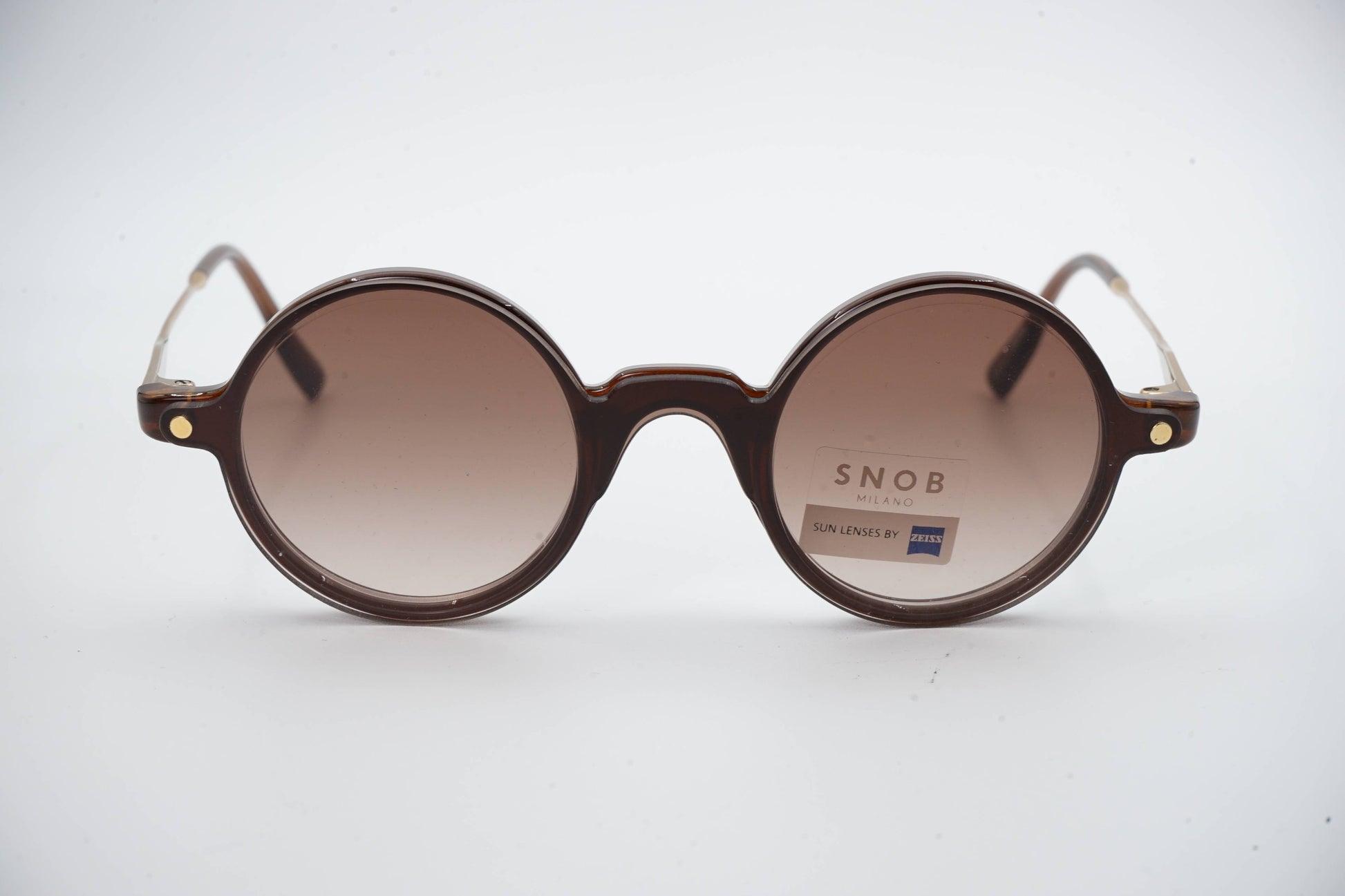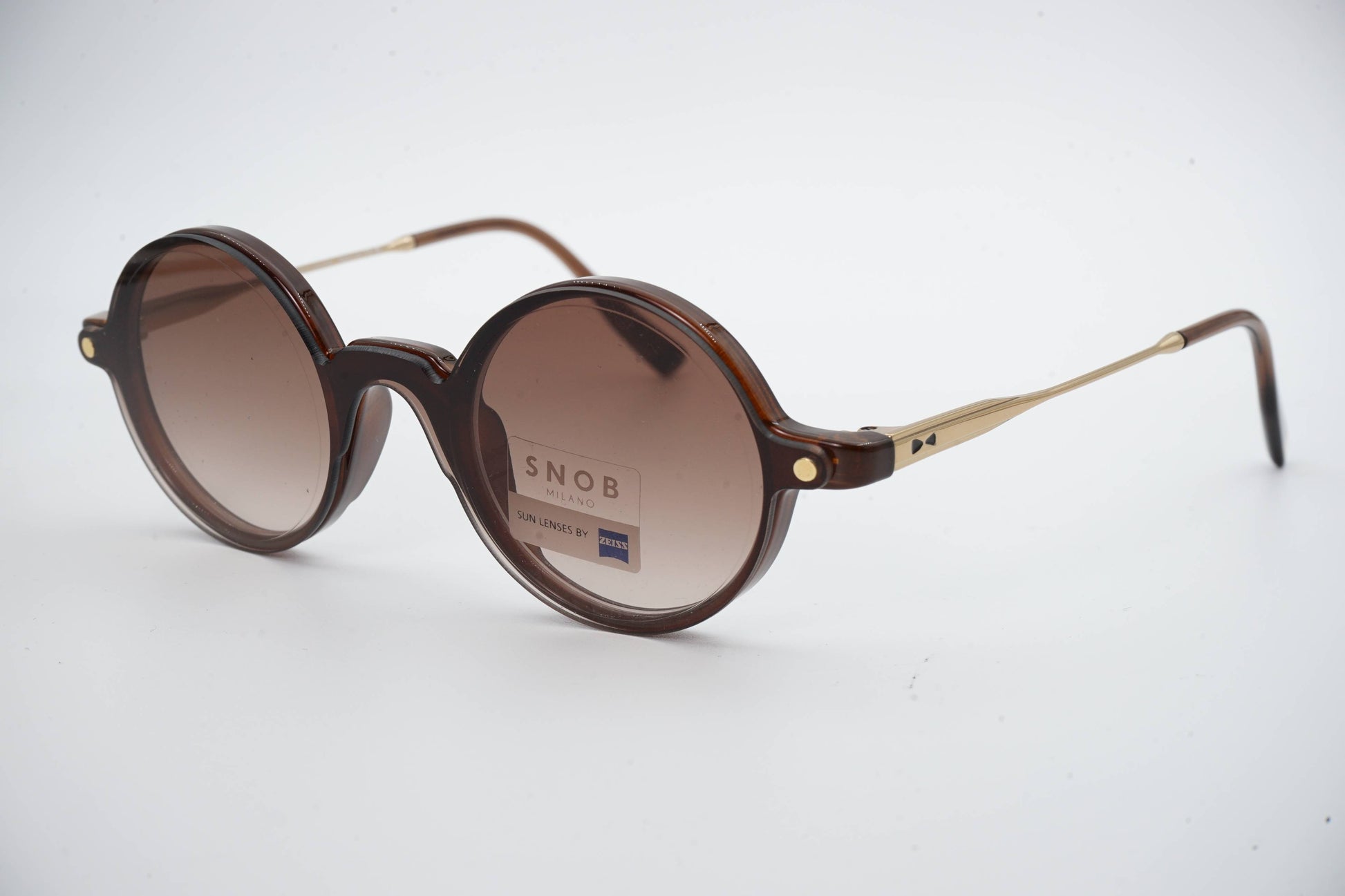The Snob Milano Radical BioLux SNV180RT C02 features a round, vintage-inspired aesthetic, combined with a translucent brown acetate front that conveys sophistication, visual lightness, and a contemporary identity. The thin metal temples reinforce the model's elegant character, ensuring stability, comfort, and a balanced fit for everyday wear.