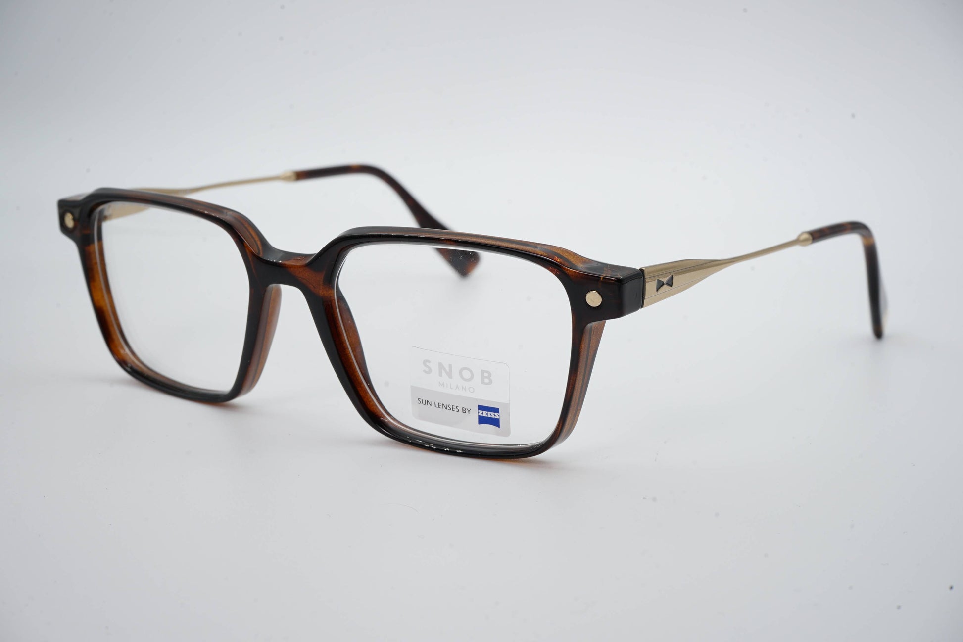The Snob Milano Ribot Biolux SNV223RT C02 combines premium acetate in a Havana pattern with lightweight metal temples, offering a robust structure and balanced comfort. The modern rectangular design gains immediate versatility thanks to the magnetic clip-on sunglass, which transforms the optical frame into sunglasses with a single movement. Zeiss sunglass lenses guarantee reliable protection and superior optical performance.