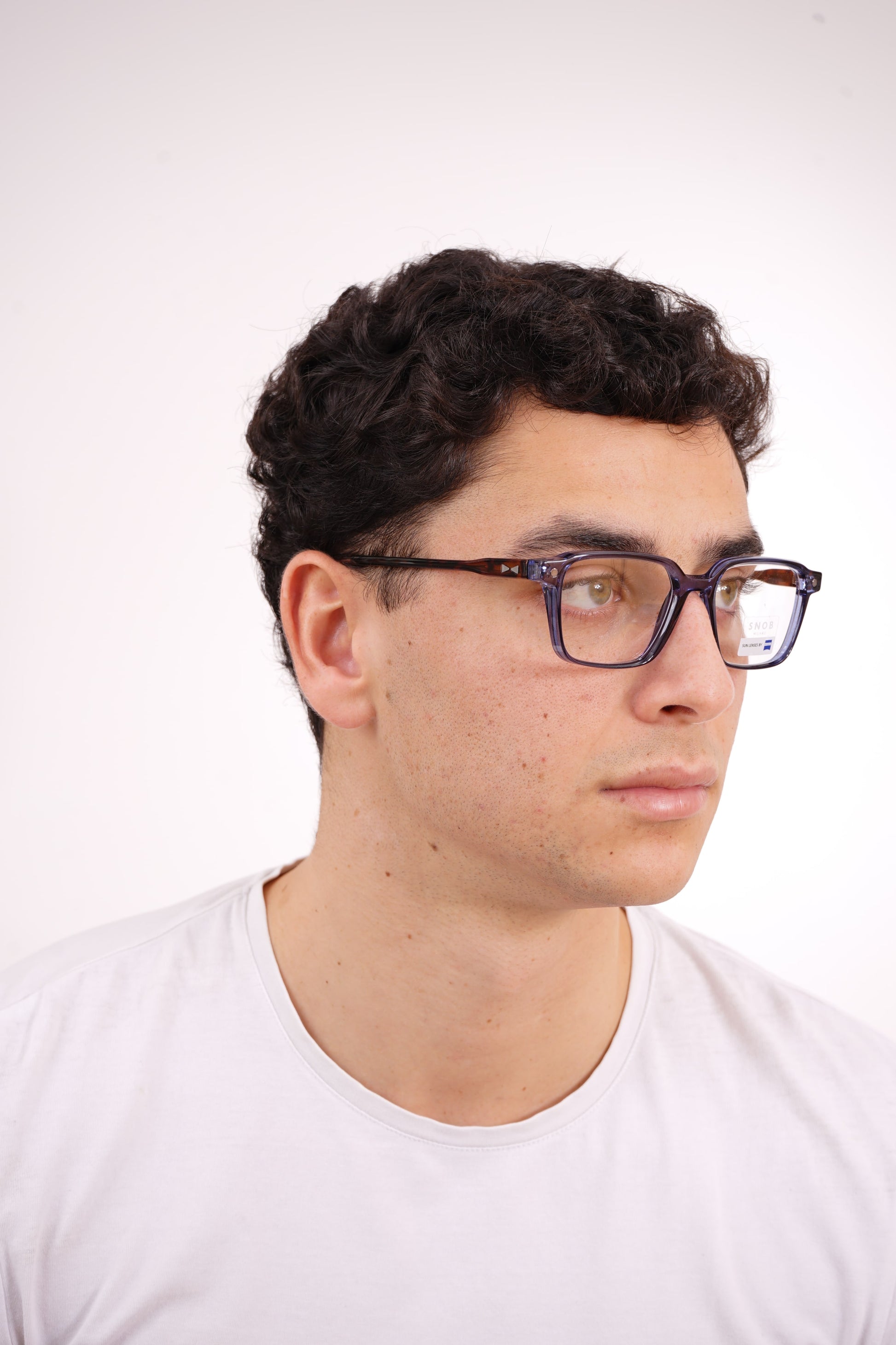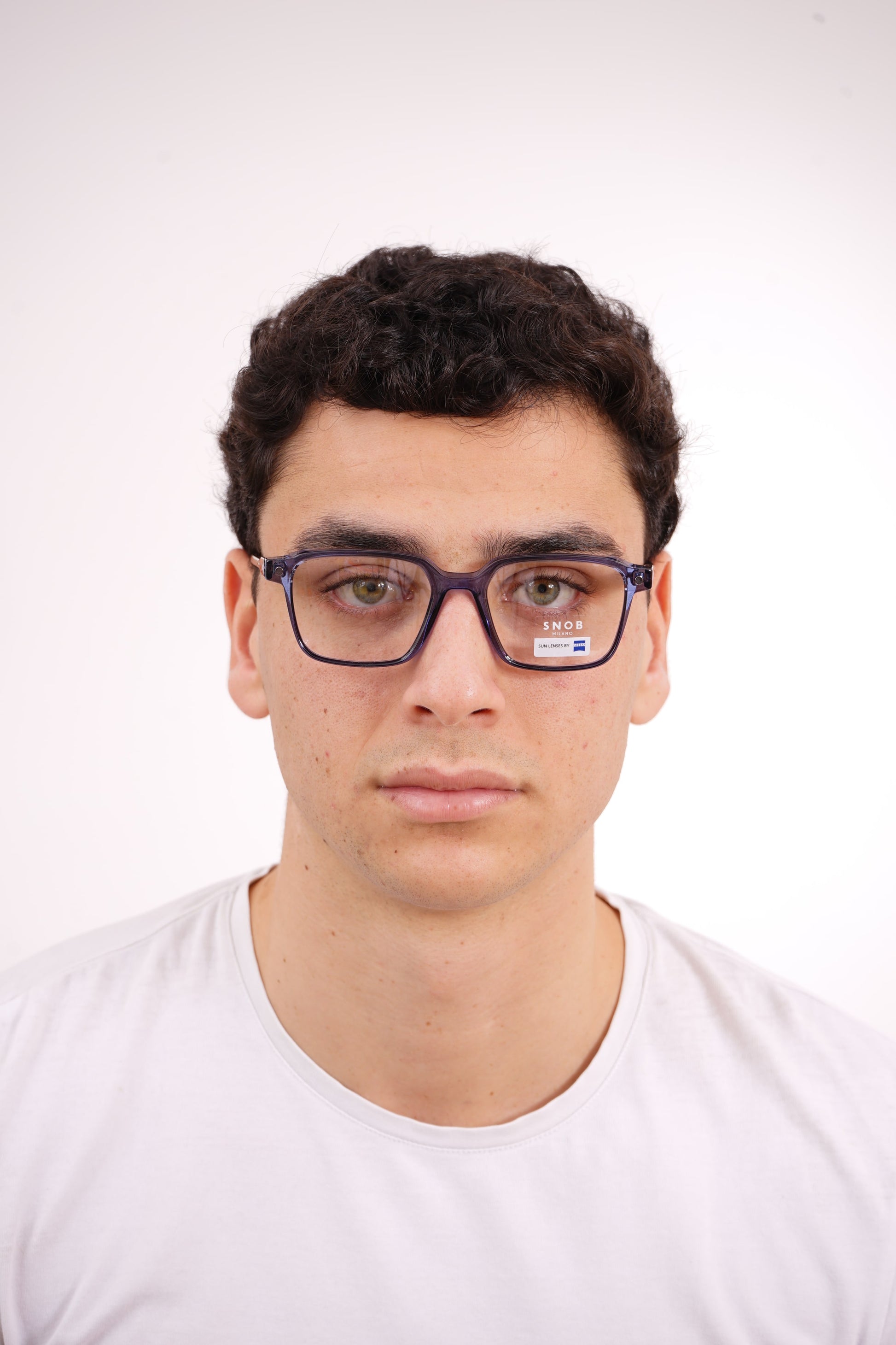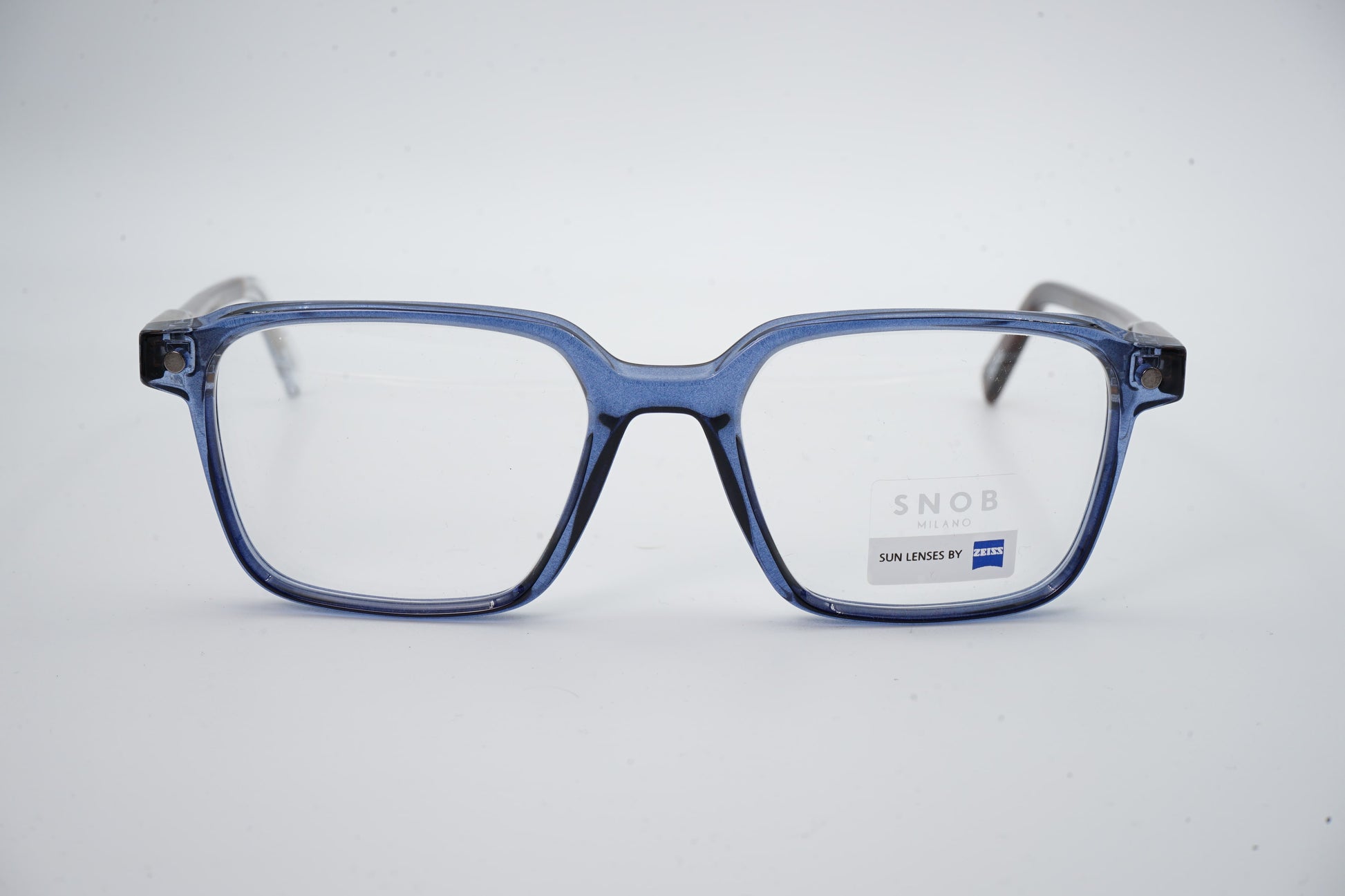 Snob Milano Ribot SNV216 C05 apresenta um design retangular robusto em acetato azul translúcido, com hastes em padrão Havana que reforçam a estética contemporânea da marca. A construção sólida garante estabilidade e conforto durante todo o dia. O clipe solar magnético com lentes Zeiss oferece proteção superior e transforma o modelo instantaneamente em óculos de sol, mantendo a mesma linha estética. Uma solução prática e premium para quem exige versatilidade, durabilidade e estilo definido.