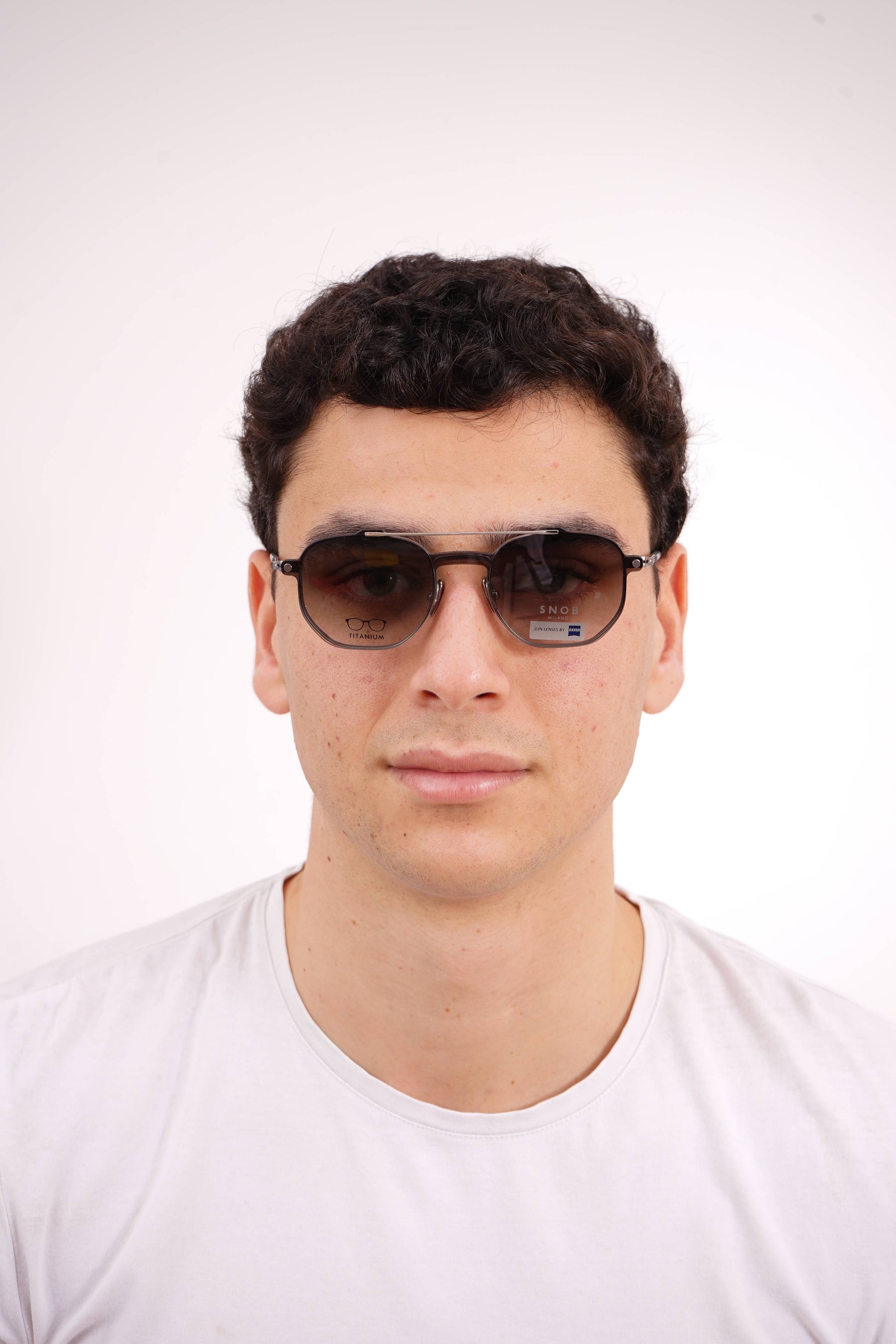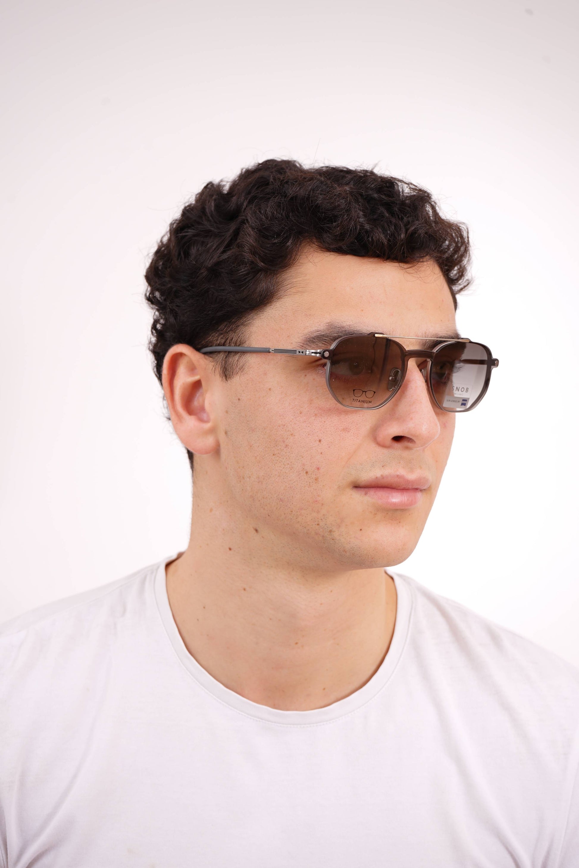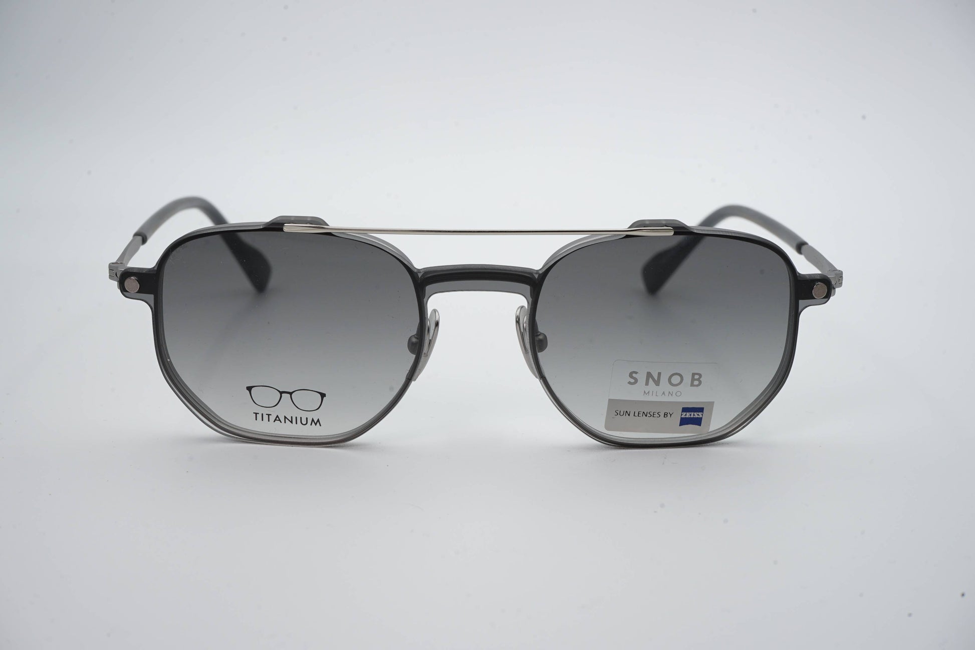 The Snob Milano Special III SNV170T C05 combines an ultralight titanium frame with a technical, aviator-inspired design, offering strength, precision, and extended comfort. The metallic front in a gray finish reinforces the modern, minimalist aesthetic, while the adjustable nose pads ensure a perfect fit. The magnetic clip-on sun visor, equipped with Zeiss lenses in a gray gradient tint, transforms the optical frame into high-performance sunglasses, maintaining protection, lightness, and stability.