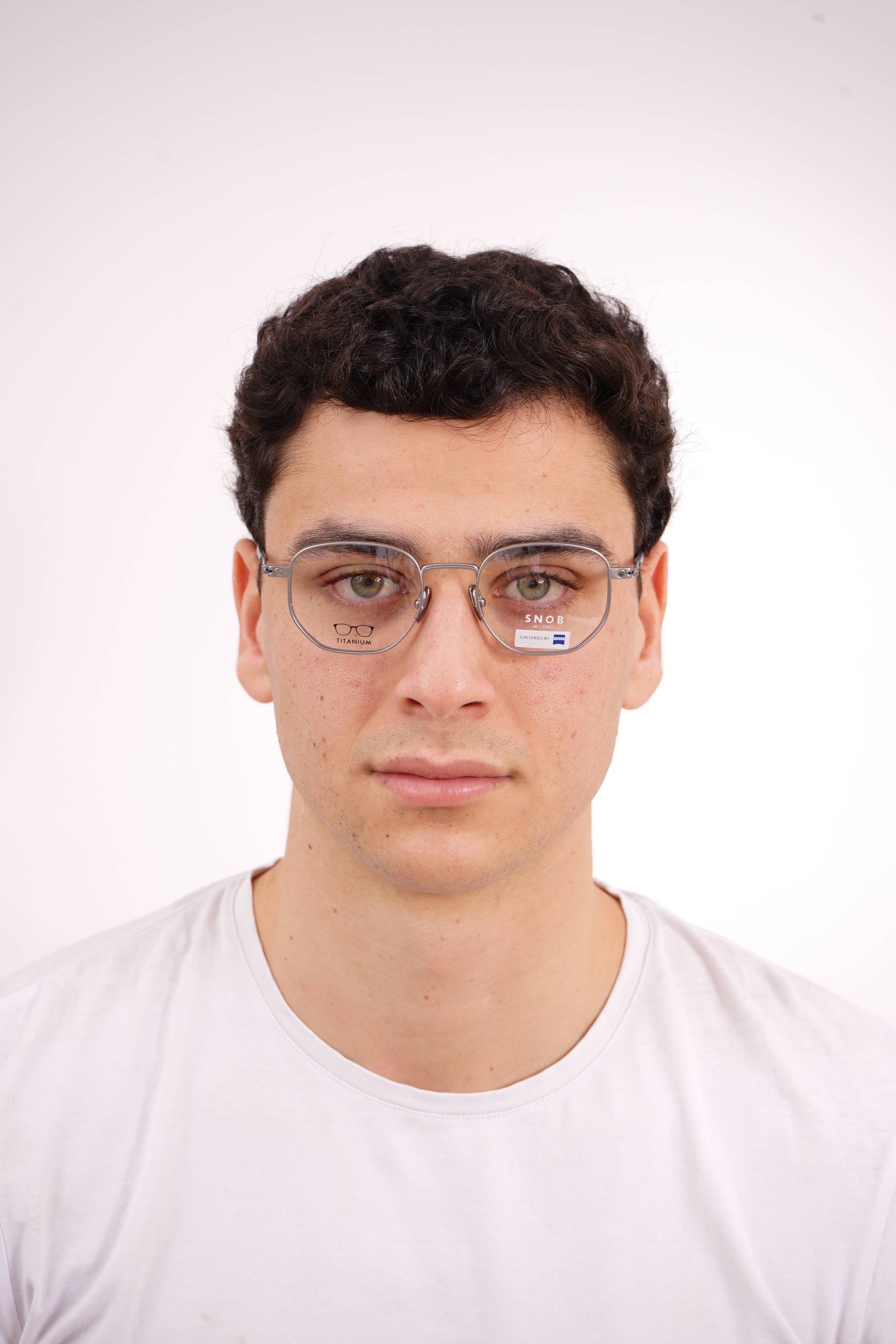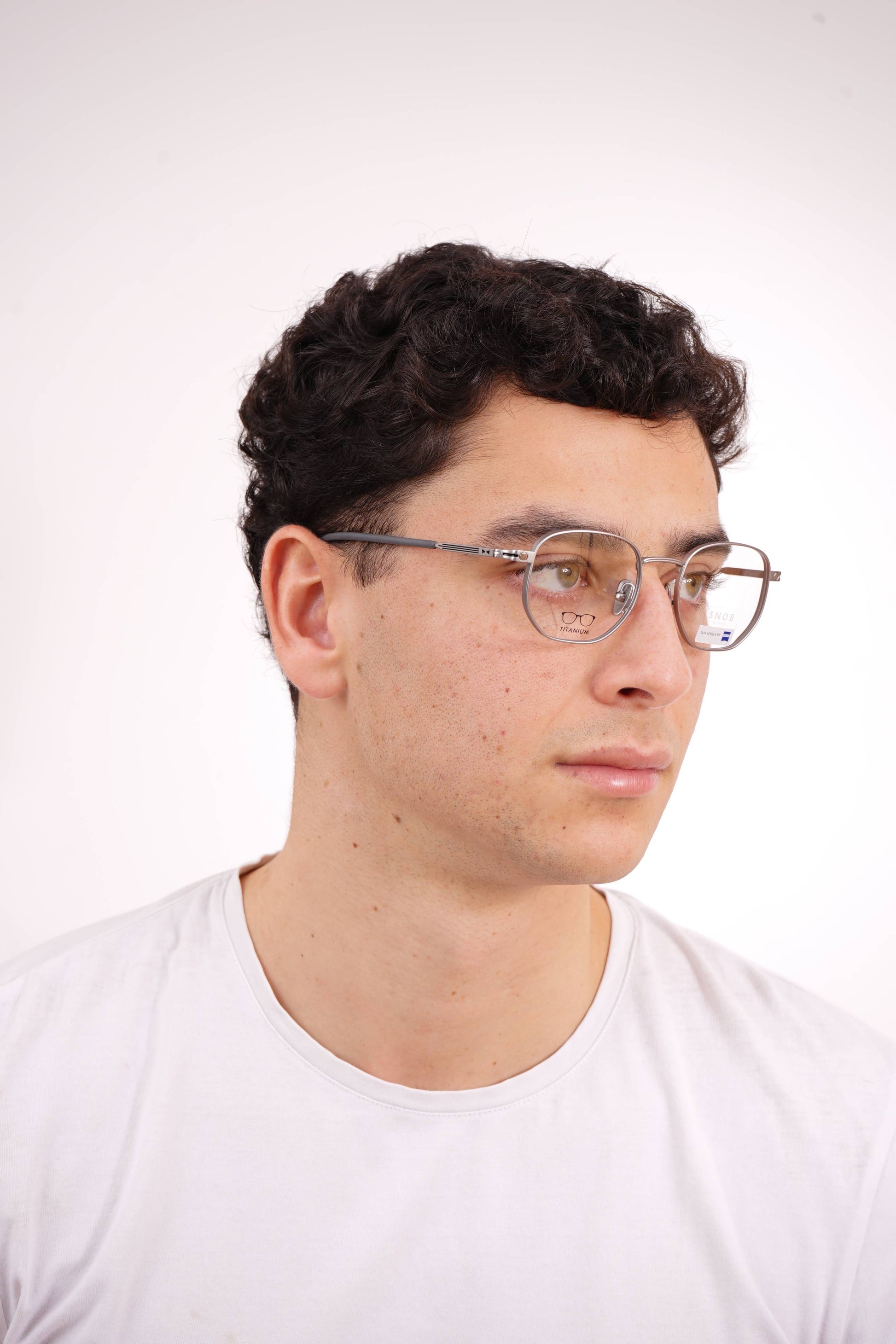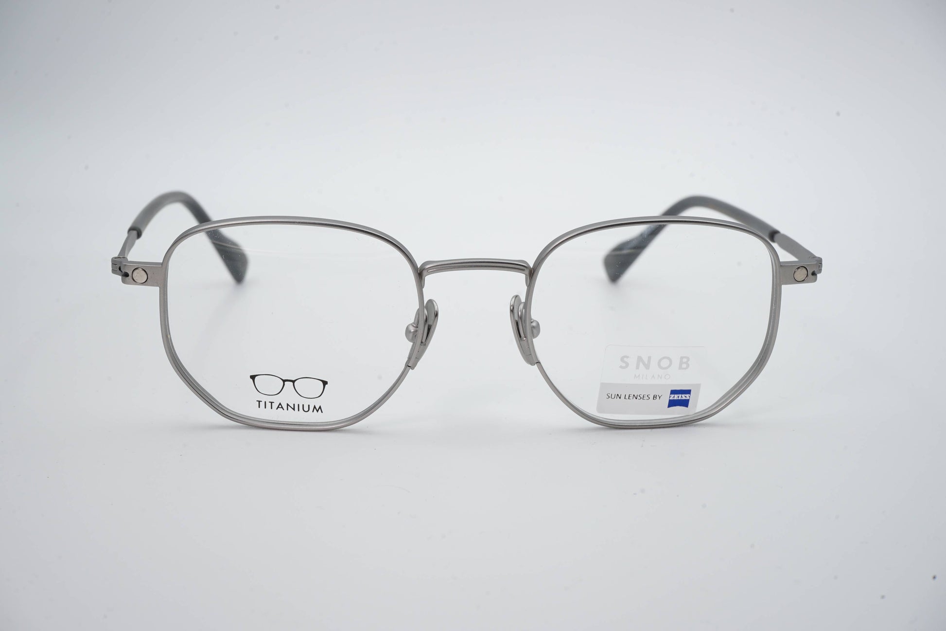 The Snob Milano Special III SNV170T C05 combines an ultralight titanium frame with a technical, aviator-inspired design, offering strength, precision, and extended comfort. The metallic front in a gray finish reinforces the modern, minimalist aesthetic, while the adjustable nose pads ensure a perfect fit. The magnetic clip-on sun visor, equipped with Zeiss lenses in a gray gradient tint, transforms the optical frame into high-performance sunglasses, maintaining protection, lightness, and stability.
