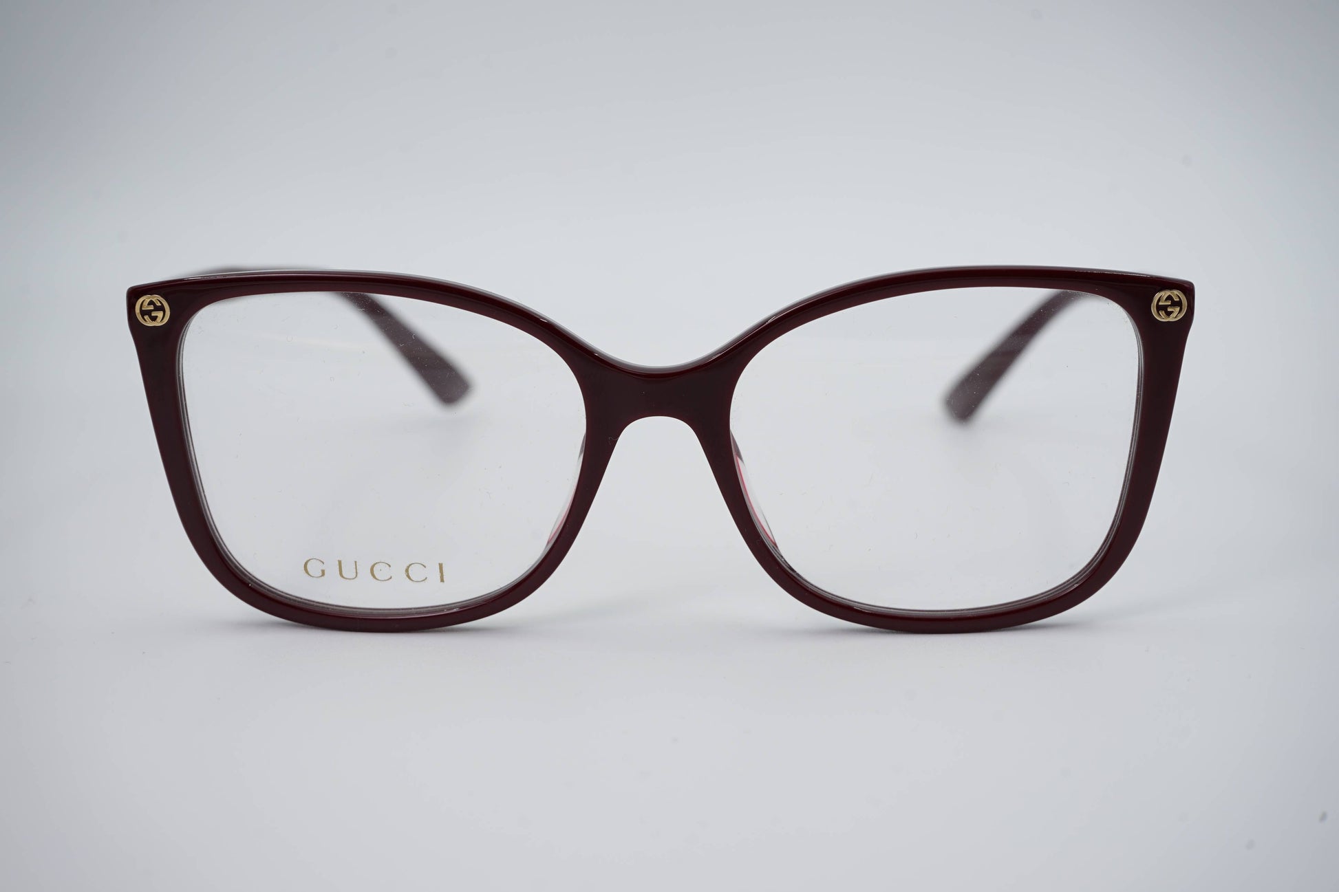 Os óculos Gucci modelo GG0026O 012 destacam-se pelo seu design elegante e sofisticado. Apresentam uma armação em acetato na cor bordô, proporcionando durabilidade e conforto. O formato "cat-eye" confere um toque feminino e clássico, adequado para diversas ocasiões. As hastes finas são adornadas com o discreto logótipo GG entrelaçado, símbolo icónico da marca, acrescentando um detalhe subtil de luxo.
