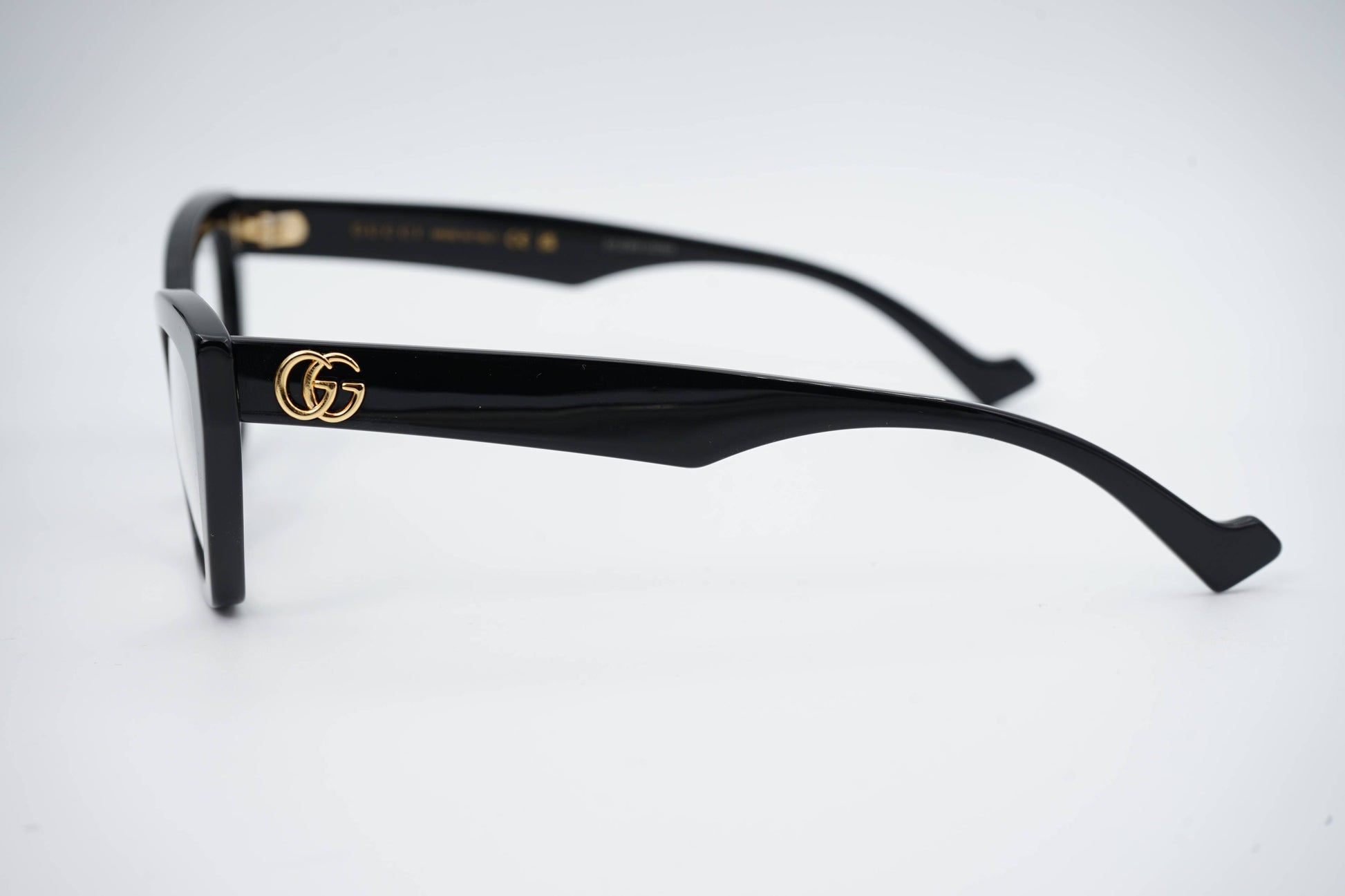 O modelo Gucci GG1334O 001 apresenta uma armação em acetato preto com um design "cat-eye" elegante e sofisticado. As hastes são adornadas com o icónico logótipo GG, conferindo um toque de luxo discreto.