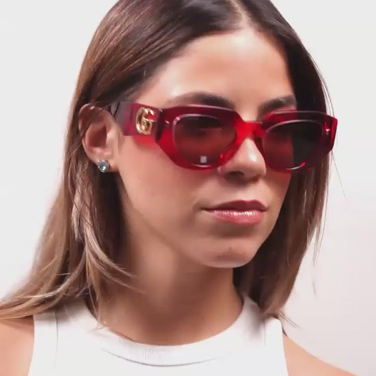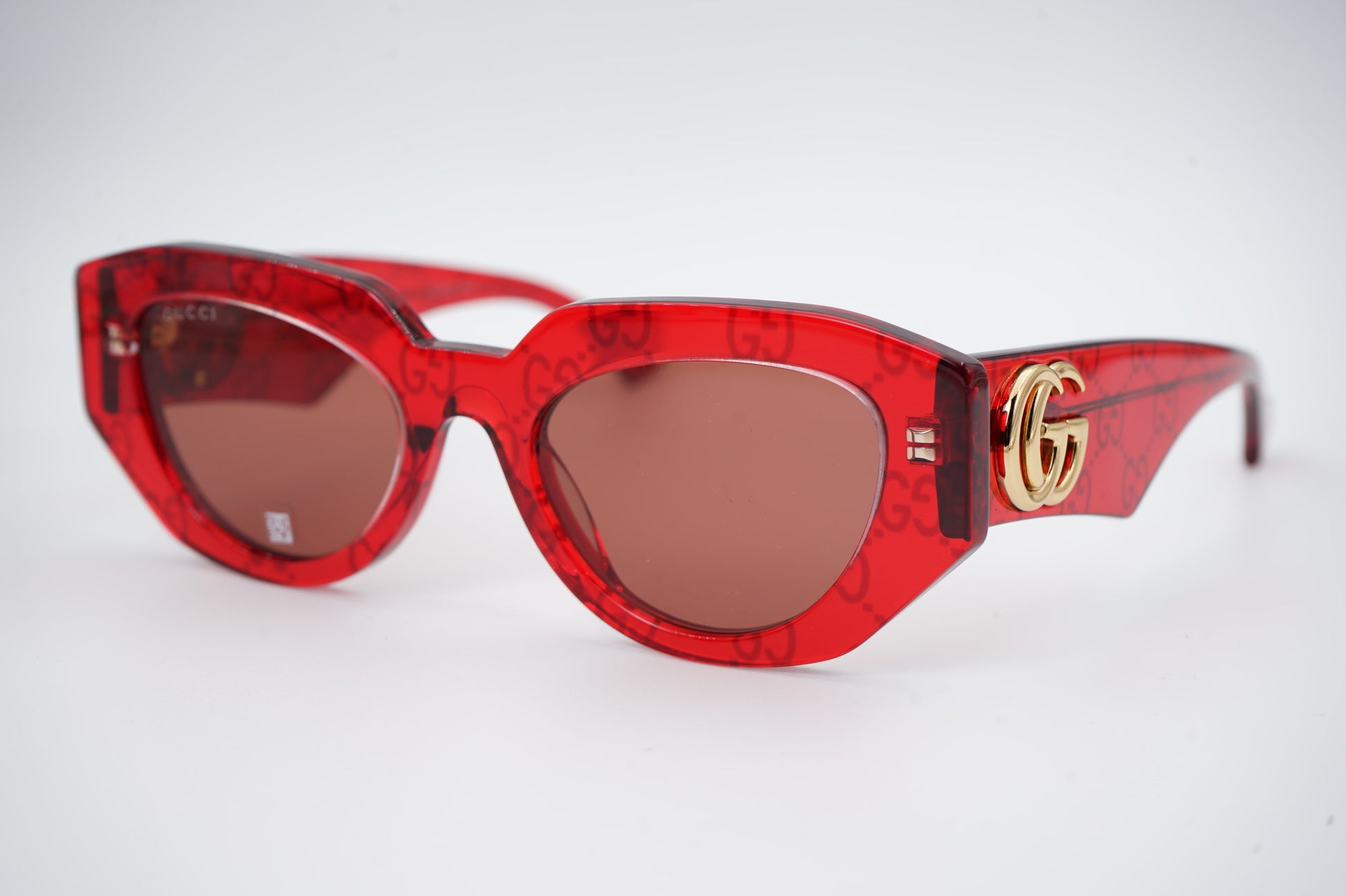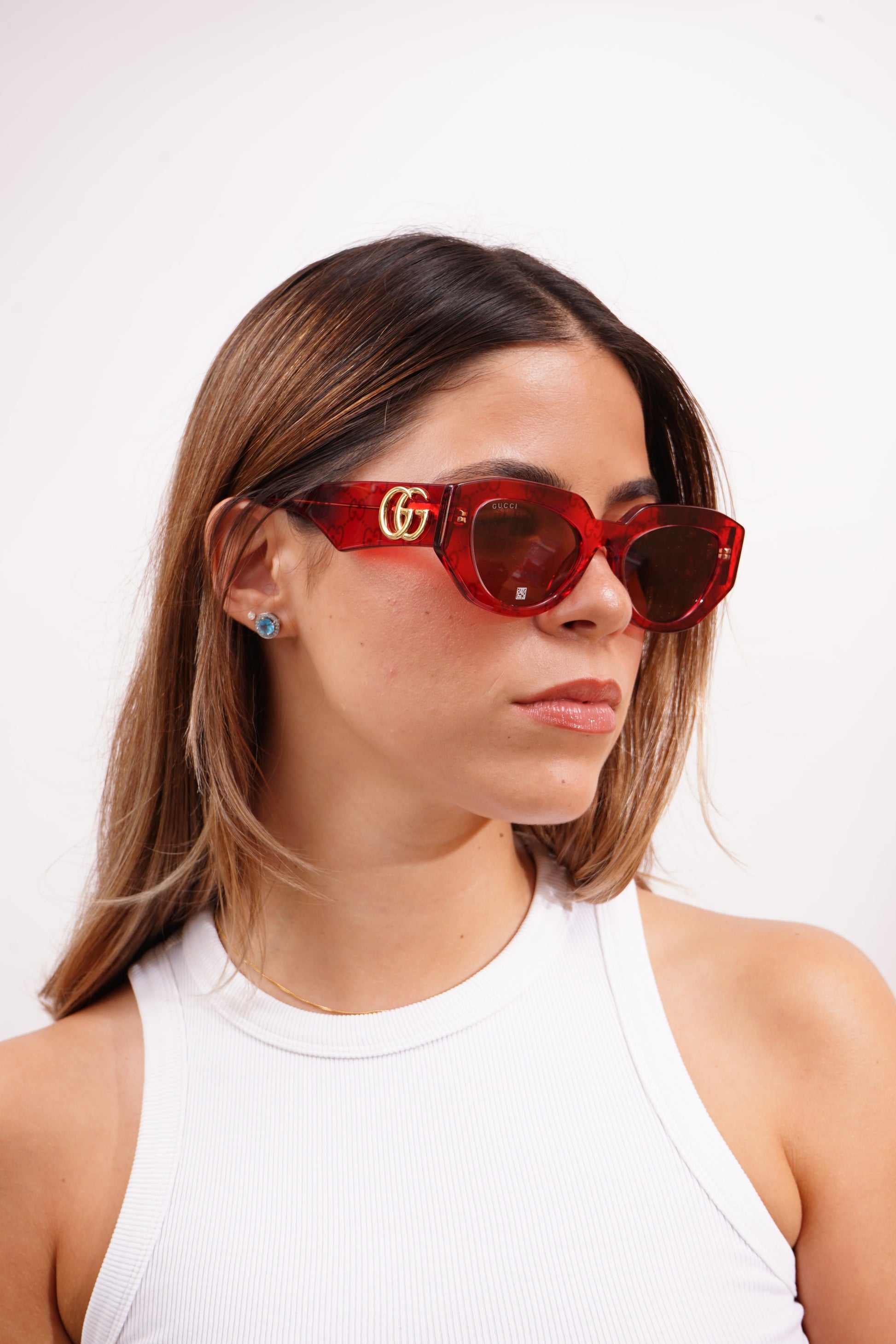 Os óculos de sol Gucci GG 1421S 006 apresentam um design redondo cateye elegante que combina a sofisticação da armação vermelho vivo transparente, criando um acessório de luxo distinto. Este modelo reflete a estética icónica da Gucci, destacando-se pelo conforto e pelos acabamentos premium.