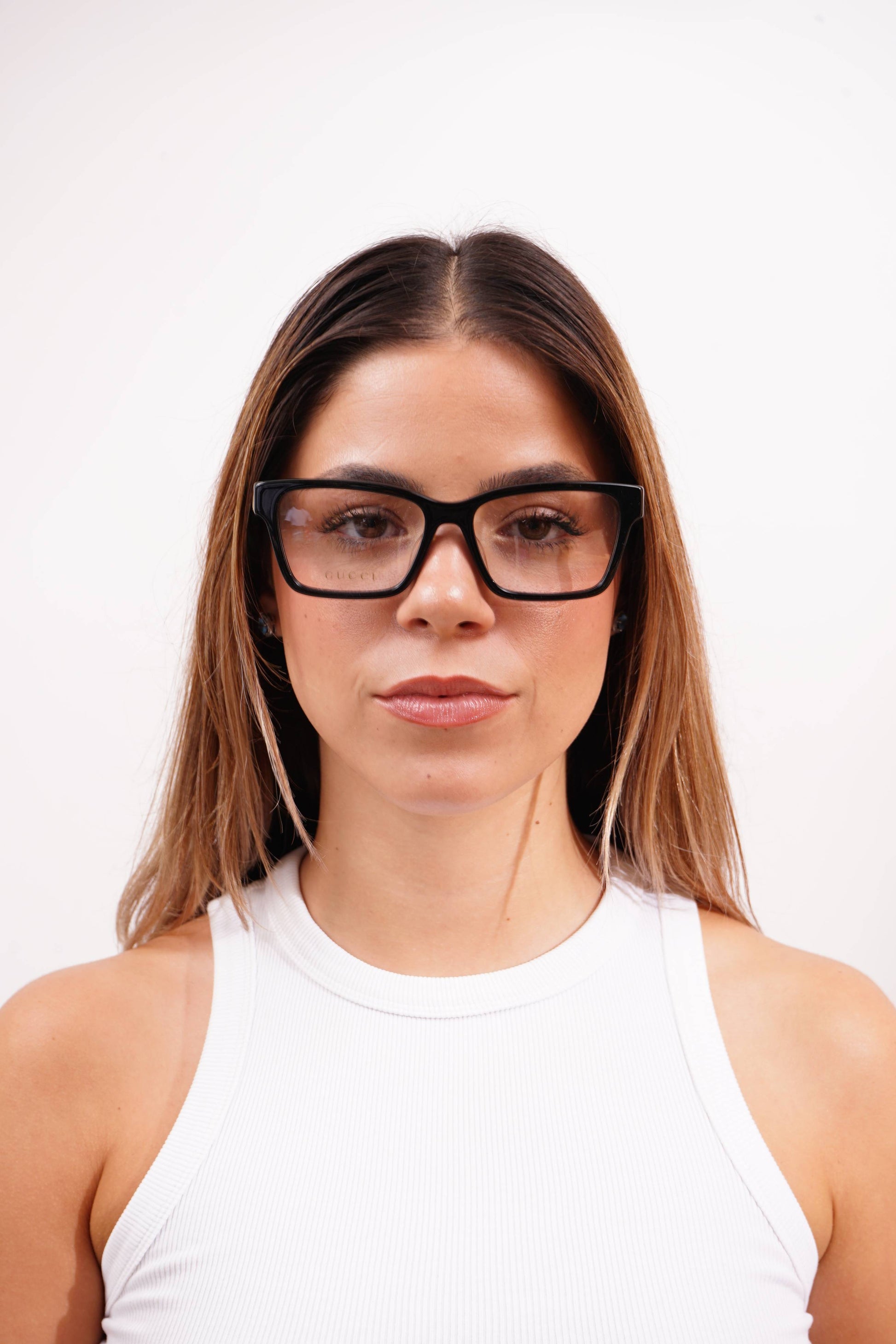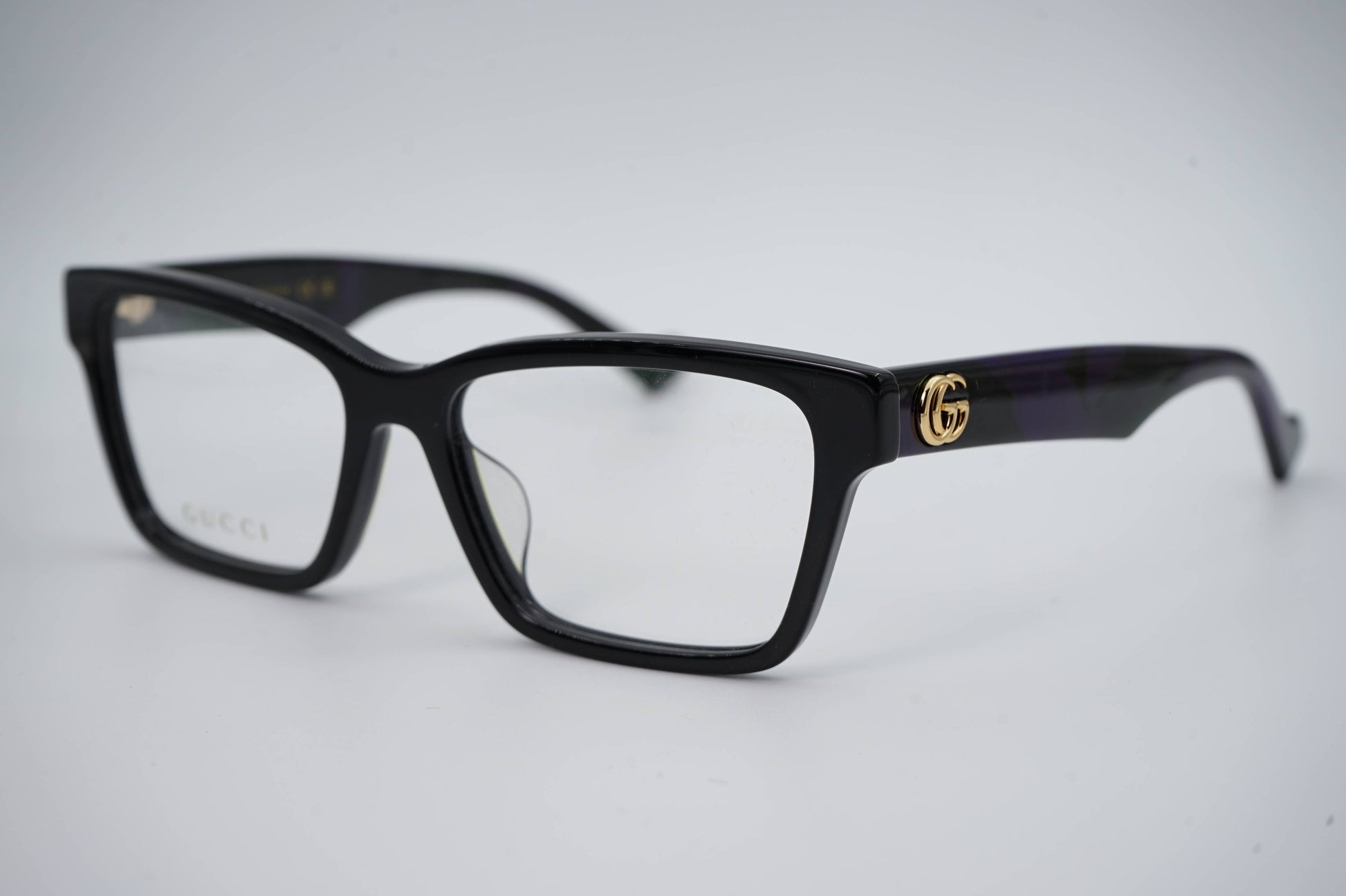 As hastes apresentam o logótipo Gucci em dourado, adicionando um toque distintivo e contemporâneo ao visual.