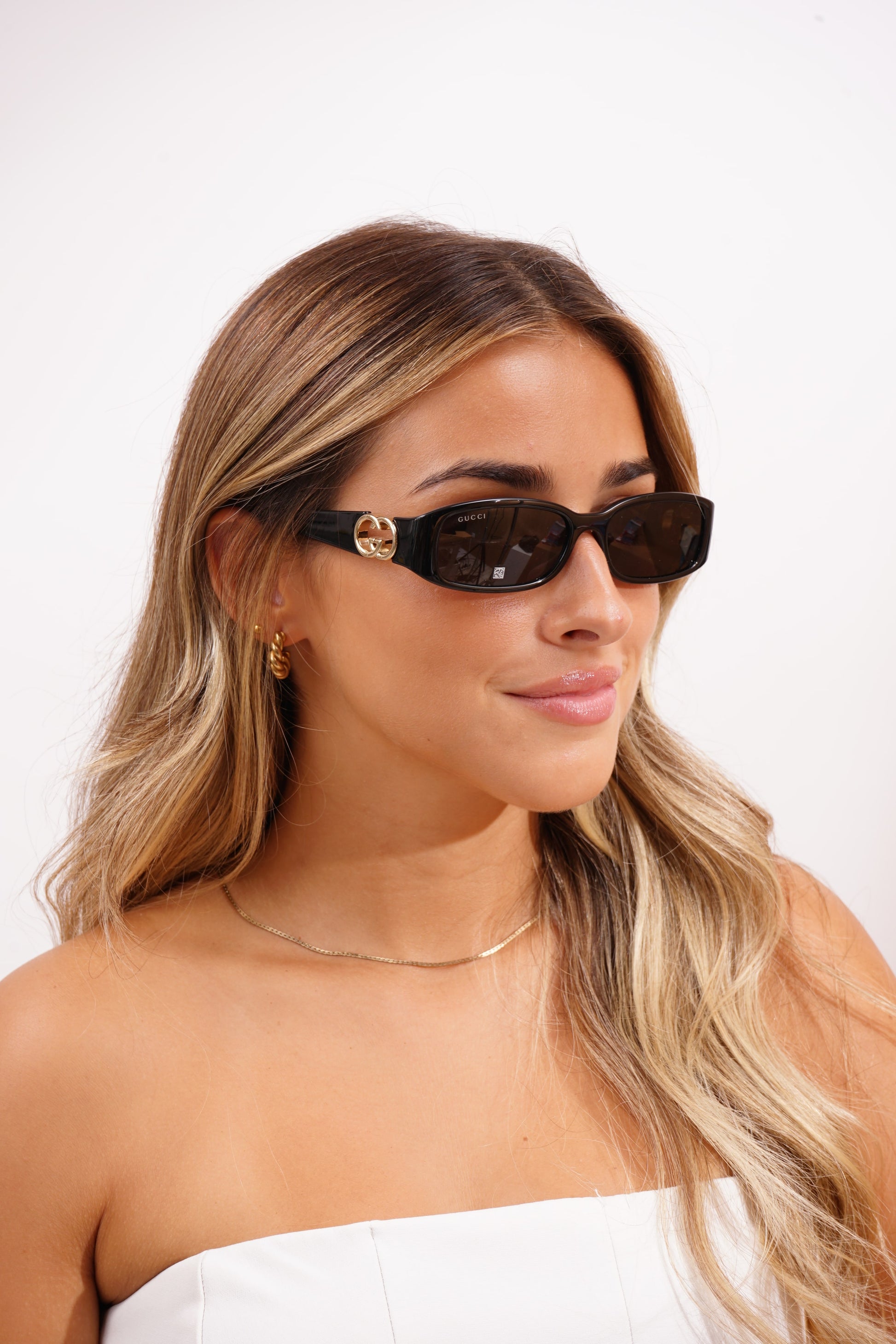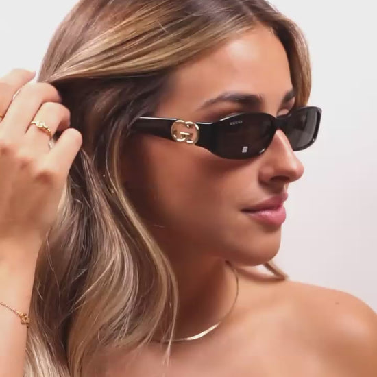 Os óculos de sol Gucci GG 1661S 001 apresentam um design retangular sofisticado que combina a elegância da armação preta com lentes em cinzento, criando um acessório de luxo com estilo intemporal. Este modelo traduz a identidade icónica da Gucci, destacando-se pelo conforto e pela qualidade premium dos acabamentos.