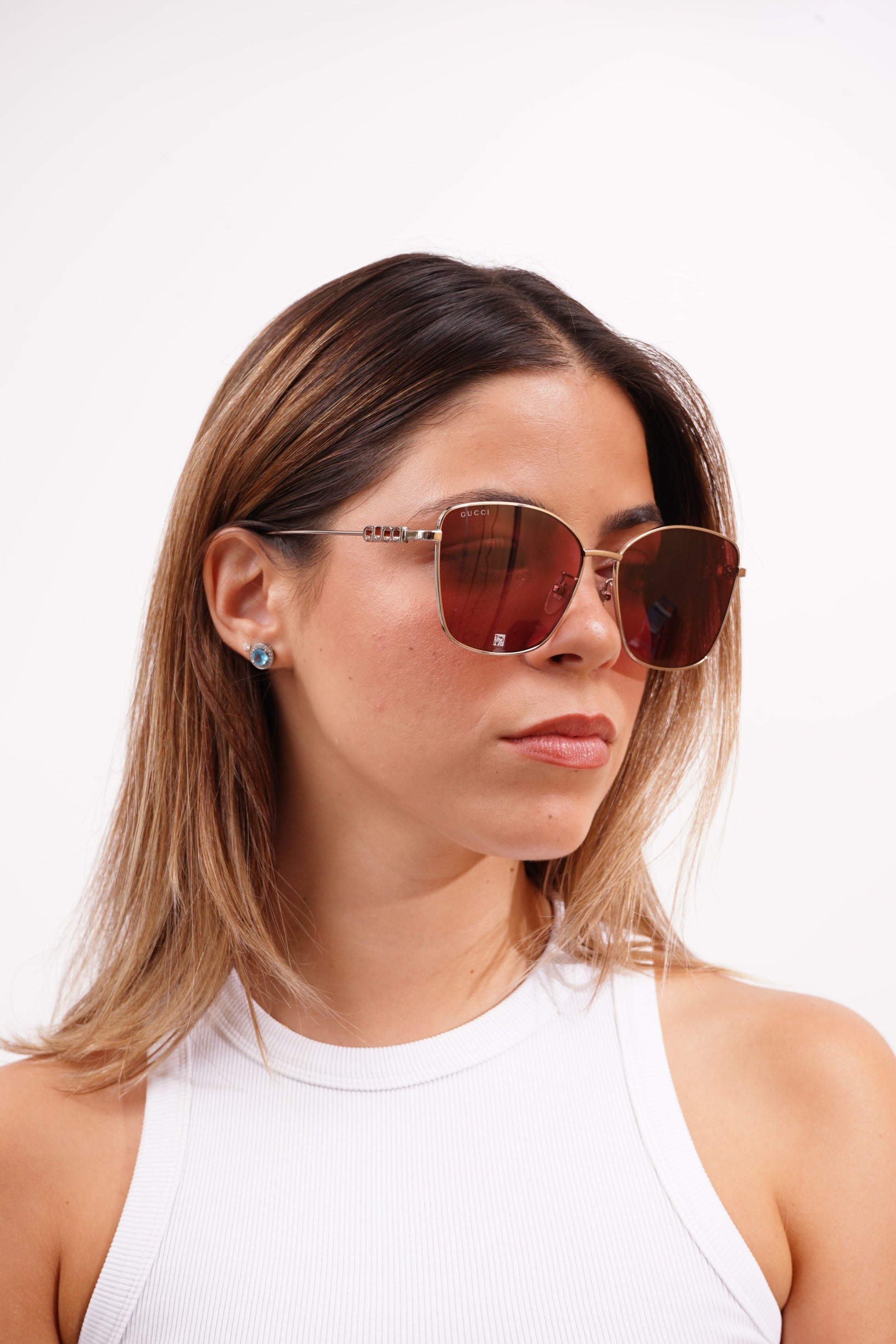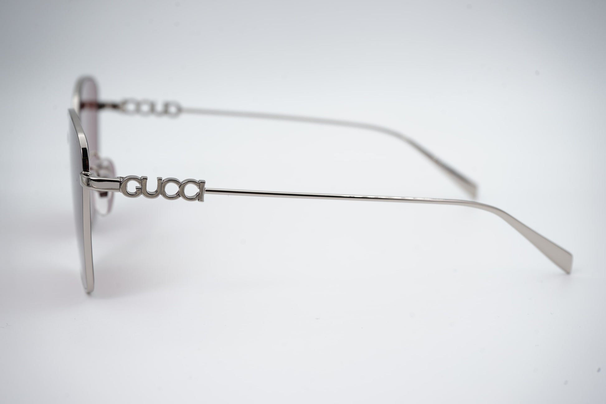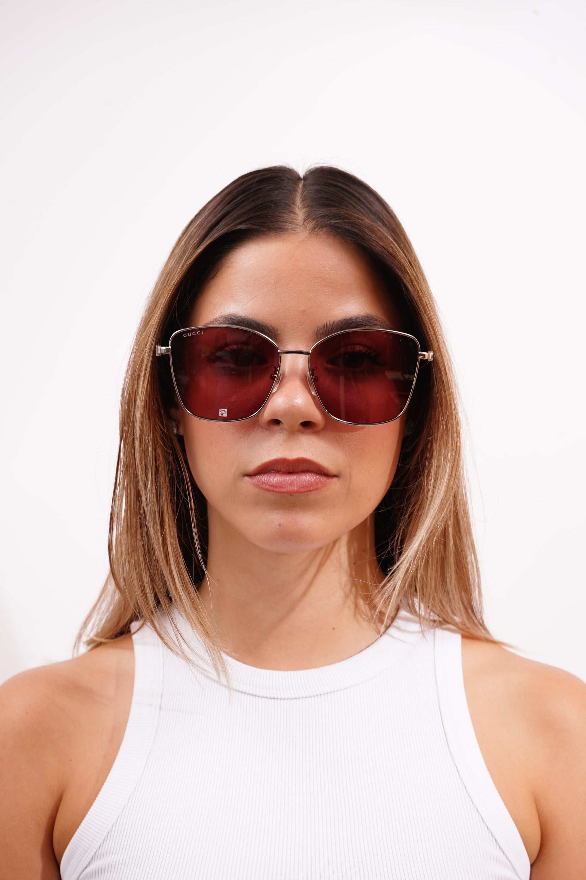 Os óculos de sol Gucci GG1805SA 004 oferecem um estilo marcante e elegante para mulheres que apreciam design sofisticado. A armação metálica prateada em formato butterfly confere um visual delicado, ao mesmo tempo ousado. As lentes bordô sólidas em bio-nylon proporcionam proteção UV400 total, garantindo conforto e segurança sob exposição solar intensa. Com medidas de 60 mm de lente, ponte de 15 mm e hastes de 145 mm, adaptam-se bem a rostos médios-grandes. Fabricados no Japão, este modelo combina luxo, presença e funcionalidade.
