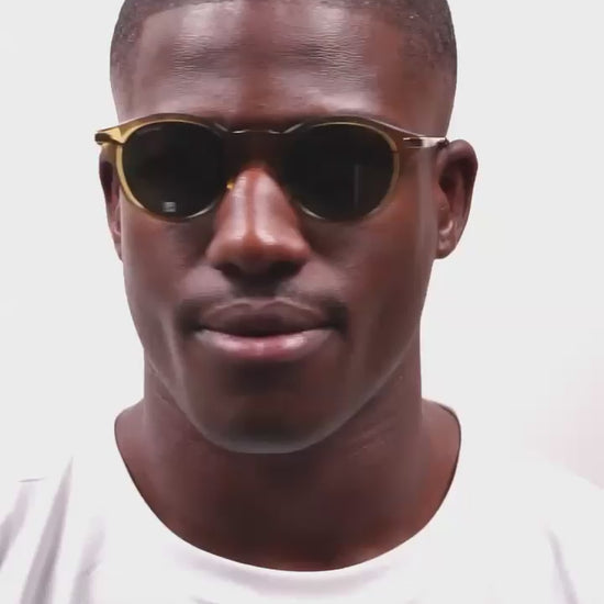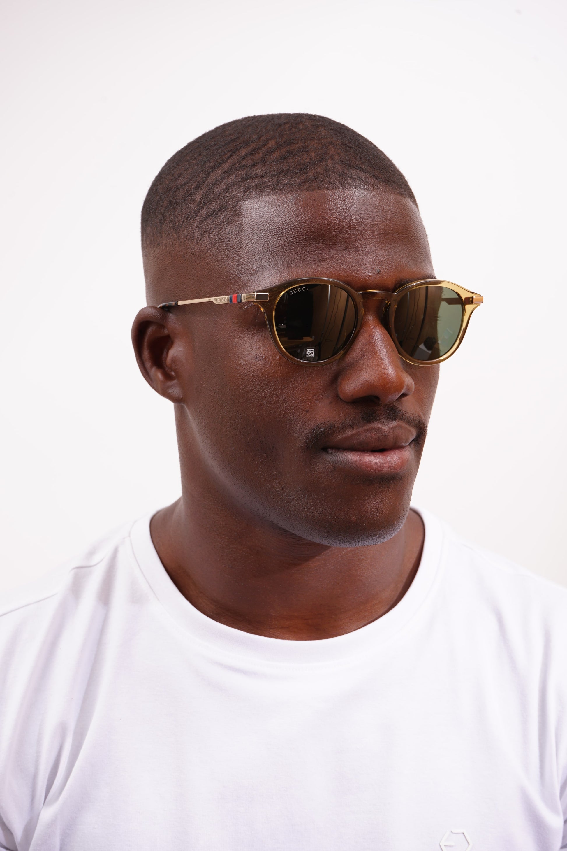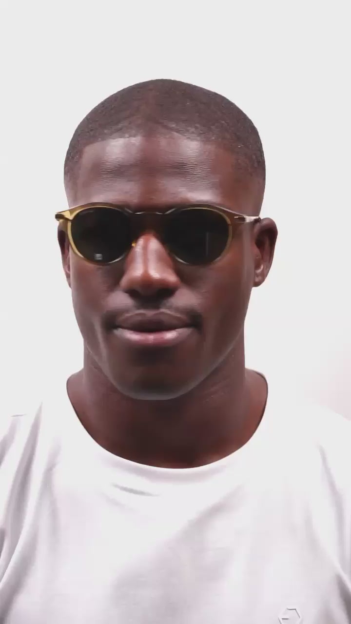 Os óculos de sol Gucci GG1890S 003 destacam-se pelo design redondo de aro completo, com armação em acetato castanha-transparente combinada com hastes em dourado, criando um aspeto sofisticado e versátil. As lentes são verdes com proteção UV400 e classificação de filtro solar categoria 3, oferecendo excelente proteção para uso diário