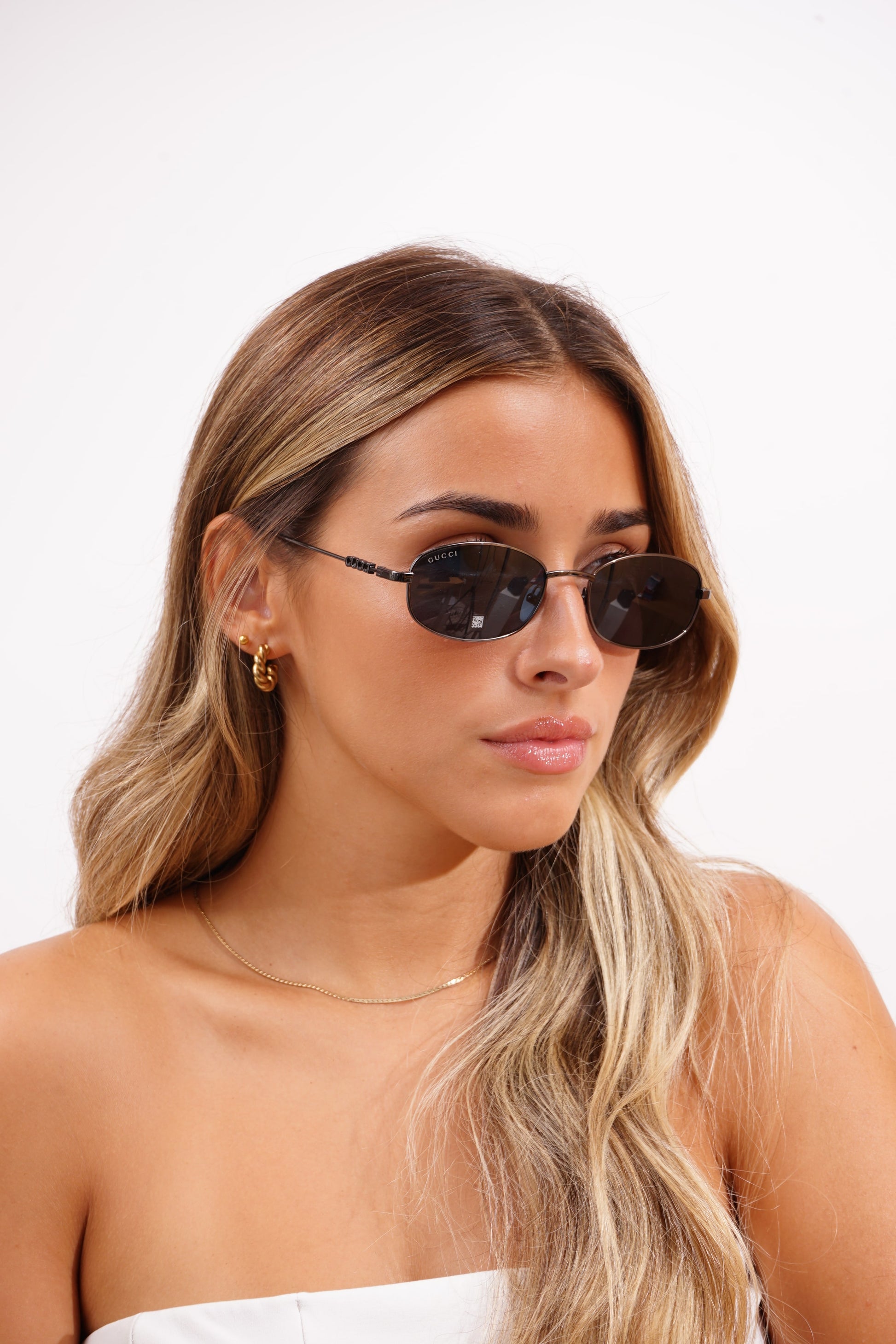 Os óculos de sol Gucci GG1940S 001 unem design clássico e sofisticação contemporânea. Com uma armação metálica em “ruthenium escuro brilhante” e formato oval, este modelo feminino destaca-se pelo seu estilo refinado. As lentes bio-nylon sólidas, de cor azul, garantem proteção UV400 completa, ideal para proteger os seus olhos durante o dia. Fabricados no Japão, com dimensões aproximadas de 54 mm de lente, ponte de 19 mm e hastes de 140 mm, encaixam bem em rostos médios, oferecendo conforto e estabilidade. Um acessório de luxo que acrescenta elegância a qualquer ocasião.