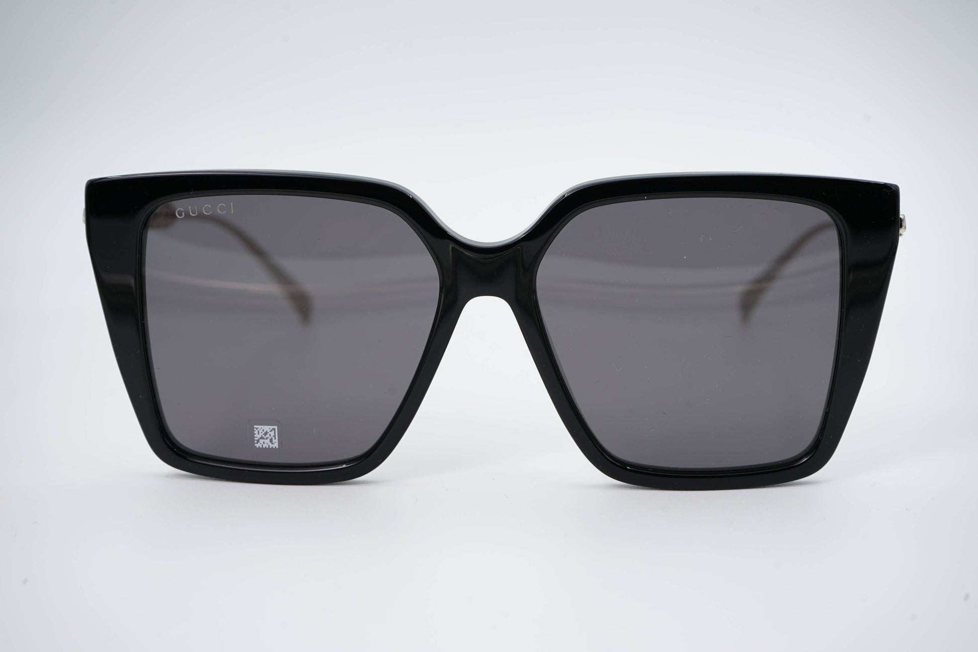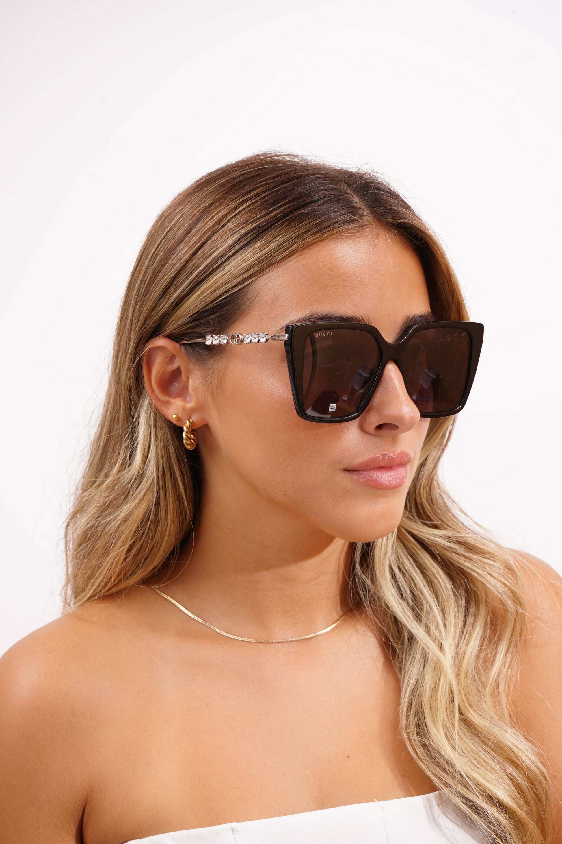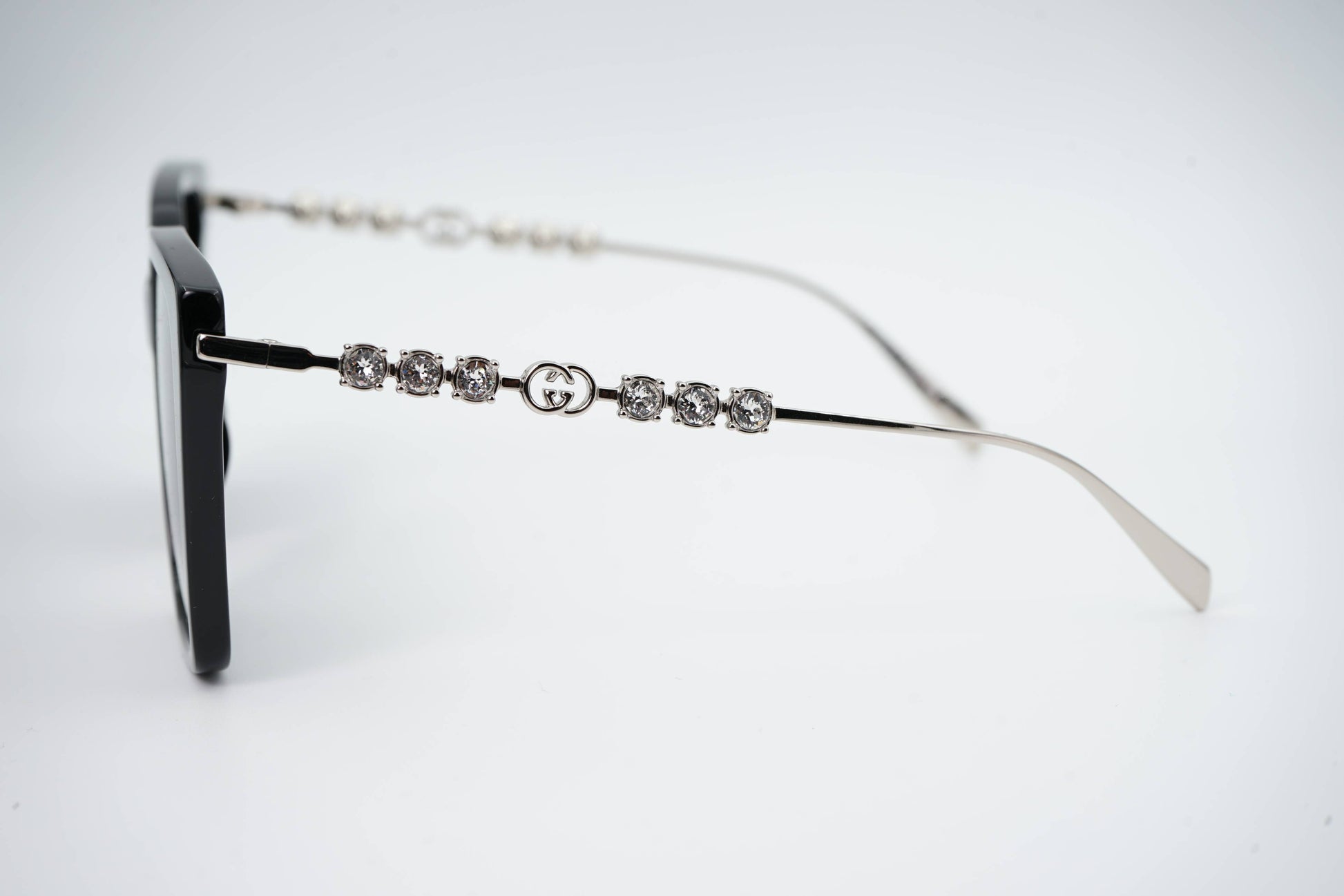 Os Gucci GG1967S 002 são óculos de sol femininos que combinam elegância contemporânea com um toque de sofisticação. Apresentam uma armação estilo quadrados em acetato preto brilhante adornado com brilhantes nas hastes, complementada por lentes cinza em bio-nylon, oferecendo proteção UV essencial. Este modelo é ideal para mulheres que procuram um acessório de luxo que destaque a sua personalidade e estilo único.