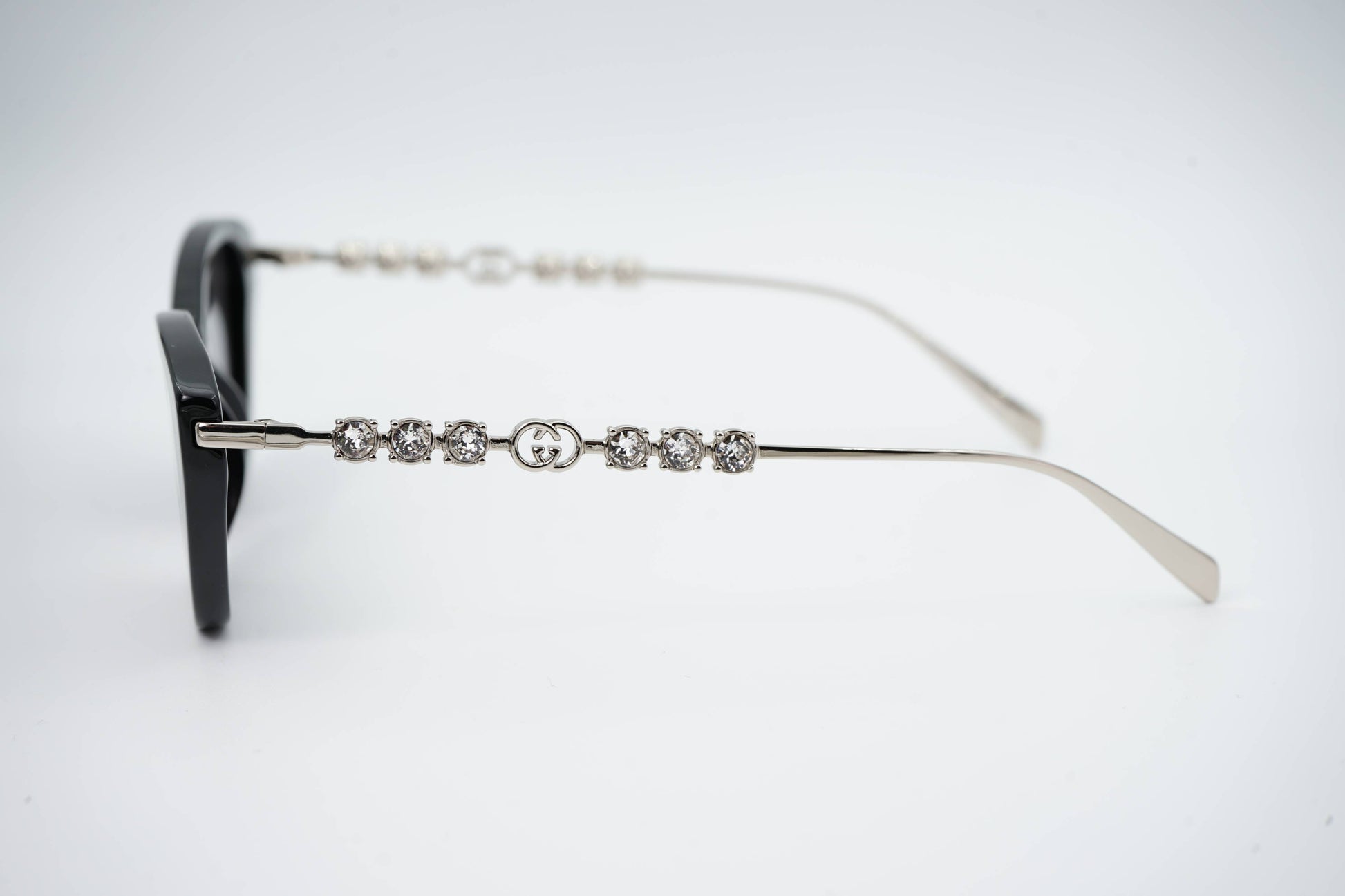 Os Gucci GG1968S 002 são óculos de sol femininos que combinam elegância contemporânea com um toque de sofisticação. Apresentam uma armação estilo cat eye em acetato preto brilhante, complementada por lentes cinza em bio-nylon e com brilhantes nas hastes, oferecendo proteção UV essencial. Este modelo é ideal para mulheres que procuram um acessório de luxo que realce a sua personalidade e estilo único.