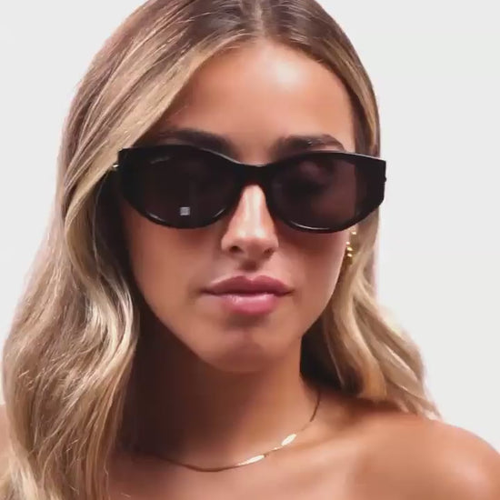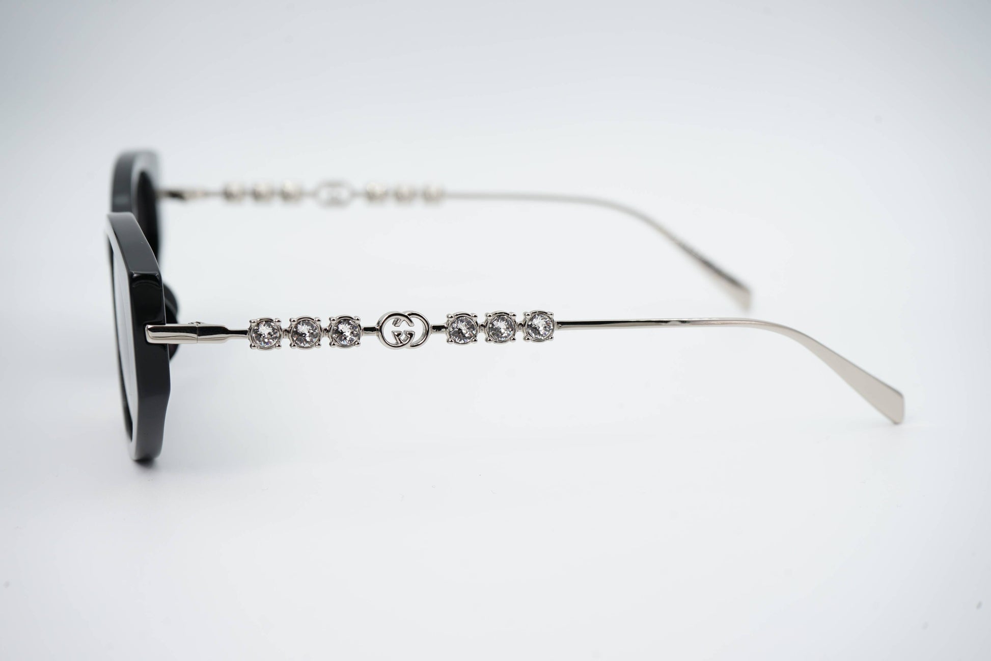 Os Gucci GG1970SA 002 são óculos de sol femininos que combinam elegância contemporânea com um toque de sofisticação. Apresentam uma armação estilo cat-eye em acetato preto brilhante, complementada por lentes de bio-nylon cinza sólido, oferecendo proteção UV essencial, com hastes adornadas por brilhantes. Este modelo é ideal para mulheres que procuram um acessório de luxo que destaque a sua personalidade e estilo único.