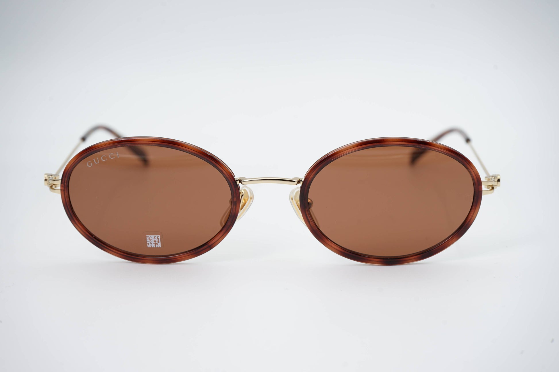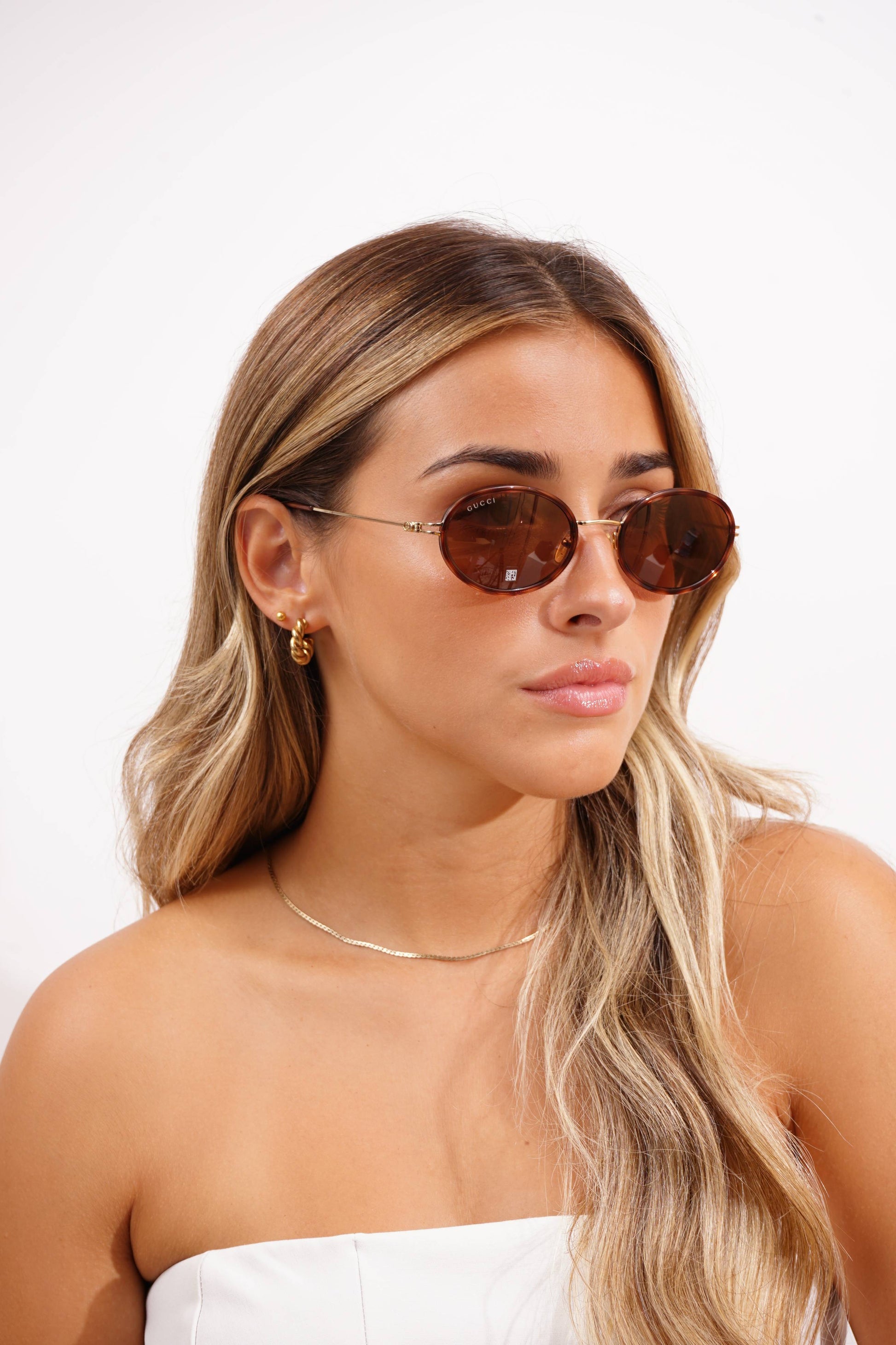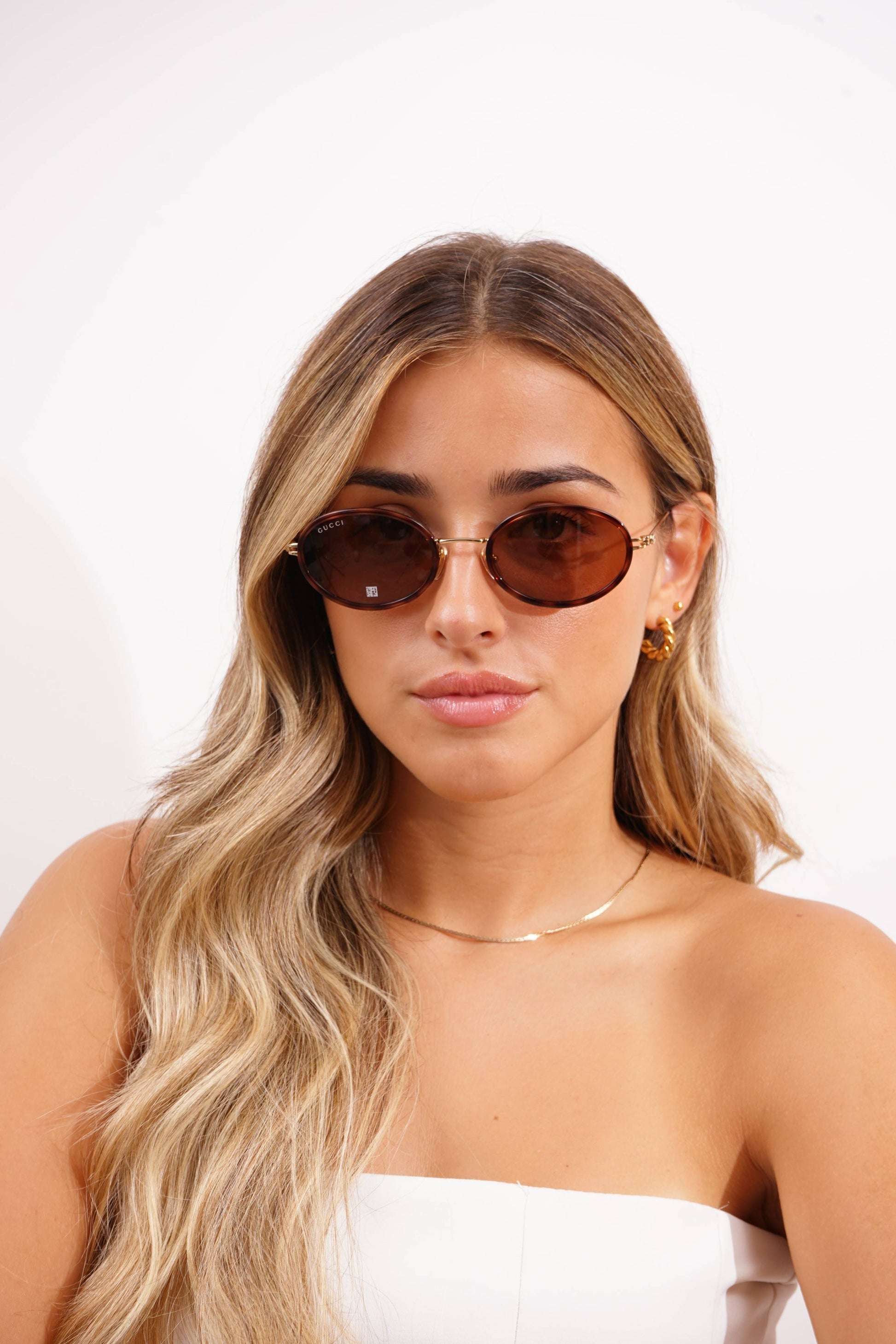 O design clássico oval é versátil e combina facilmente com diferentes tipos de rosto, transmitindo um charme intemporal que reflete o ADN de luxo da Gucci.
