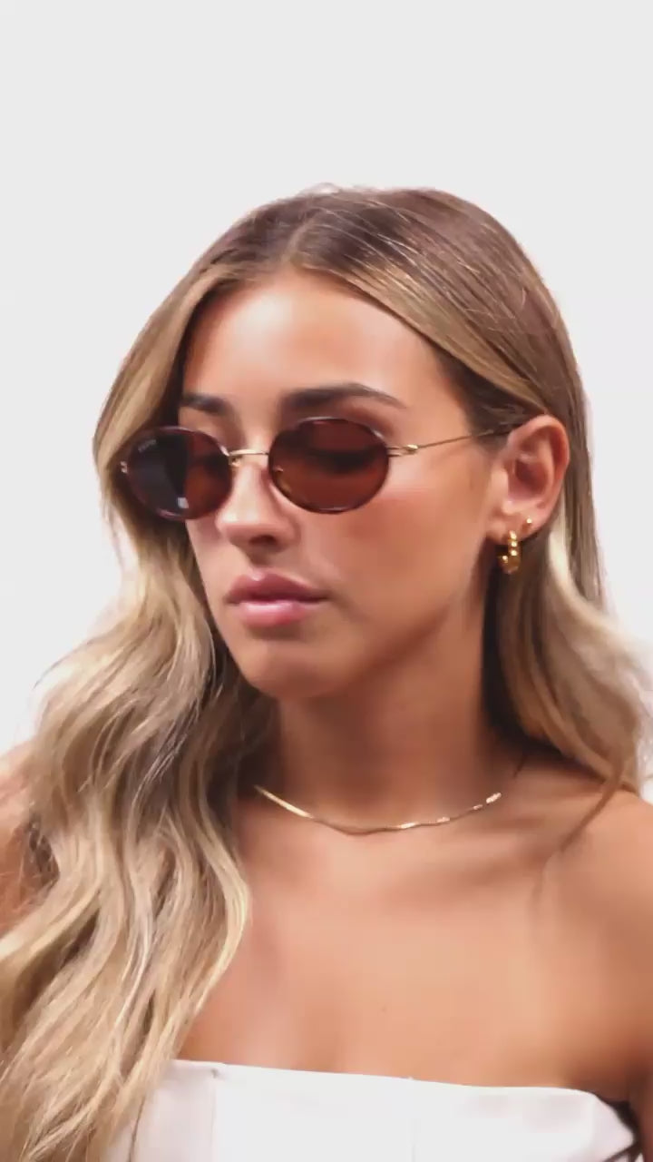 Com uma frente oval em acetato castanho com efeito tartaruga e hastes finas em metal dourado, este modelo alia elegância e leveza. As lentes castanhas oferecem conforto visual e proteção UV400, perfeitas para um uso diário com segurança e estilo.