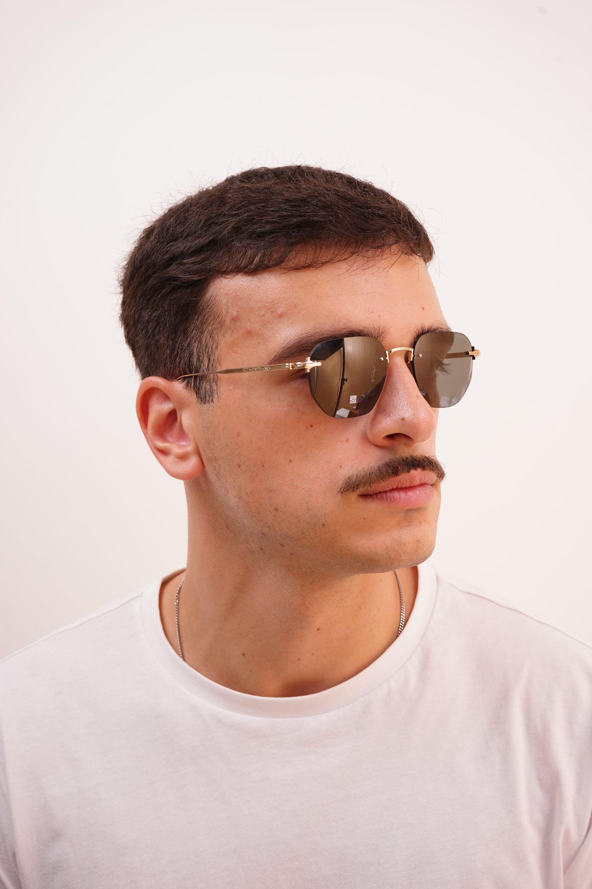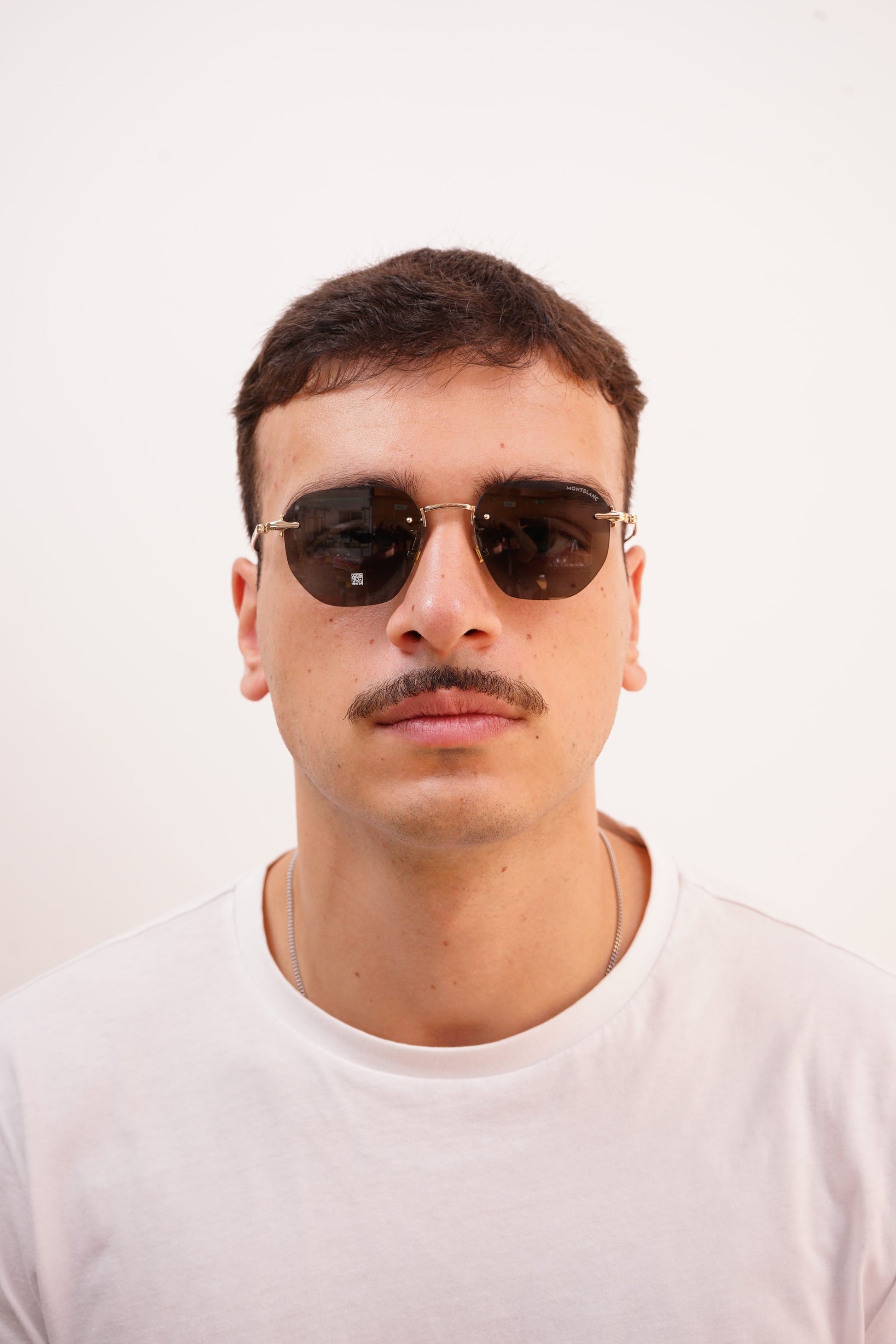 Os óculos de sol Montblanc 0405S 001 exibem um design sem aro com armação dourada e lentes cinzentas. O formato geométrico moderno oferece um visual leve e elegante, enquanto as lentes asseguram proteção UV total e conforto visual superior. Ideal para quem procura sofisticação minimalista com o prestígio inconfundível da Montblanc.