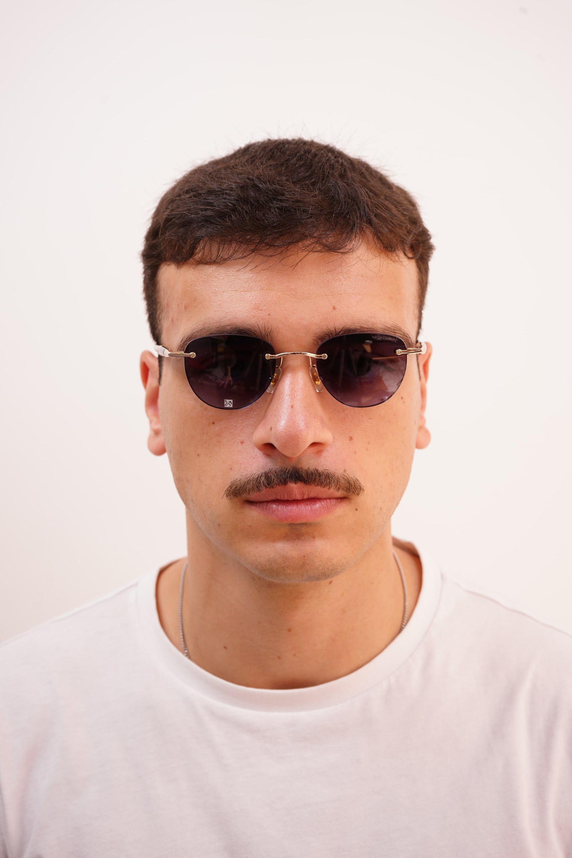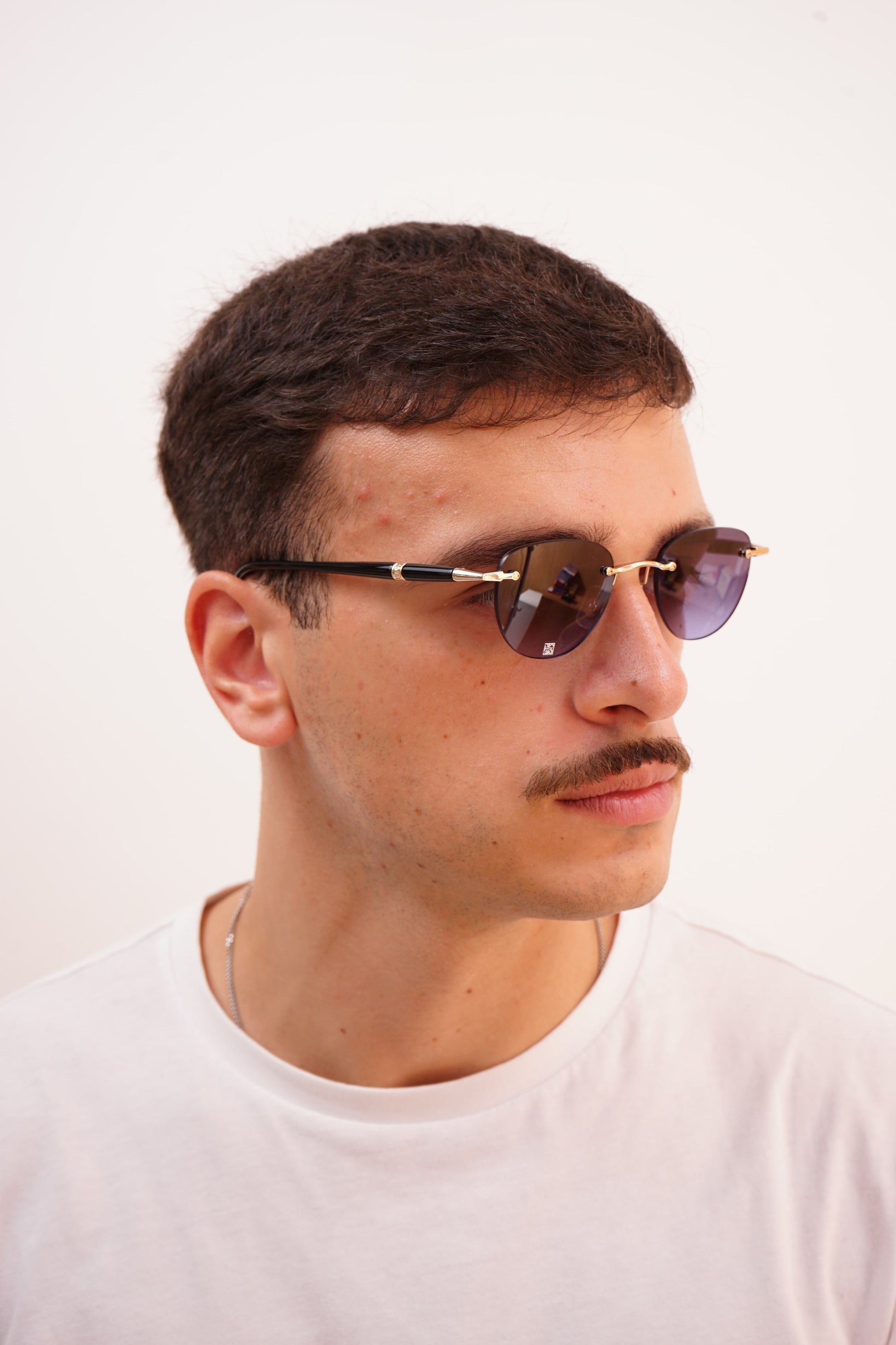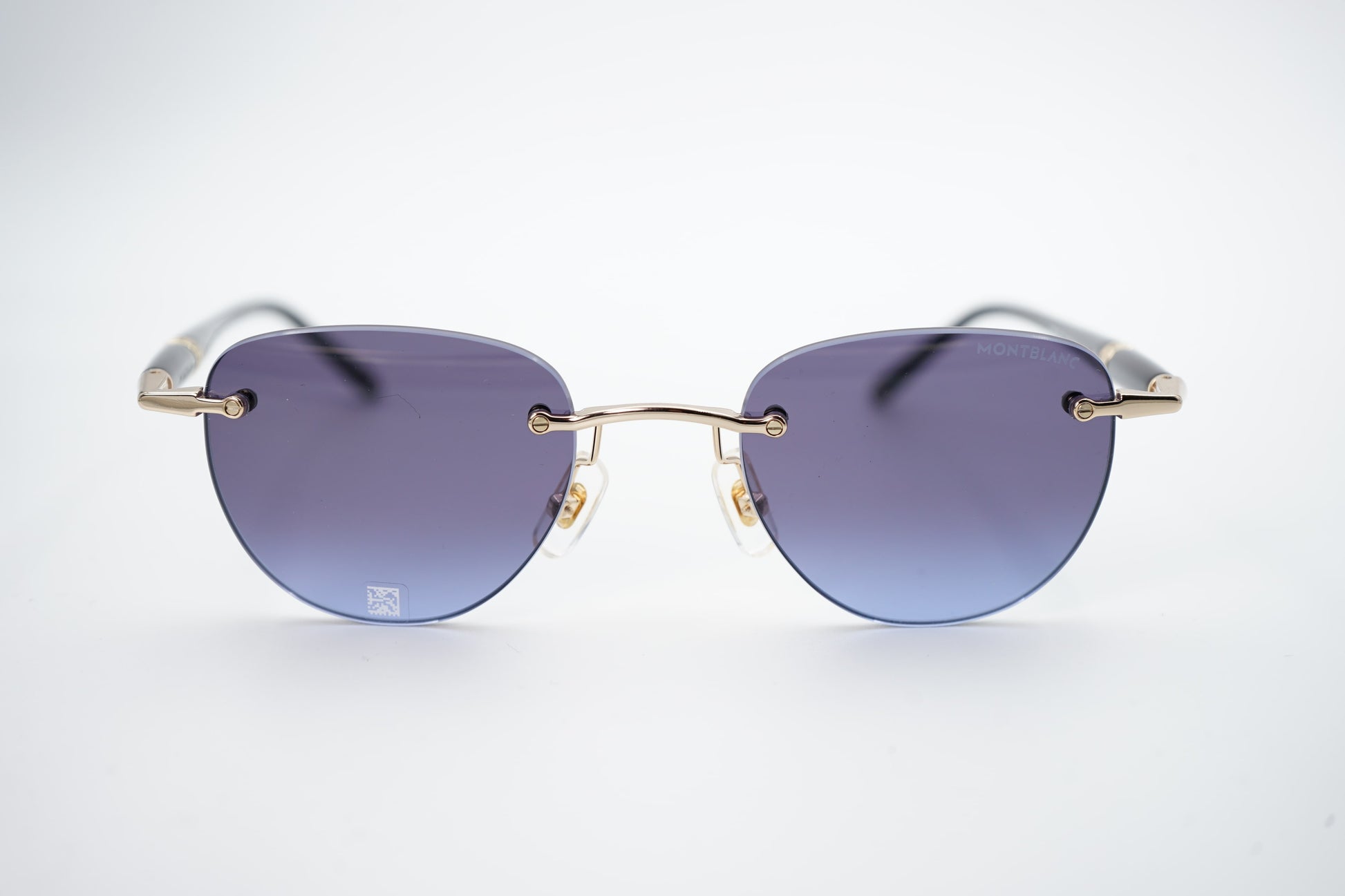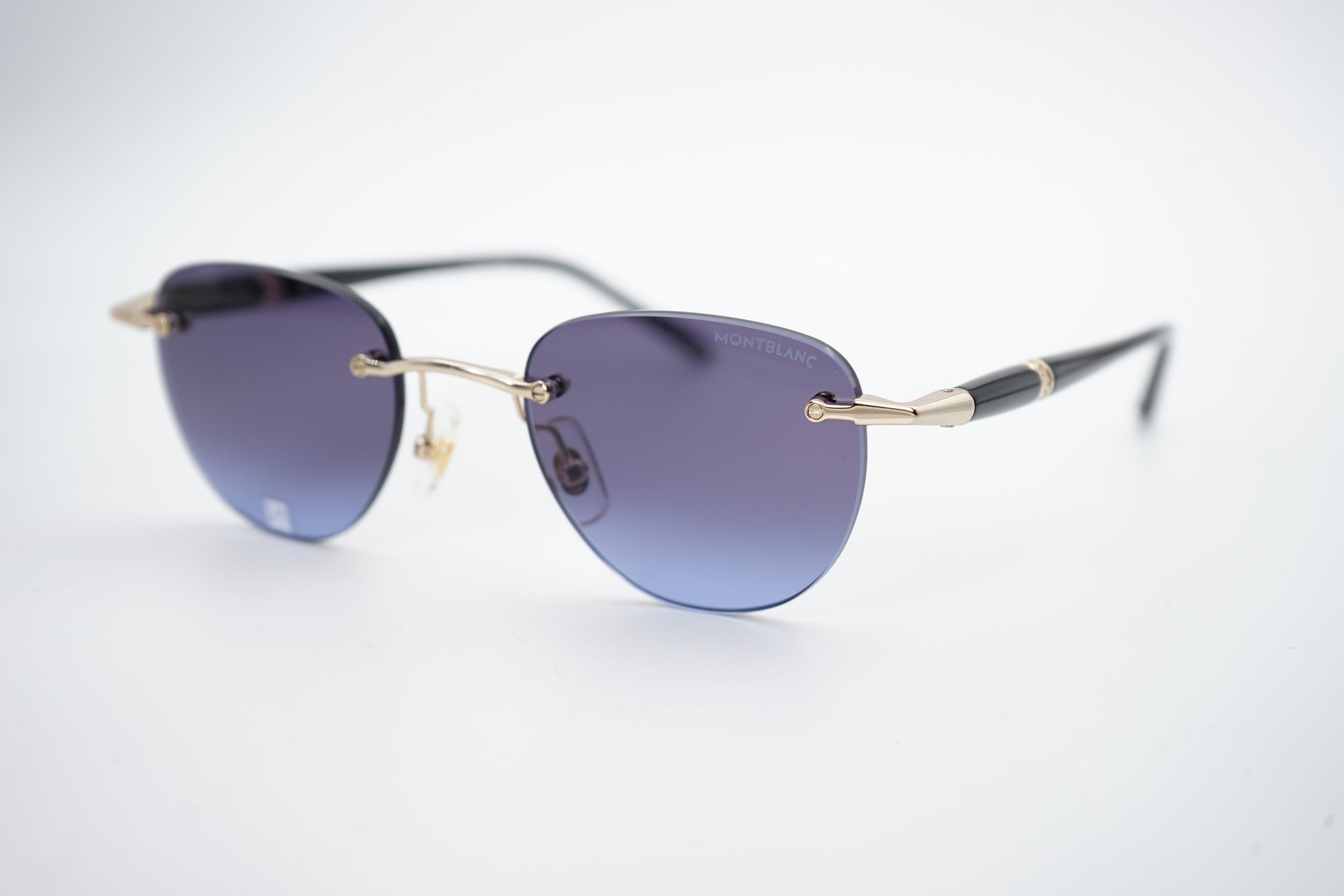 Os óculos de sol Montblanc 0412S 006 combinam sofisticação e leveza num design sem aro com lentes em degradê azul. A armação dourada contrasta elegantemente com as hastes pretas finas, criando um visual moderno e requintado. As lentes proporcionam proteção UV total e conforto visual excecional, ideais para quem aprecia luxo discreto e estilo contemporâneo.