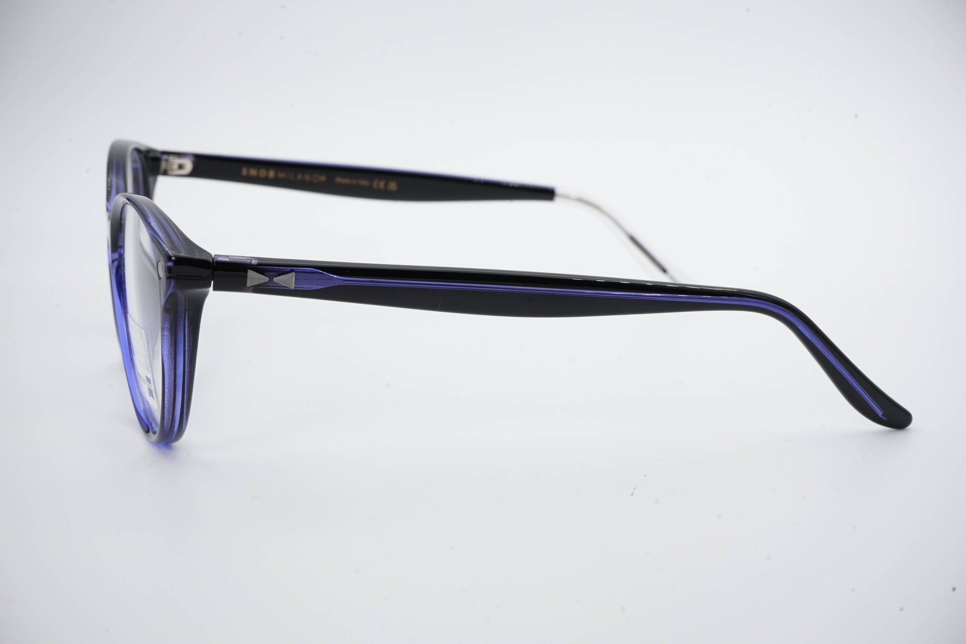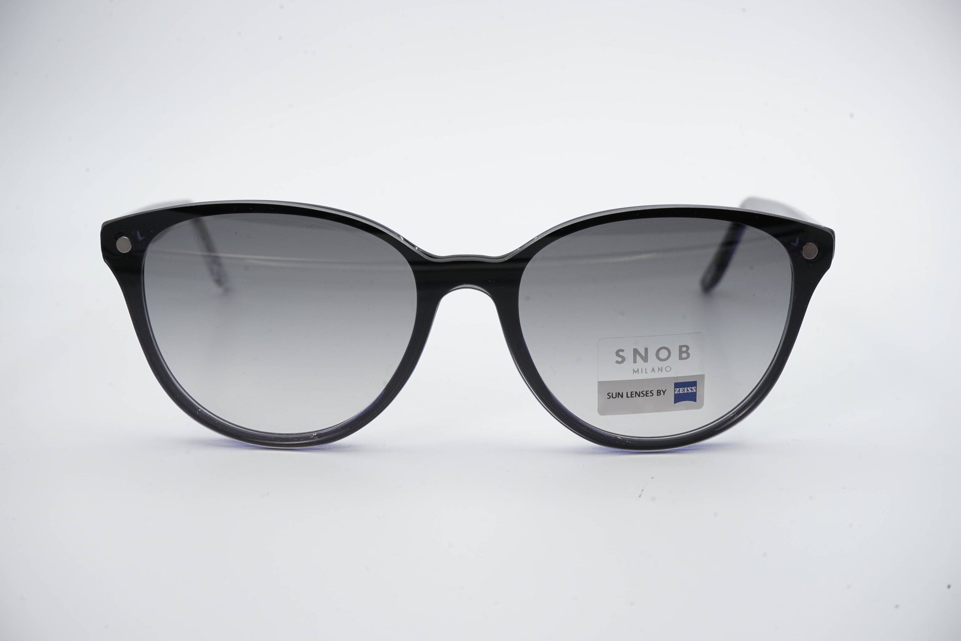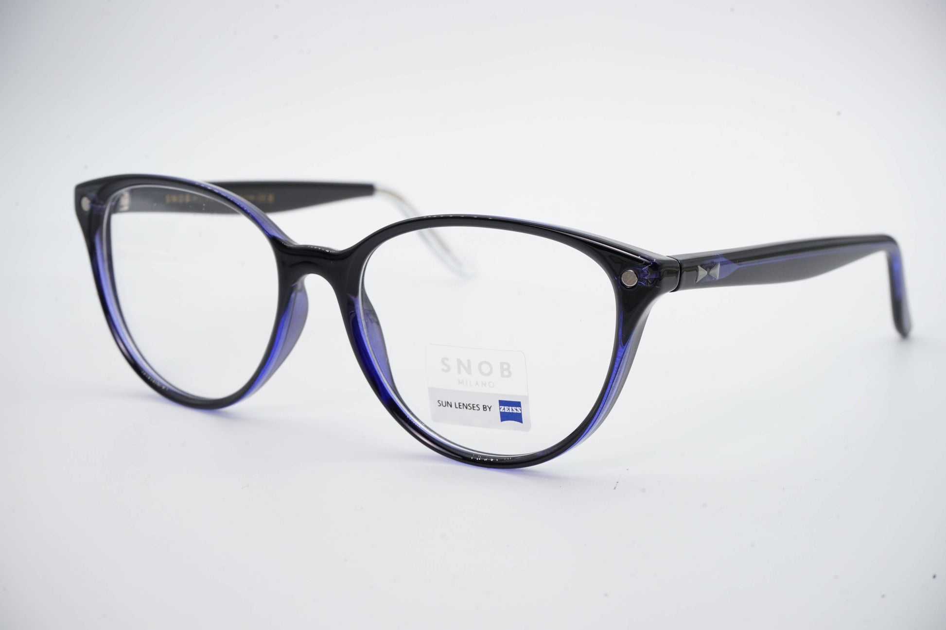 O Snob Milano Chicca SNV126 C12 apresenta uma silhueta feminina, suave e bem definida, com frente em acetato preto profundo enriquecido por reflexos azulados subtis no contorno interno. O formato arredondado confere leveza visual e elegância contemporânea, tornando o modelo versátil para uso diário com uma presença sofisticada e discreta.