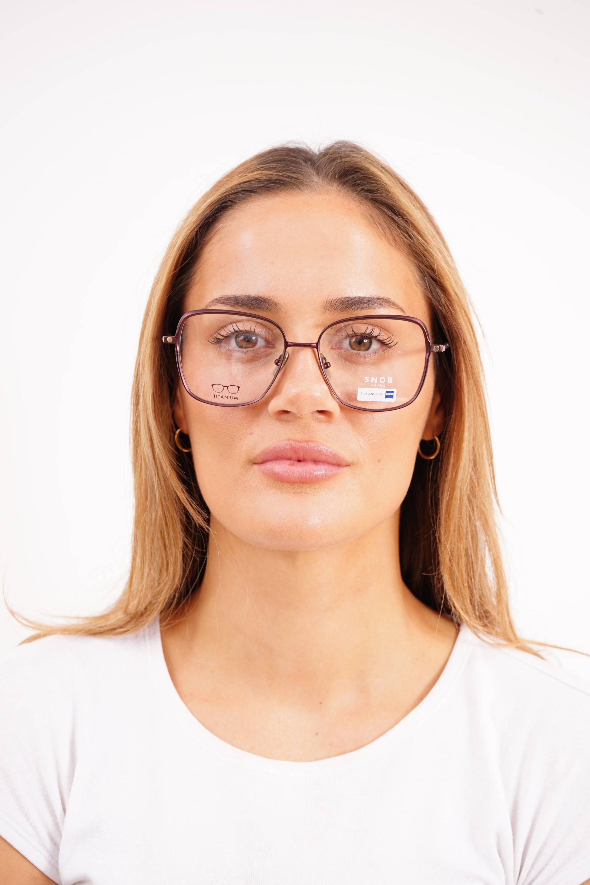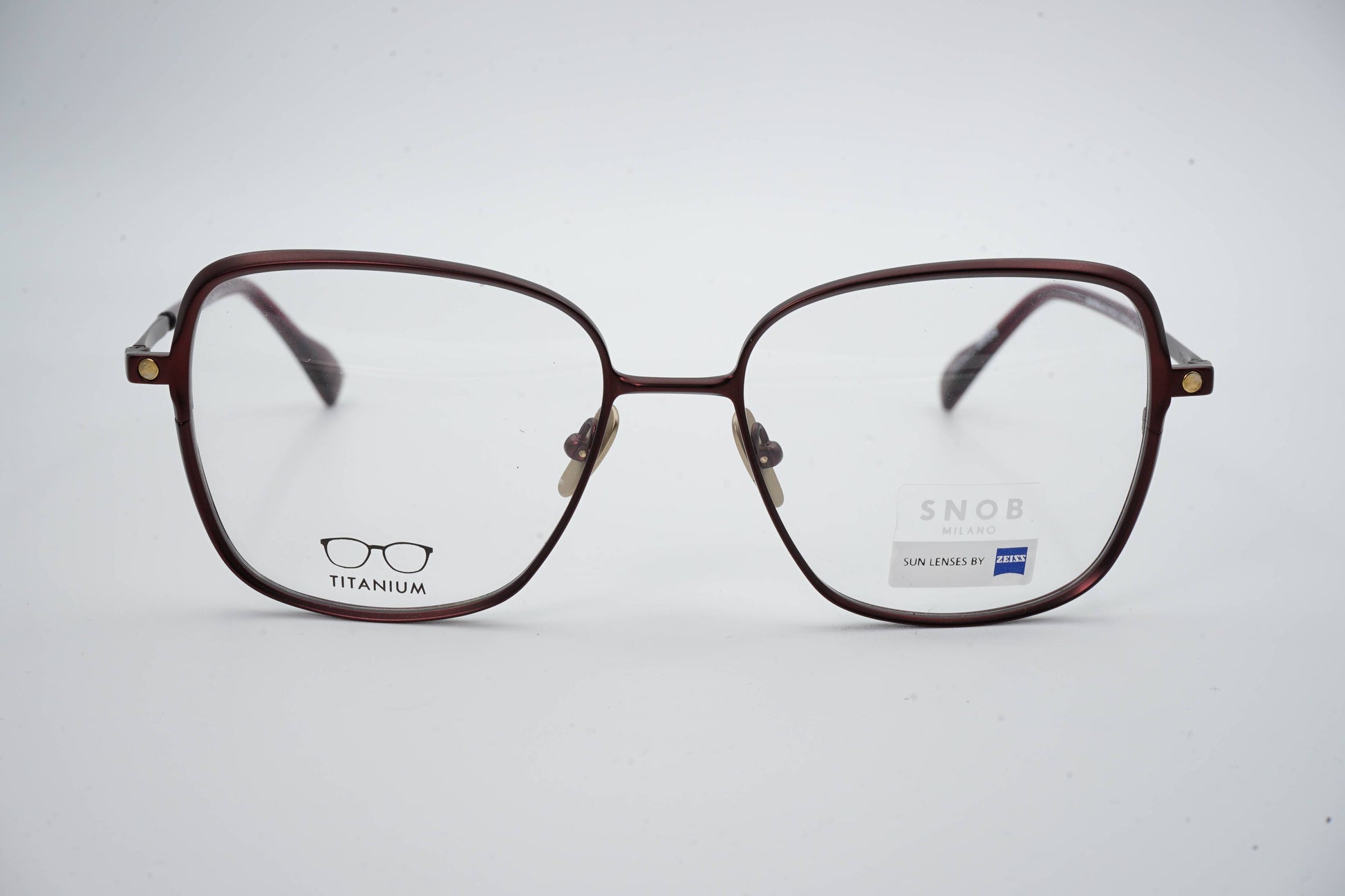 O Snob Milano Jadore SNV218T C03 apresenta uma interpretação elegante e contemporânea do design feminino, com uma frente metálica em tom bordeaux profundo que acrescenta carácter e sofisticação ao conjunto. O formato suavemente arredondado mantém proporções equilibradas, enquanto a construção em titânio garante leveza excecional, resistência estrutural e conforto contínuo no uso diário.