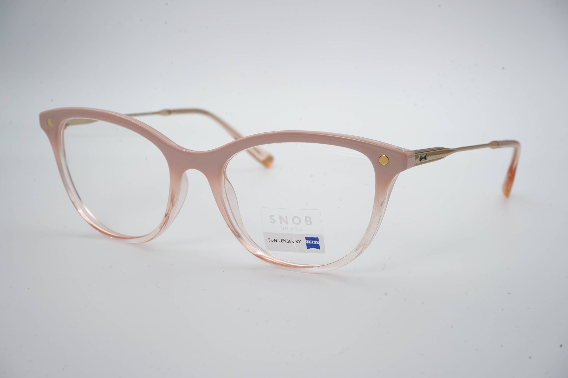 O Snob Milano Milf Biolux SNV194RT C05 apresenta uma combinação técnica de acetato translúcido rosa com hastes metálicas douradas, criando uma estética leve e elegante. O formato cat-eye reforça a expressão feminina, mantendo ergonomia e conforto no uso diário. O clip-on solar magnético, equipado com lentes Zeiss em tom castanho degradê, garante proteção visual de alto desempenho e uma transição imediata entre óculos optical e de sol.